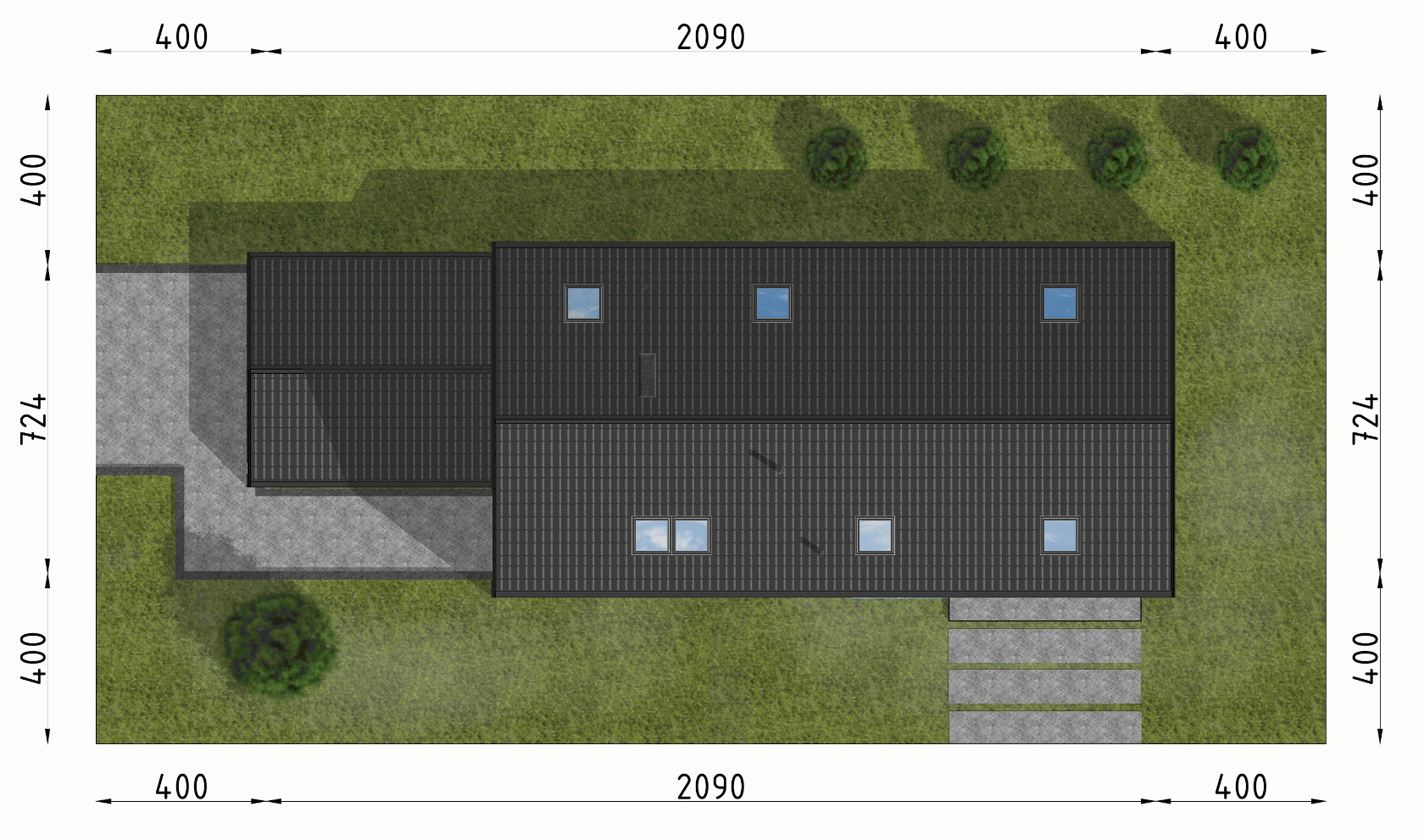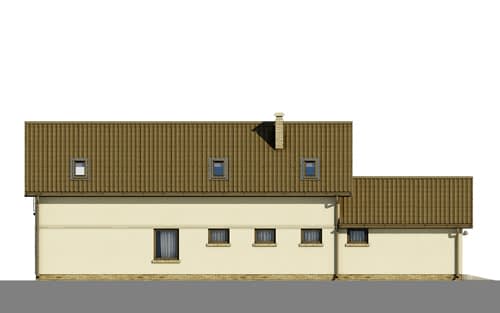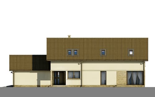 Dom parterowy z poddaszem użytkowym. Parter składa się z obszernego pokoju dziennego połączonego z otwartą jadalnią skąd przechodzimy do kuchni oraz z wyjściem na duży taras, gabinetu oraz łazienki i pomieszczenia gospodarczego oraz garażu. Schodami z pokoju dziennego dostajemy się na poddasze, na którym umiejscowione jeszcze dwie sypialnie, dwie łazienki oraz garderoba.Konstrukcja