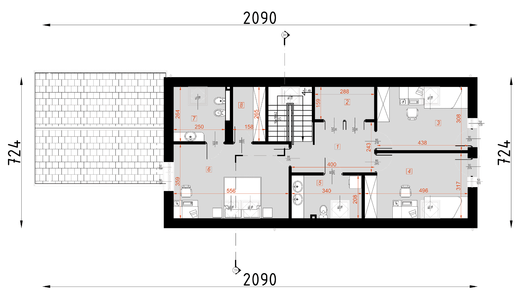 - rzuty wszystkich kondygnacji (np. parter, piwnica, piętro) – rozmieszczenie i wymiary wszystkich pomieszczeń, rozmieszczenie i wielkość otworów okiennych i drzwiowych, rozmieszczenie kominów, sugerowana aranżacja wnętrz.