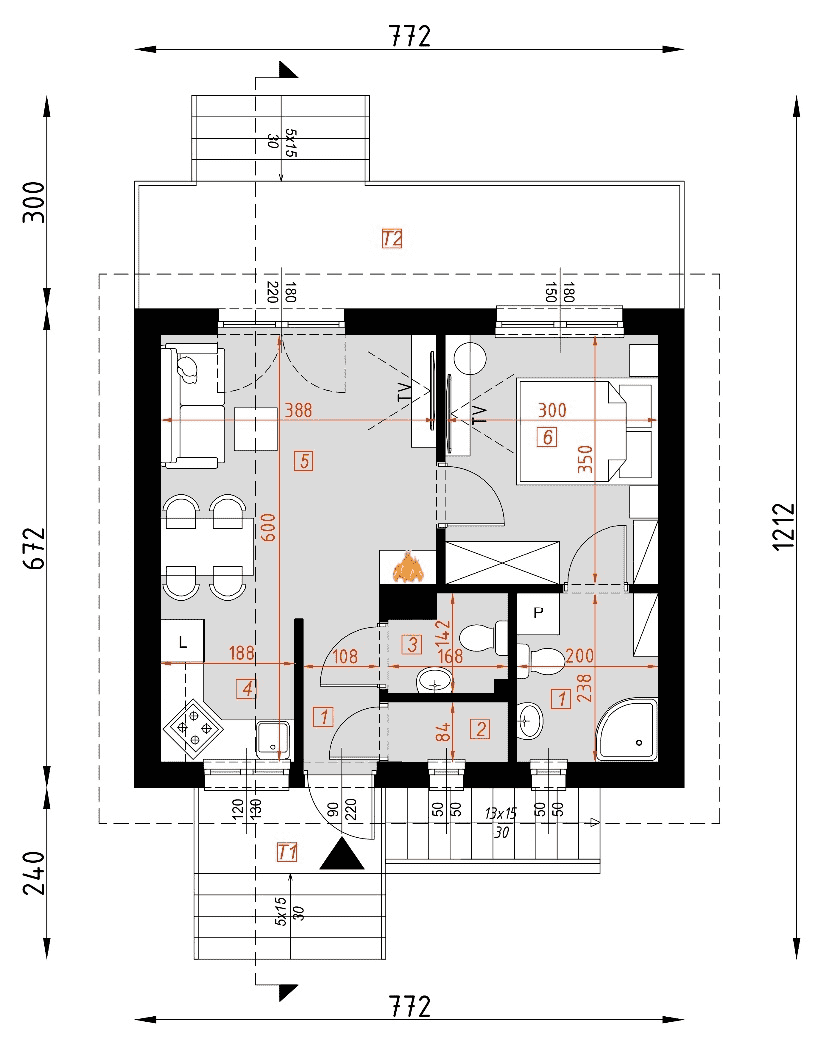 - rzuty wszystkich kondygnacji (np. parter, piwnica, piętro) – rozmieszczenie i wymiary wszystkich pomieszczeń, rozmieszczenie i wielkość otworów okiennych i drzwiowych, rozmieszczenie kominów, sugerowana aranżacja wnętrz.