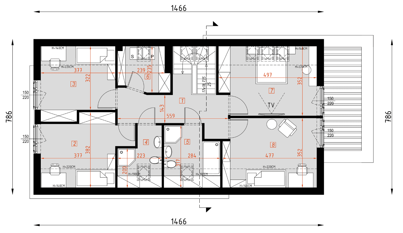 - rzuty wszystkich kondygnacji (np. parter, piwnica, piętro) – rozmieszczenie i wymiary wszystkich pomieszczeń, rozmieszczenie i wielkość otworów okiennych i drzwiowych, rozmieszczenie kominów, sugerowana aranżacja wnętrz.