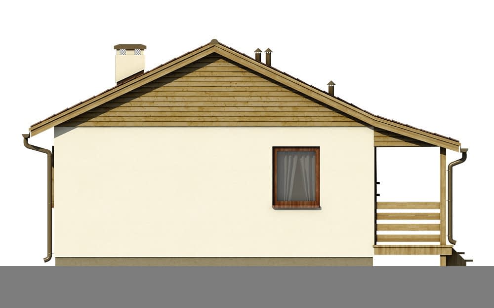 Dom mieszkalny, jednorodzinny, parterowy, 3 pokoje, kuchnia i łazienka, oraz duży zadaszony taras od strony wejściowej. Tani w budowie dom dla czteroosobowej rodziny. Układ funkcjonalny domu: Do domu wchodzimy poprzez duży taras mogący pełnić przeróżne funkcje. Następnie przez małą sień przechodzimy do hallu połączonego z salonem. W hallu znajduje się duża szafa pełniąca funkcje garderoby. Obszerna kuchnia również połączona jest z salonem. Dalej wchodzimy do korytarza, z którego dostać się możemy do trzech sypialni i obszernej łazienki.Konstrukcja