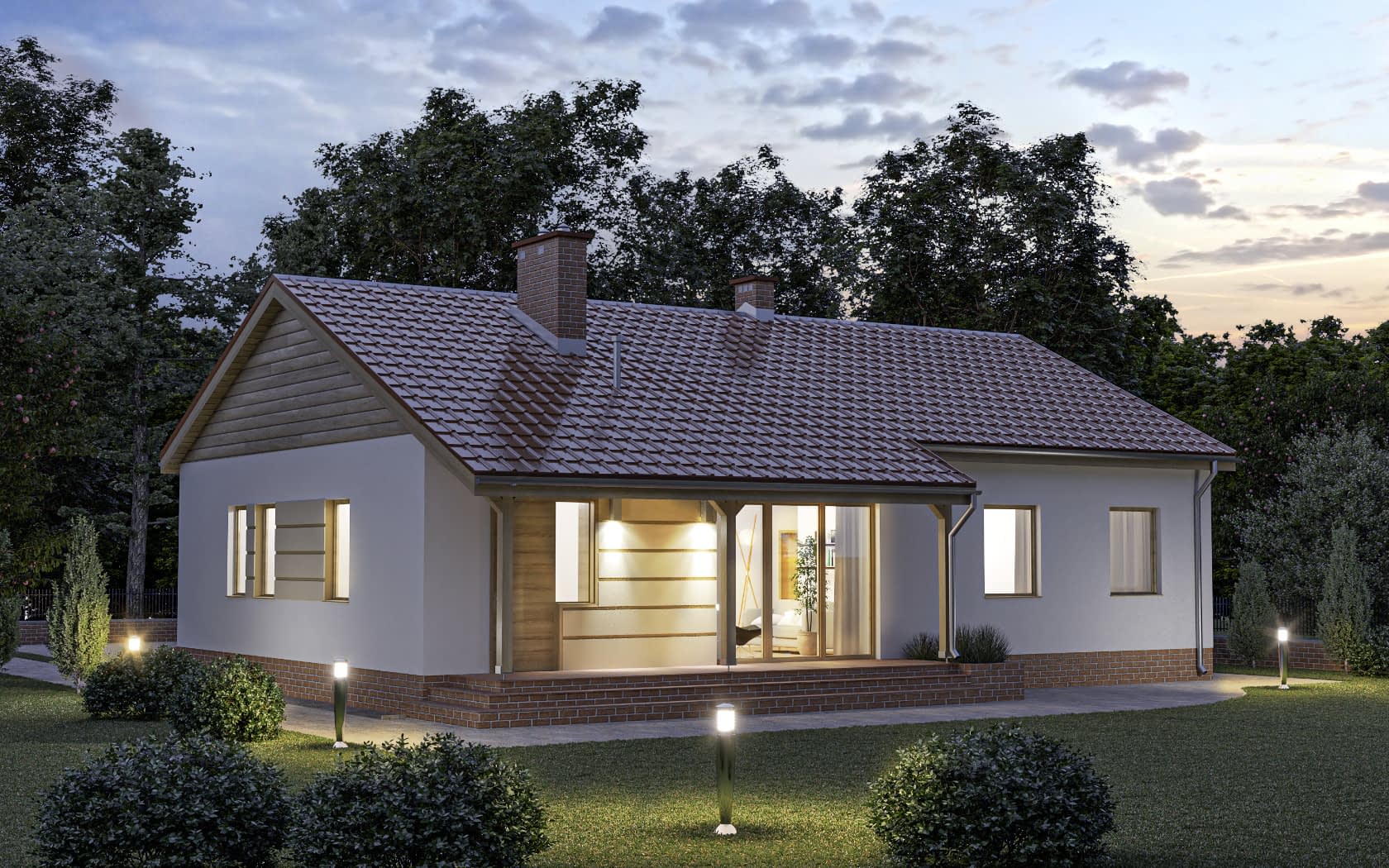 - elewacje (frontowa, dwie elewacje boczne, ogrodowa) – dokładny wygląd domu z każdej strony.