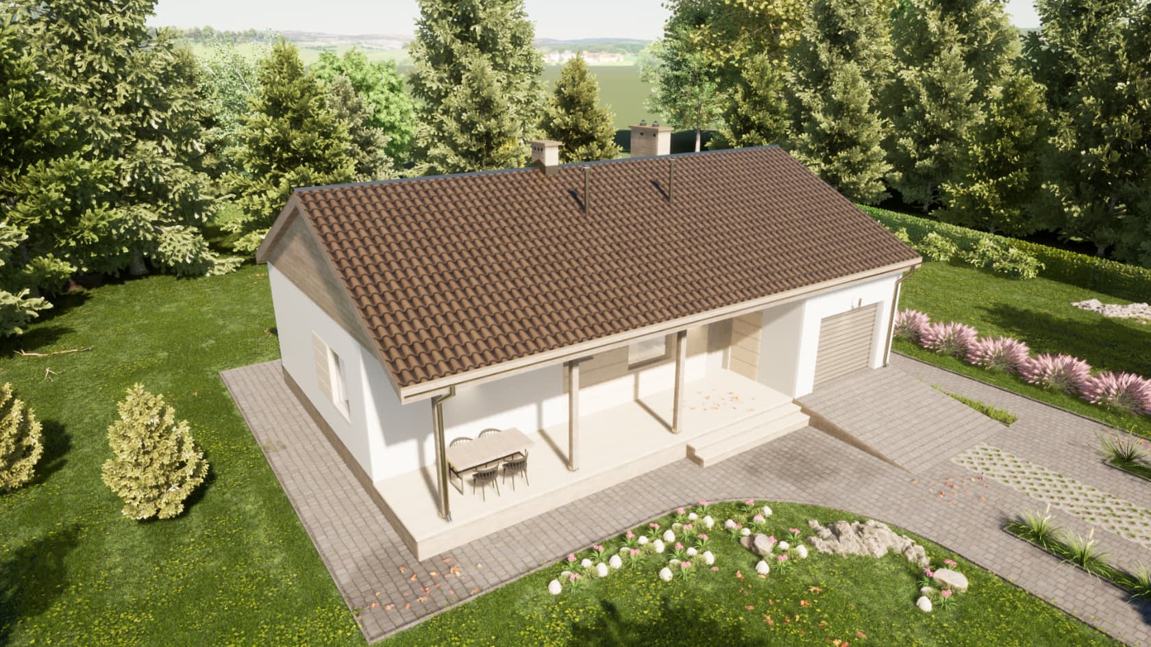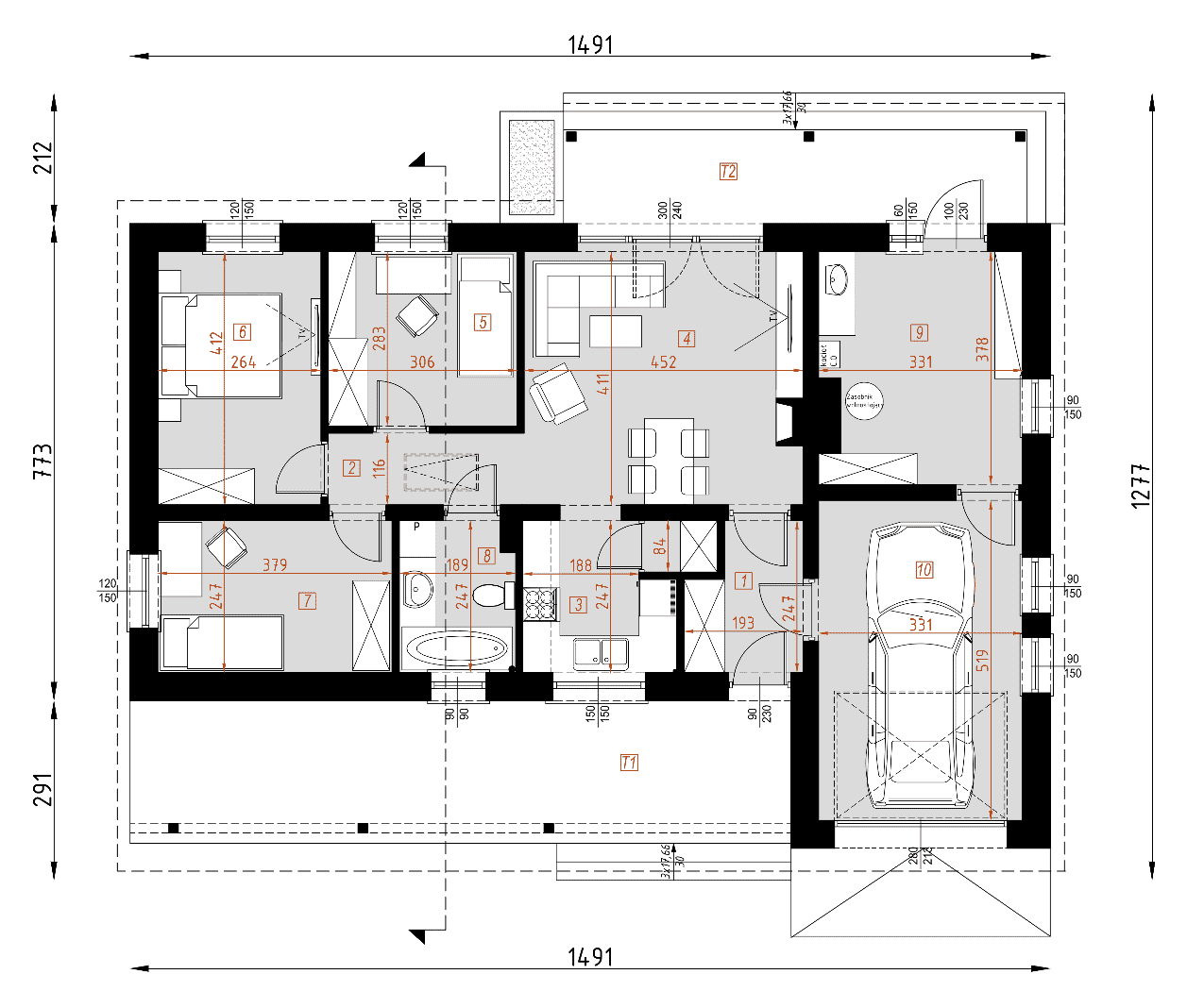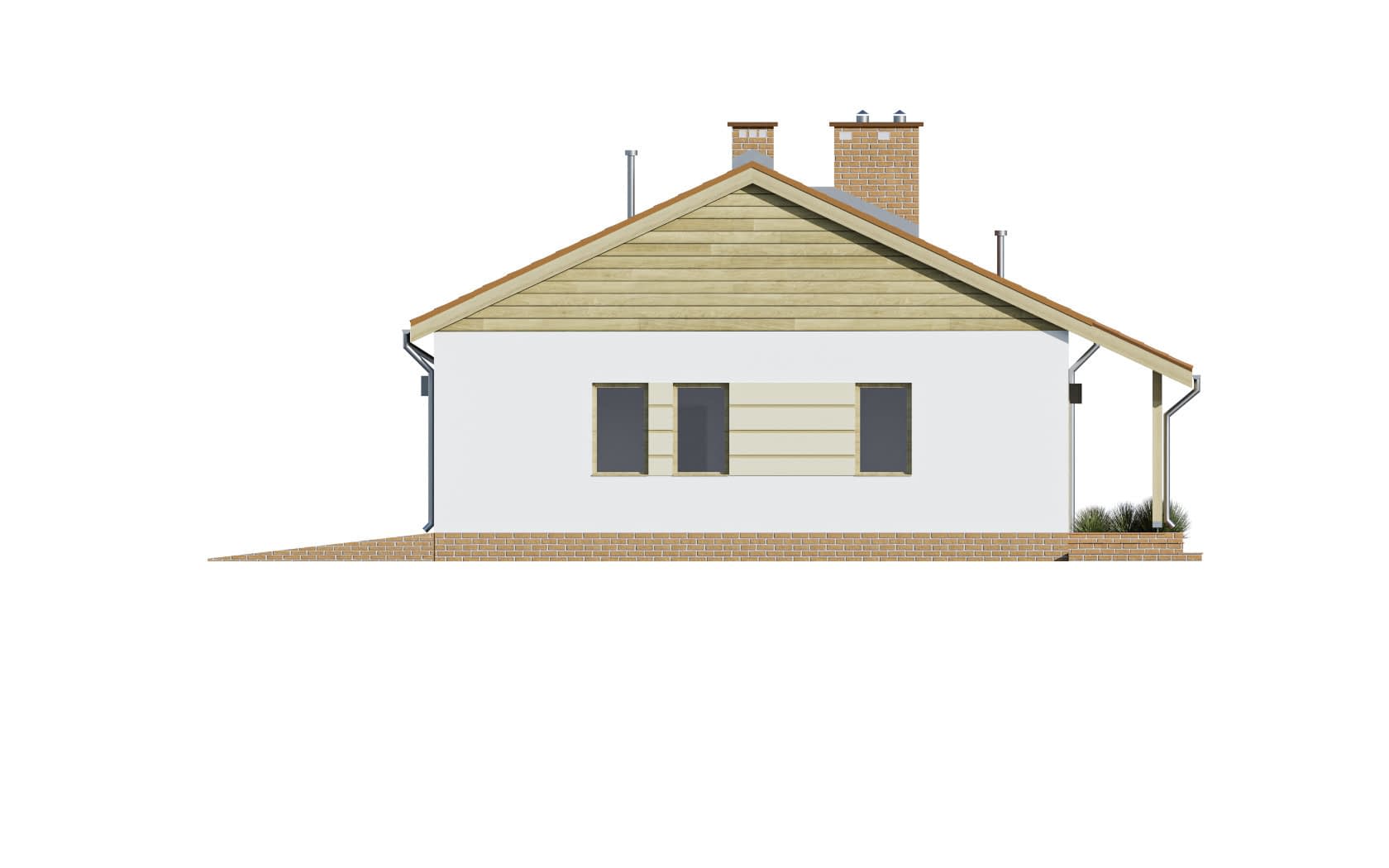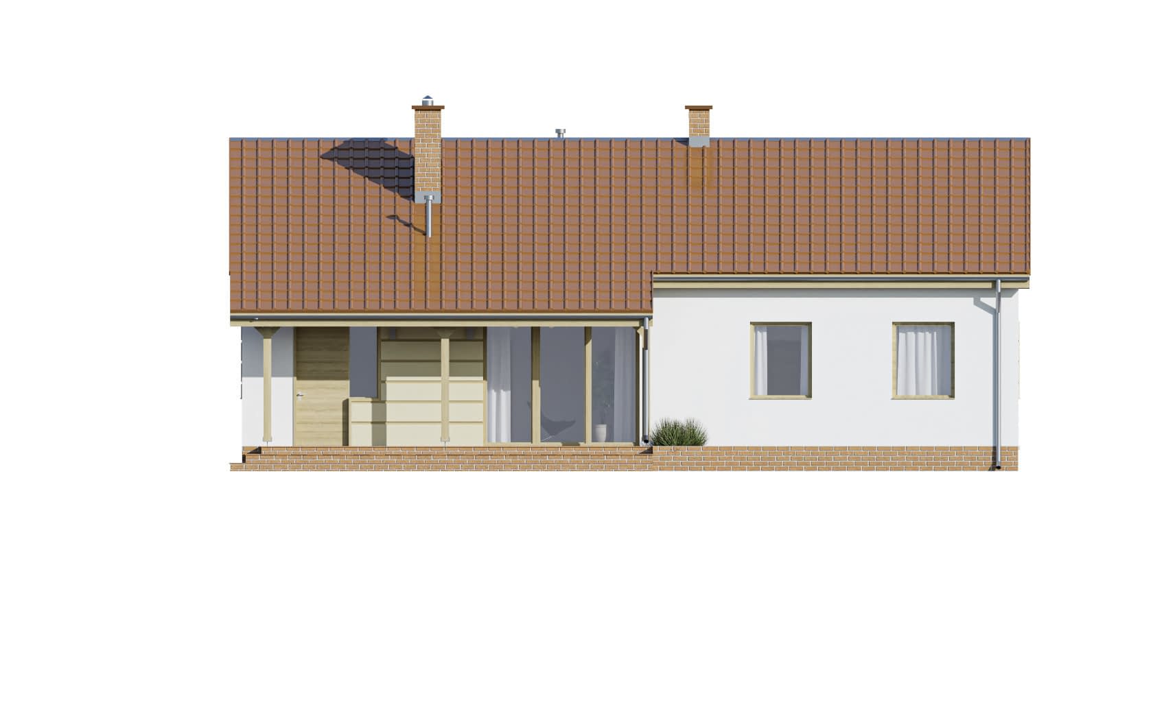 Dom mieszkalny, jednorodzinny, parterowy, 3 pokoje, kuchnia i łazienka, oraz duży zadaszony taras od strony wejściowej. Tani w budowie dom w technologii tradycyjnej dla czteroosobowej rodziny. Układ funkcjonalny domu: Do domu wchodzimy poprzez duży taras mogący pełnić przeróżne funkcje. Następnie przez małą sień przechodzimy do hallu połączonego z salonem. W hallu znajduje się duża szafa pełniąca funkcje garderoby. Obszerna kuchnia również połączona jest z salonem. Dalej wchodzimy do korytarza, z którego dostać się możemy do trzech sypialni i obszernej łazienki. Dom posiada jednostanowiskowy garaż oraz kotłownię na paliwo stałe. Dom ten jest również świetnym wyborem na dom letniskowy.Konstrukcja