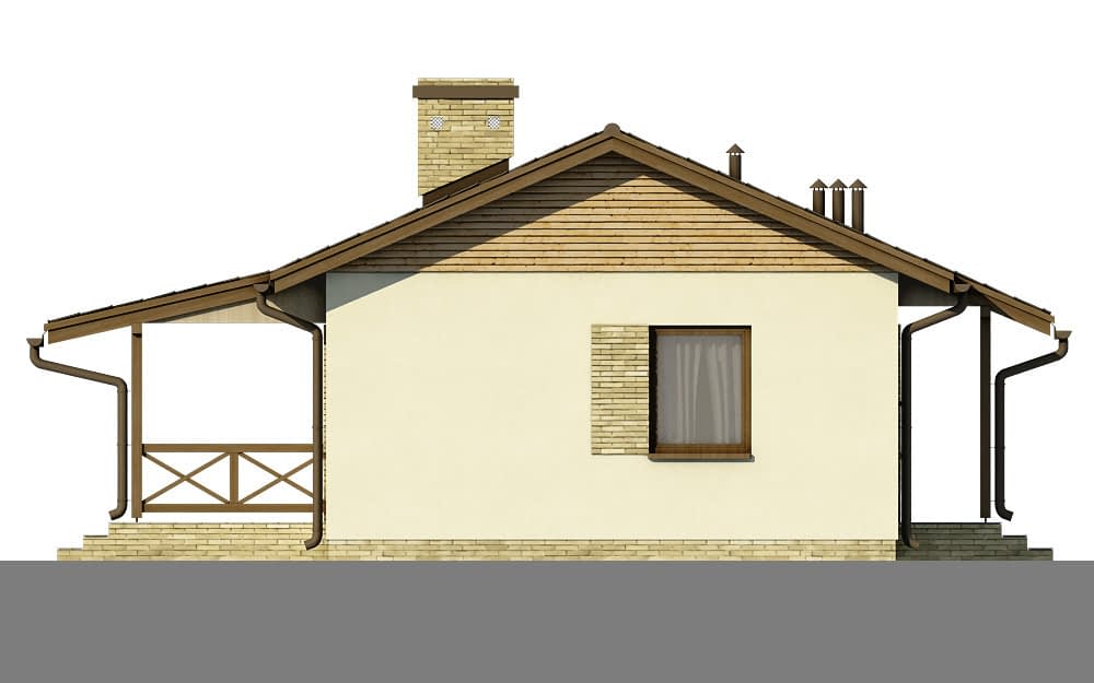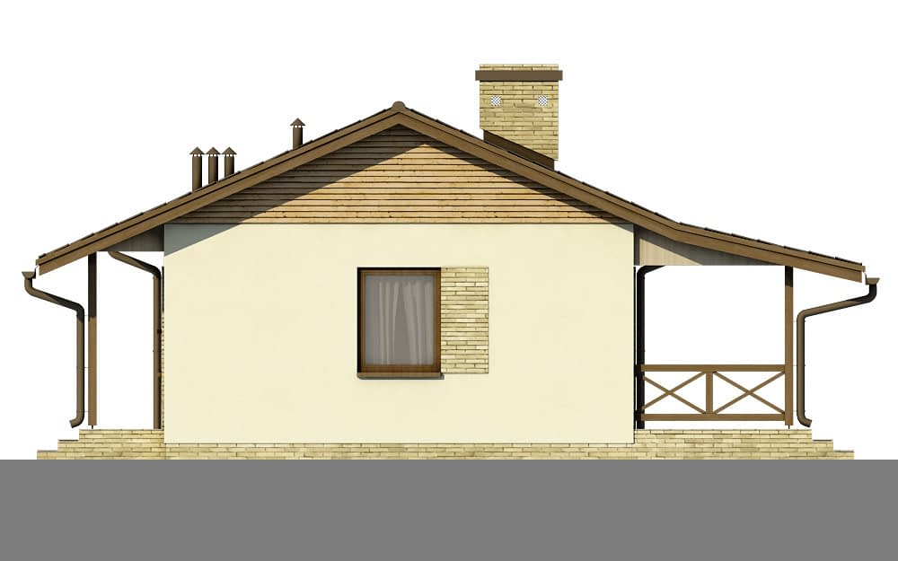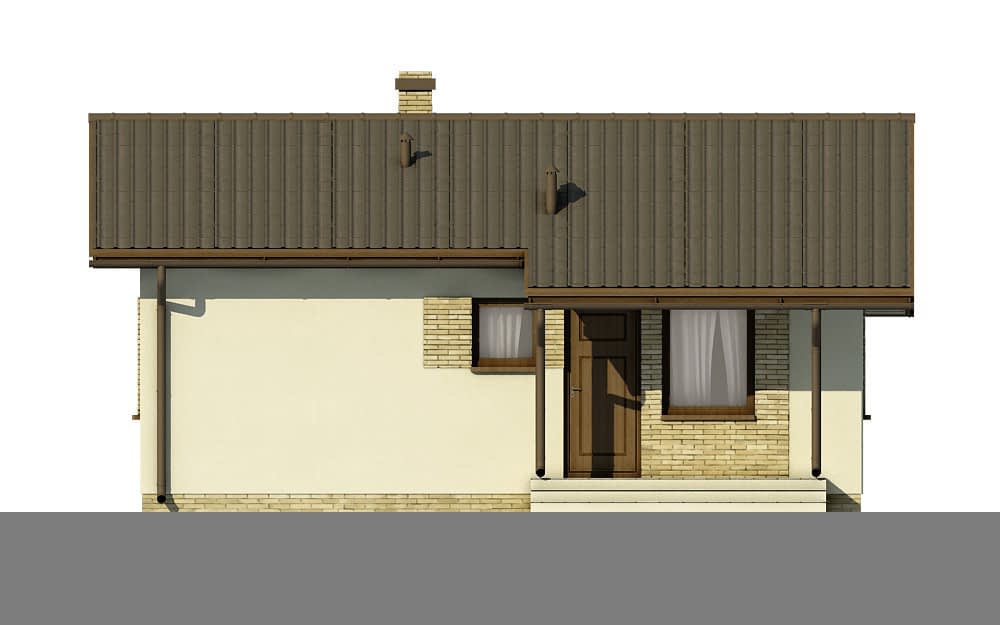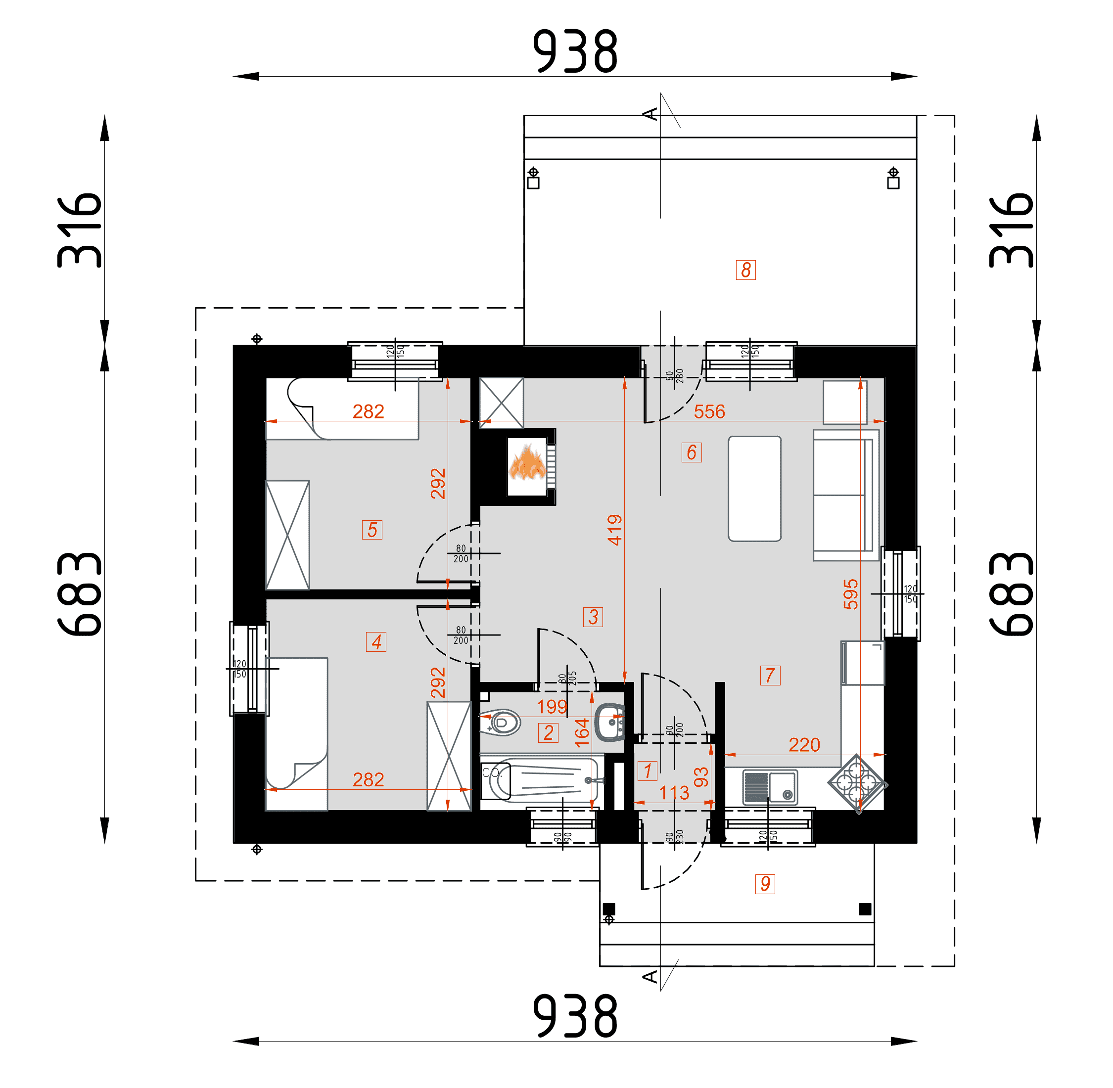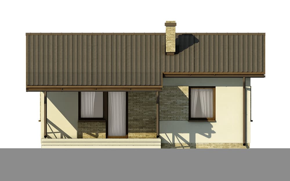 Budynek jednorodzinny, parterowy. Z sieni dostajemy się do obszernego pokoju dziennego, w którym znajduje się kominek oraz wyjście na duży i zadaszony taras. Pokój ten jest także bezpośrednio połączony z kuchnią. Po lewej stronie od wejścia znajduje sie strefa nocna, w której skład wchodzą dwa pokoje sypialne i łazienka.Konstrukcja