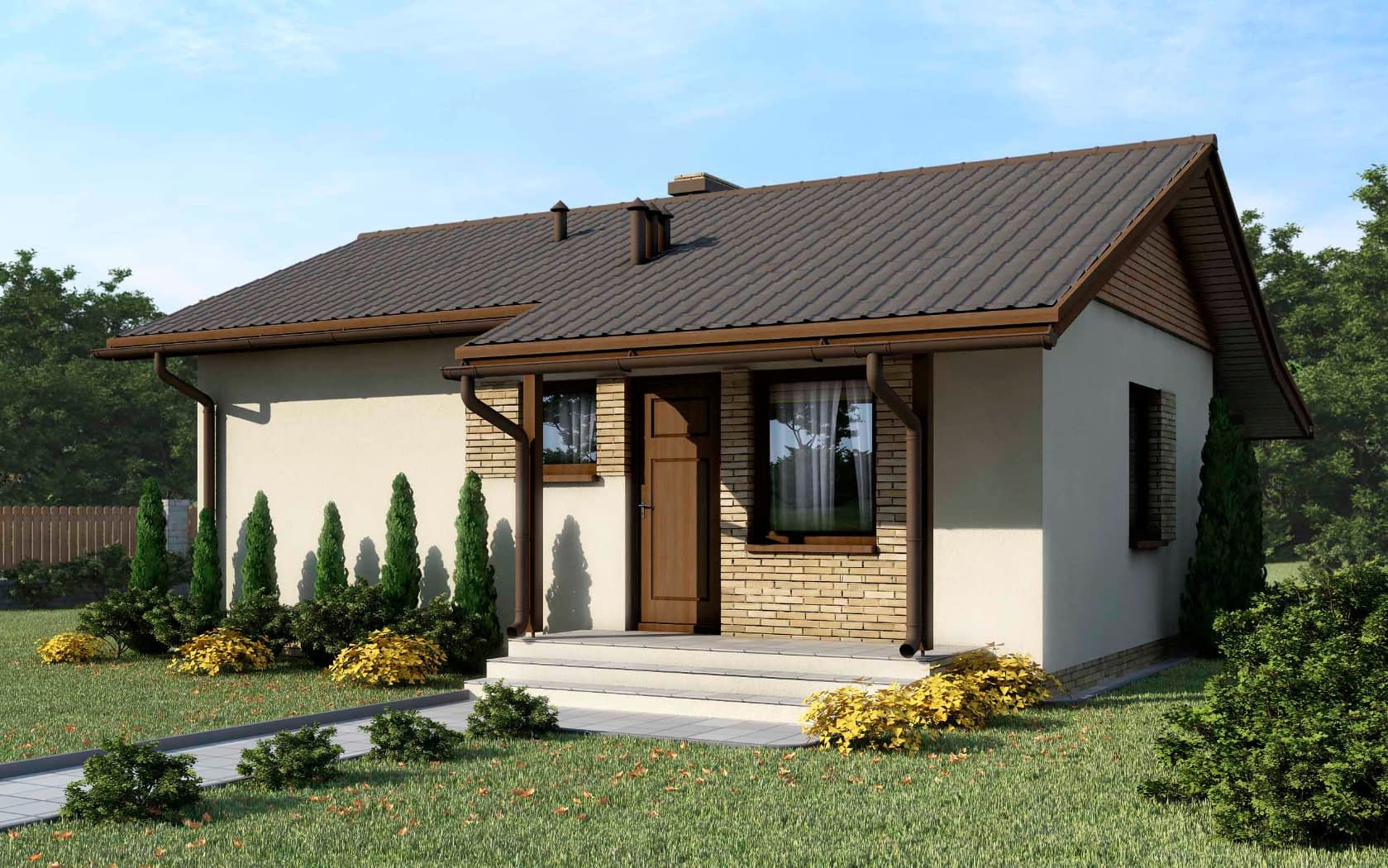 - elewacje (frontowa, dwie elewacje boczne, ogrodowa) – dokładny wygląd domu z każdej strony.