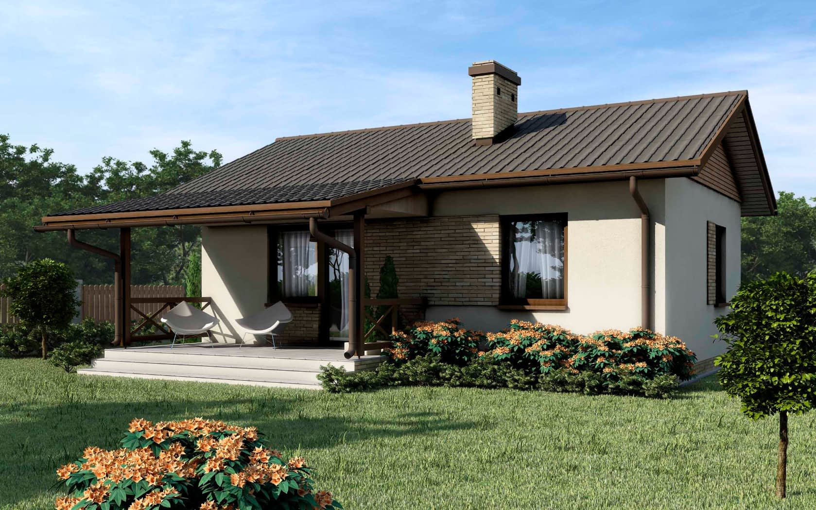 Budynek jednorodzinny, parterowy. Z sieni dostajemy się do obszernego pokoju dziennego, w którym znajduje się kominek oraz wyjście na duży i zadaszony taras. Pokój ten jest także bezpośrednio połączony z kuchnią. Po lewej stronie od wejścia znajduje sie strefa nocna, w której skład wchodzą dwa pokoje sypialne i łazienka.Konstrukcja