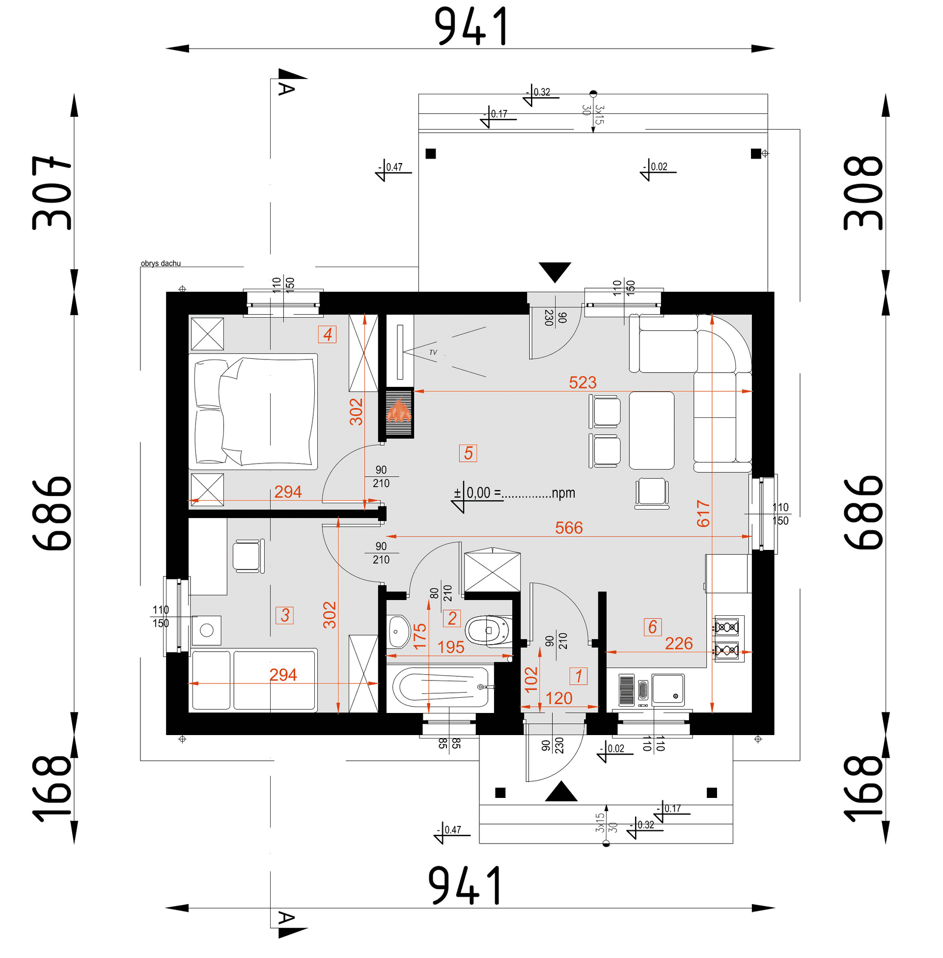 - rzut dachu – wymiary dachu, kąt nachylenia wszystkich połaci dachu, rozmieszczenie okien połaciowych, lukarn, kominów.