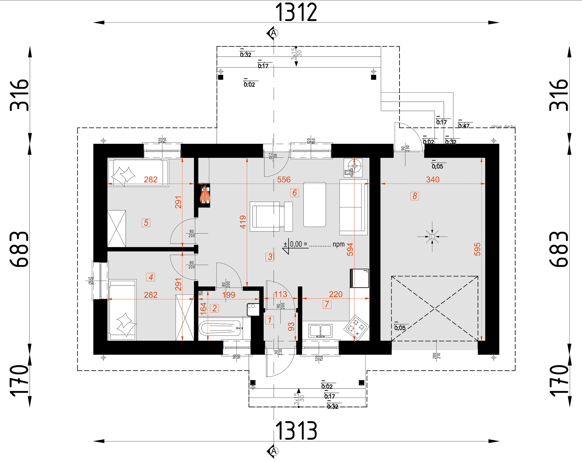 - rzut dachu – wymiary dachu, kąt nachylenia wszystkich połaci dachu, rozmieszczenie okien połaciowych, lukarn, kominów.