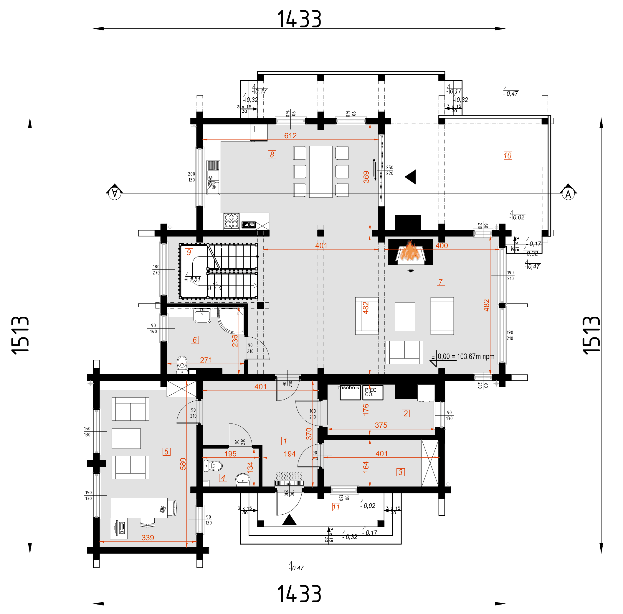 - rzuty wszystkich kondygnacji (np. parter, piwnica, piętro) – rozmieszczenie i wymiary wszystkich pomieszczeń, rozmieszczenie i wielkość otworów okiennych i drzwiowych, rozmieszczenie kominów, sugerowana aranżacja wnętrz.