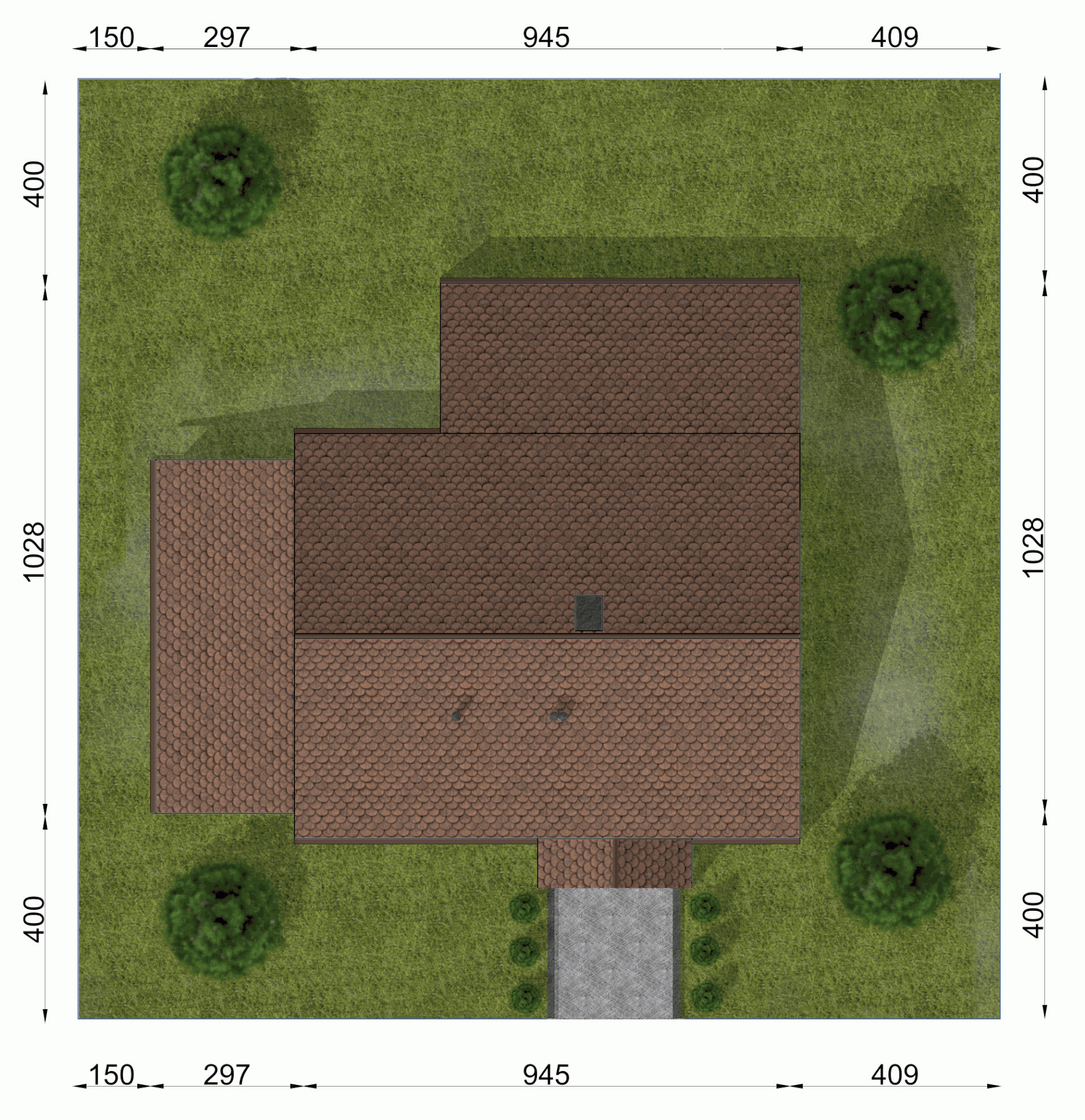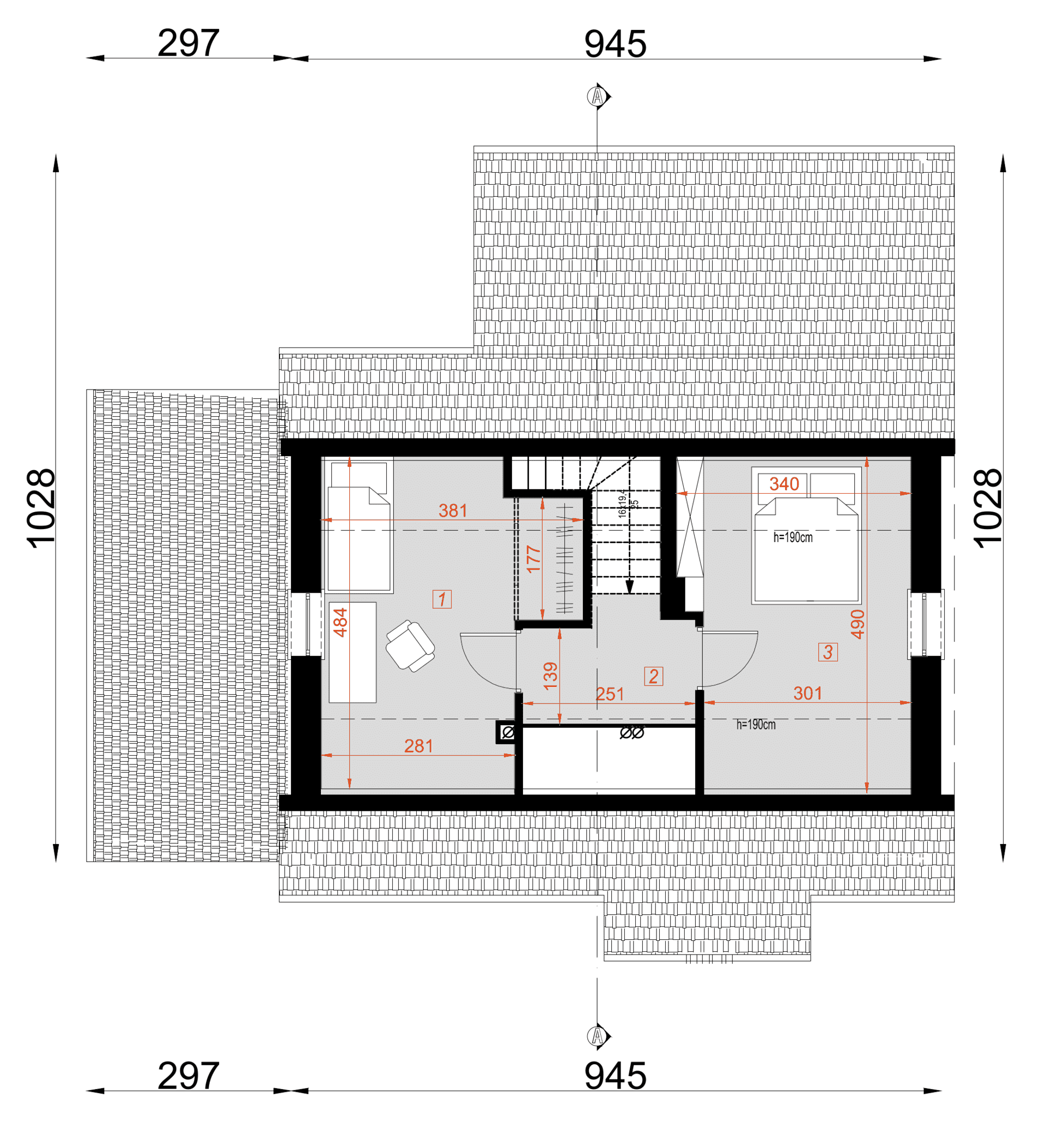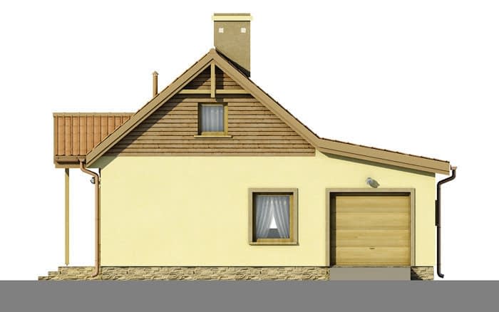Dom parterowy z poddaszem użytkowym. Parter składa się z obszernego pokoju dziennego połączonego z otwartą kuchnia oraz z wyjściem na duży taras, dwóch sypialni oraz łazienki i pomieszczenia gospodarczego i garażu. Schodami z pokoju dziennego dostajemy się na poddasze, na którym umiejscowione jeszcze dwie sypialnie.Konstrukcja
