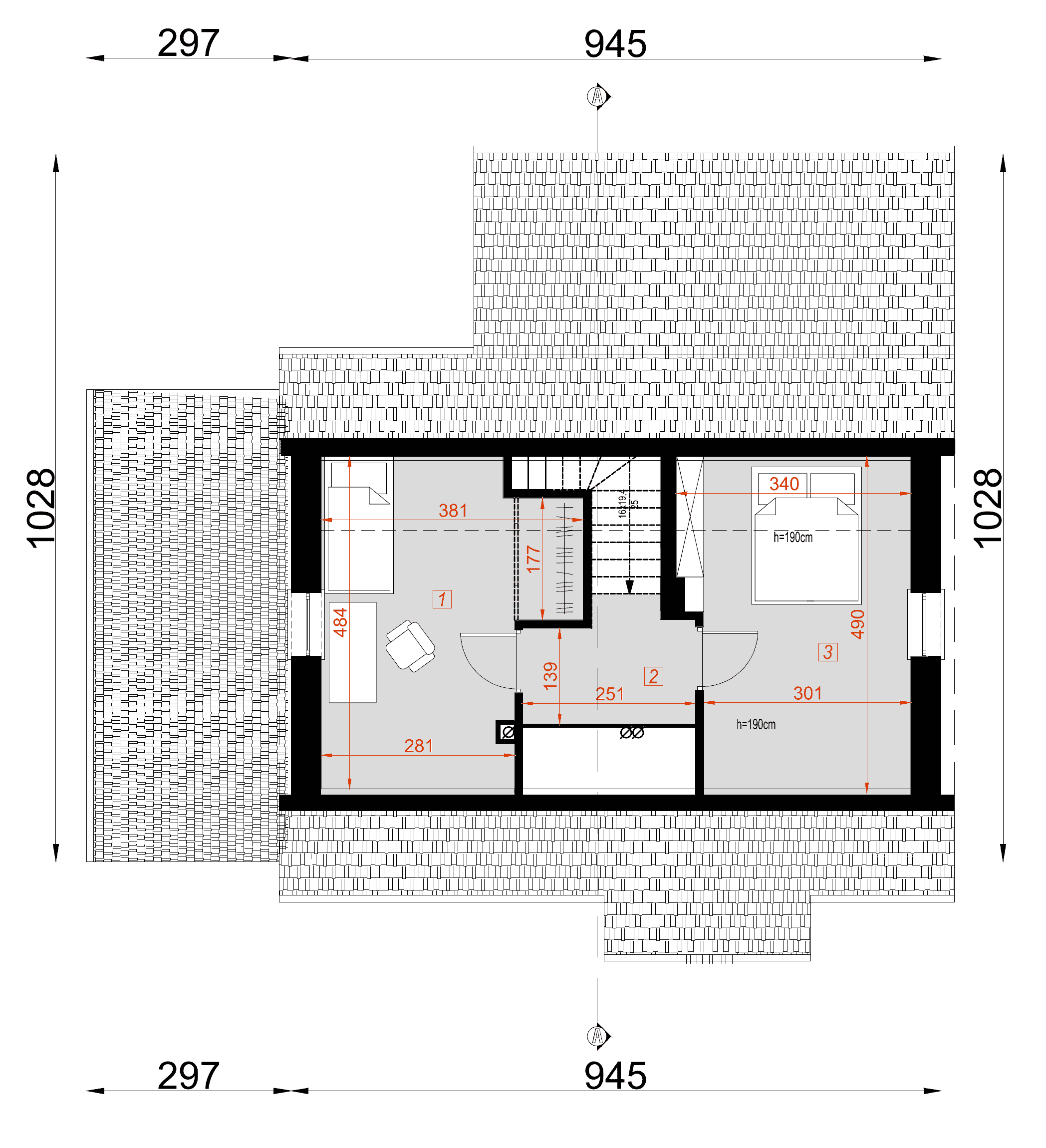 - rzut dachu – wymiary dachu, kąt nachylenia wszystkich połaci dachu, rozmieszczenie okien połaciowych, lukarn, kominów.