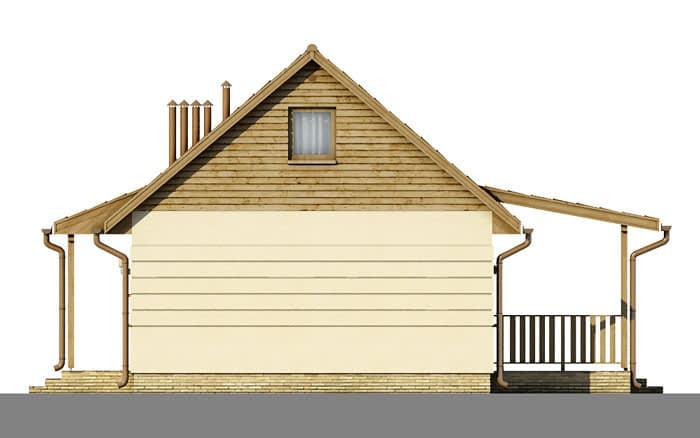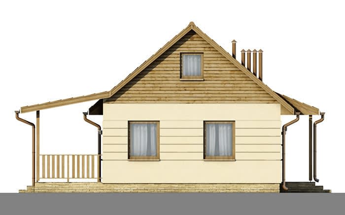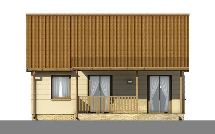 Dom mieszkalny jednorodzinny, wolno stojący, z poddaszem, nie podpiwniczony. Z zadaszonym tarasem. Po wejściu do domu, poprzez małą sień, w której umieszczone jest również wejście do pomieszczenia technicznego, dostajemy się do hallu, z niego zaś dostępne są wszystkie inne pomieszczenia: trzy pokoje, łazienka, kuchnia i aneks jadalny. W domu występuje wyraźny podział na strefę dzienna i nocną. Na poddasze dostać się możemy po składanych schodach umieszczonych w pomieszczeniu jadalnianym.Konstrukcja