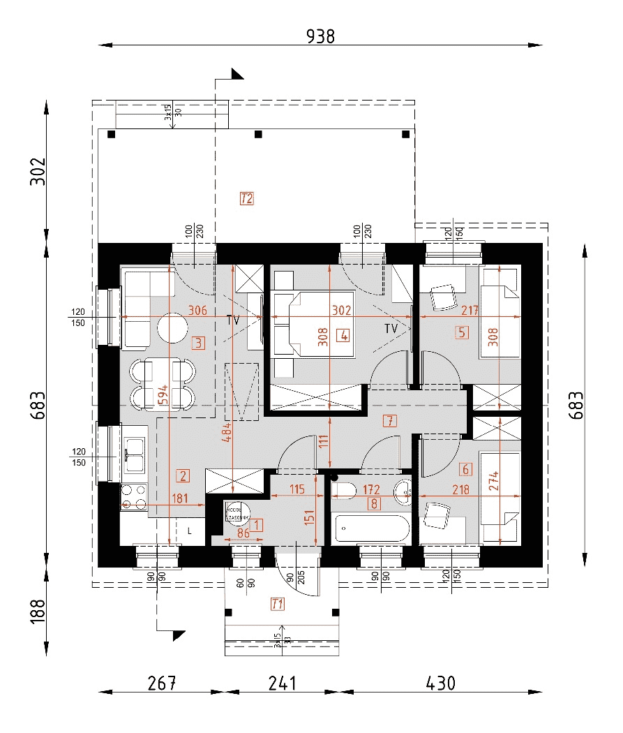 - rzuty wszystkich kondygnacji (np. parter, piwnica, piętro) – rozmieszczenie i wymiary wszystkich pomieszczeń, rozmieszczenie i wielkość otworów okiennych i drzwiowych, rozmieszczenie kominów, sugerowana aranżacja wnętrz.