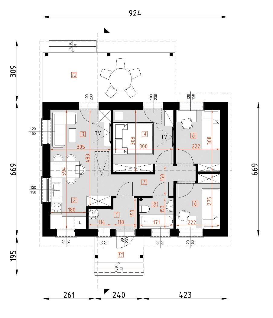 - rzuty wszystkich kondygnacji (np. parter, piwnica, piętro) – rozmieszczenie i wymiary wszystkich pomieszczeń, rozmieszczenie i wielkość otworów okiennych i drzwiowych, rozmieszczenie kominów, sugerowana aranżacja wnętrz.