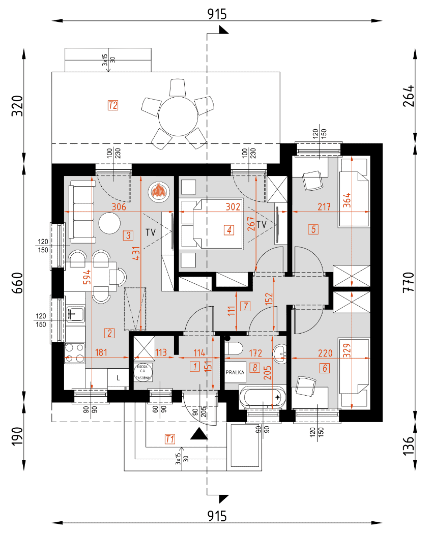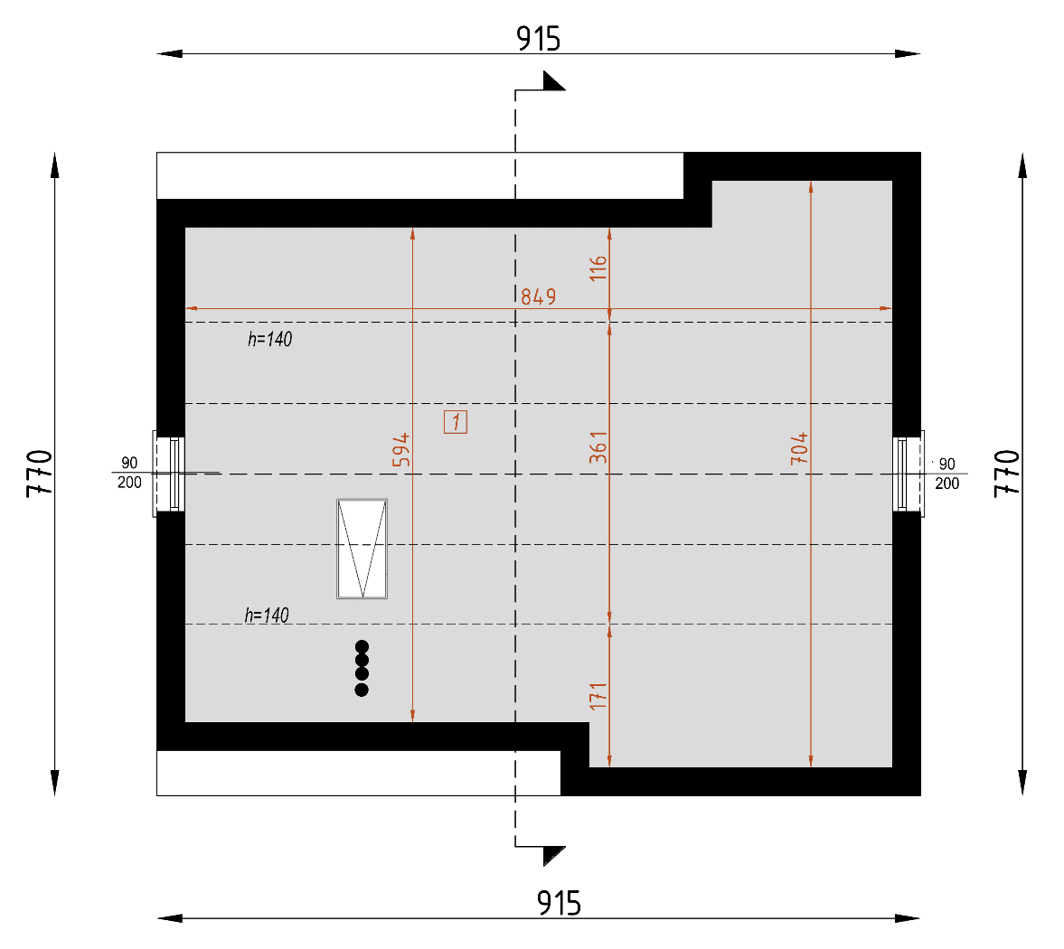 - rzuty wszystkich kondygnacji (np. parter, piwnica, piętro) – rozmieszczenie i wymiary wszystkich pomieszczeń, rozmieszczenie i wielkość otworów okiennych i drzwiowych, rozmieszczenie kominów, sugerowana aranżacja wnętrz.