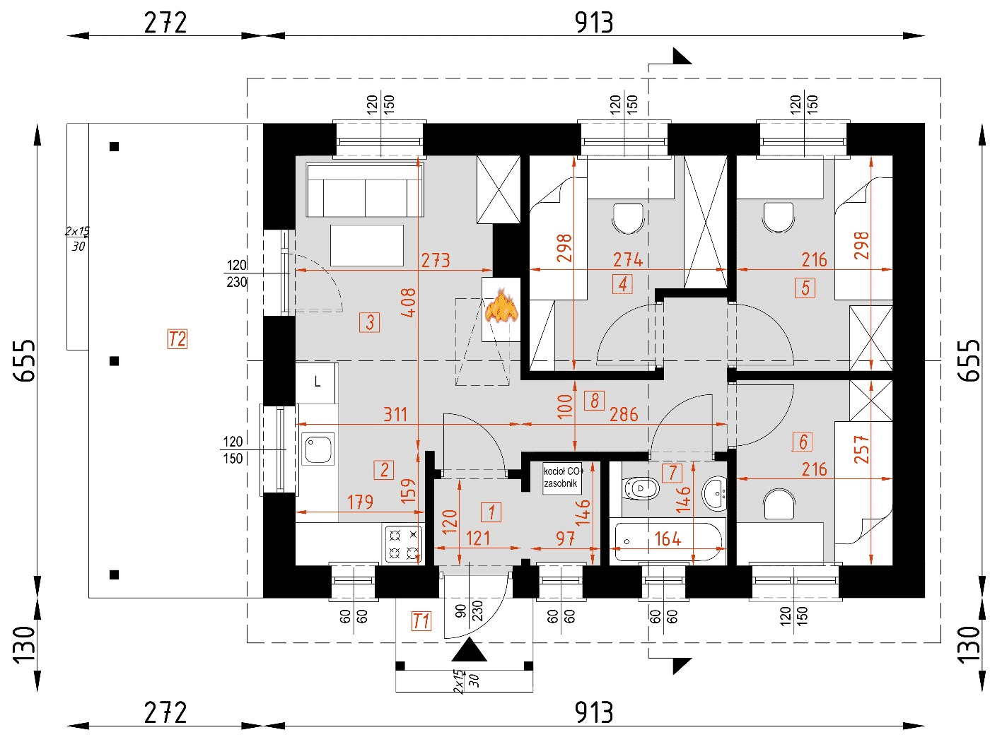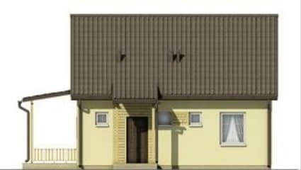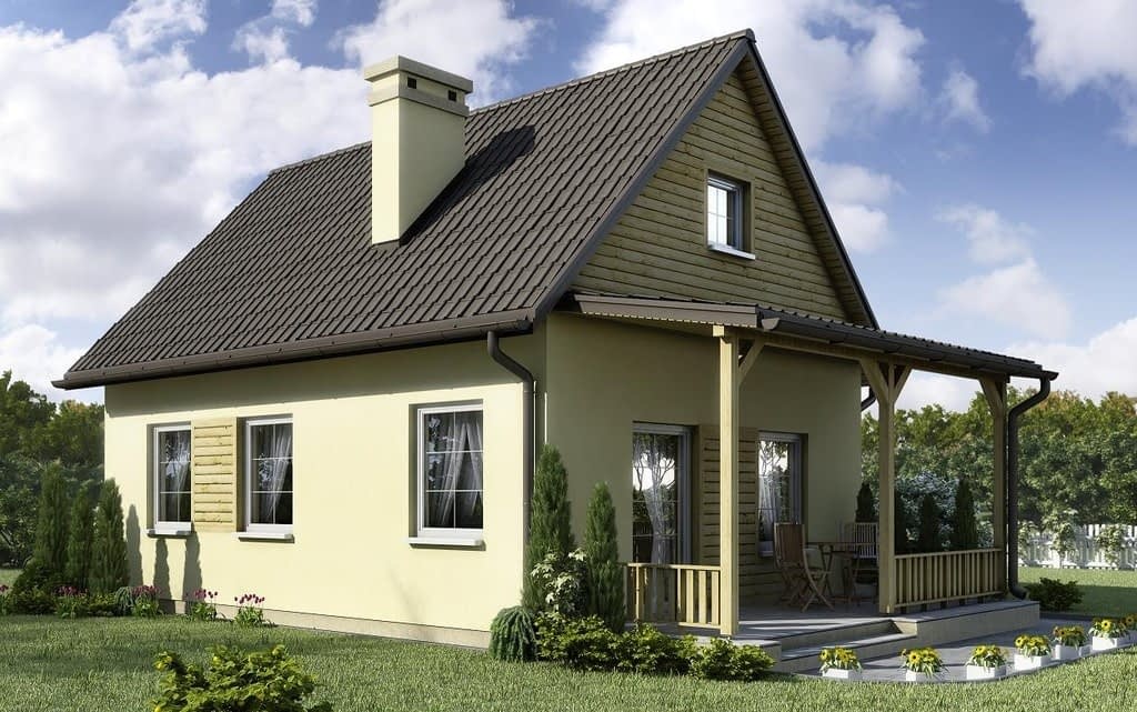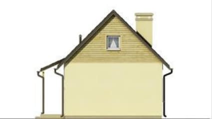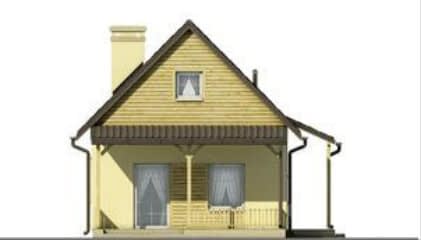 Prezentowany dom jest jednym z najtańszych w budowie i eksploatacji. Mały dom o minimalnym programie dla czteroosobowej rodziny. Może też pełnić funkcję wygodnego domu letniego. Czytelny i wygodny podział na część dzienną i nocną. Wygodny układ pokoju dziennego połączonego z aneksem kuchennym i mającym wyjście na duży zadaszony taras. Dodatkowe duże poddasze nieużytkowe dostępne przez zsuwane schody daje możliwość adaptacji na cele mieszkalne. Zminimalizowane powierzchnie komunikacyjne dopełniają pełną wygodę i funkcjonalność zawartą w niezbędnej przestrzeni. Możliwe jest oddzielenie kuchni od pokoju dziennego. Od strony sypialni możliwa jest dobudowa garażu lub wiaty na samochód. Możliwe jest ogrzewanie domu kominkiem w oparciu o system kanałów rozprowadzających ciepłe powietrze i centrali rozdzielczej.Konstrukcja