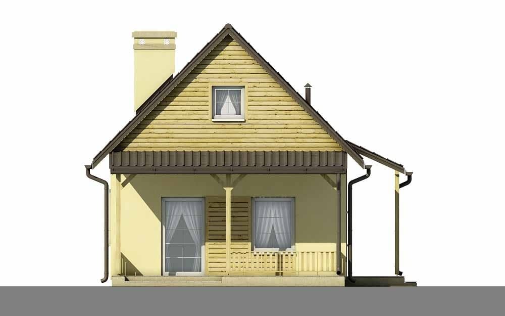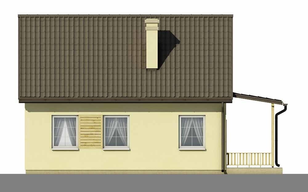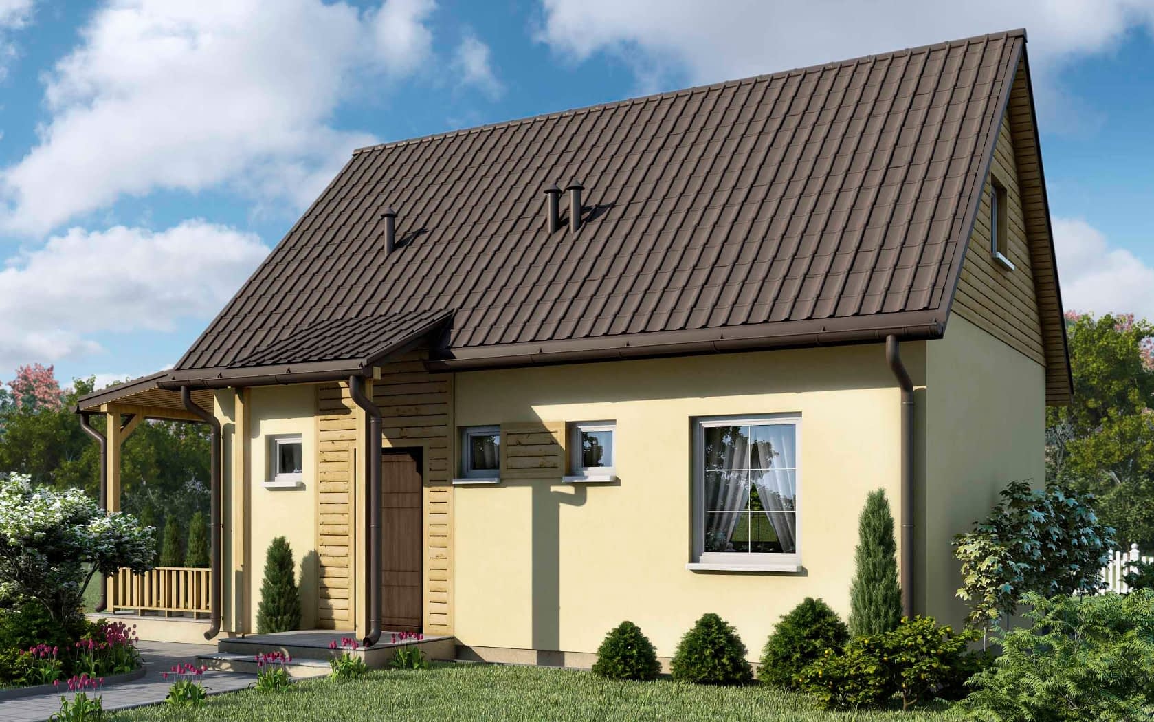 Prezentowany dom jest jednym z najtańszych w budowie i eksploatacji. Mały dom o minimalnym programie dla czteroosobowej rodziny. Może też pełnić funkcję wygodnego domu letniego. Czytelny i wygodny podział na część dzienną i nocną. Wygodny układ pokoju dziennego połączonego z aneksem kuchennym i mającym wyjście na duży zadaszony taras. Dodatkowe duże poddasze nieużytkowe dostępne przez zsuwane schody daje możliwość adaptacji na cele mieszkalne. Zminimalizowane powierzchnie komunikacyjne dopełniają pełną wygodę i funkcjonalność zawartą w niezbędnej przestrzeni. Możliwe jest oddzielenie kuchni od pokoju dziennego. Od strony sypialni możliwa jest dobudowa garażu lub wiaty na samochód. Możliwe jest ogrzewanie domu kominkiem w oparciu o system kanałów rozprowadzających ciepłe powietrze i centrali rozdzielczej.Konstrukcja