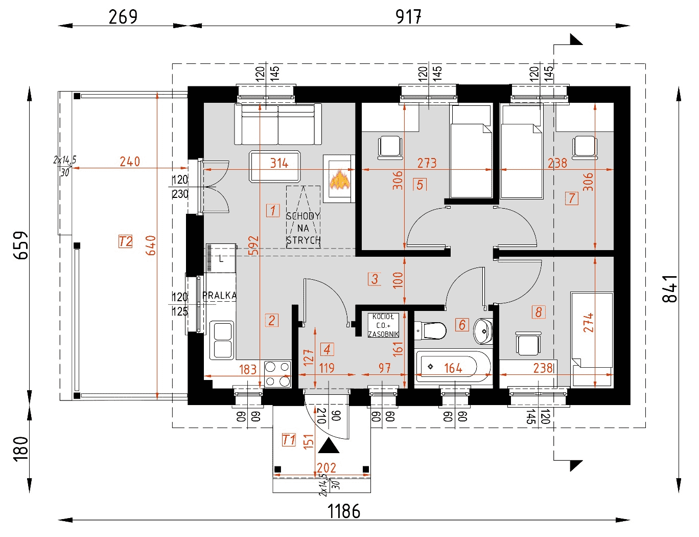 - rzuty wszystkich kondygnacji (np. parter, piwnica, piętro) – rozmieszczenie i wymiary wszystkich pomieszczeń, rozmieszczenie i wielkość otworów okiennych i drzwiowych, rozmieszczenie kominów, sugerowana aranżacja wnętrz.