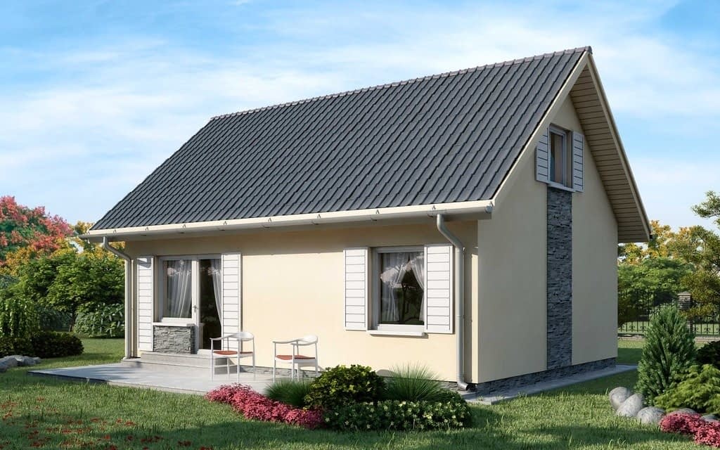 Dom mieszkalny jednorodzinny całoroczny. Jedna sypialnia, pokój dzienny z aneksem kuchennym, łazienka i przedsionek, poddasze. Posiadamy wersję z garażem – D199 Paula oraz D199 Paula_IKonstrukcja