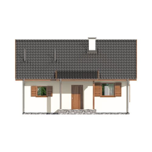 Dom mieszkalny jednorodzinny, może pełnić funkcję domu letniskowego. Jedna sypialnia, pokój dzienny z aneksem kuchennym, łazienka i przedsionek, poddasze.Wersja I kolorystyki elewacji.Konstrukcja