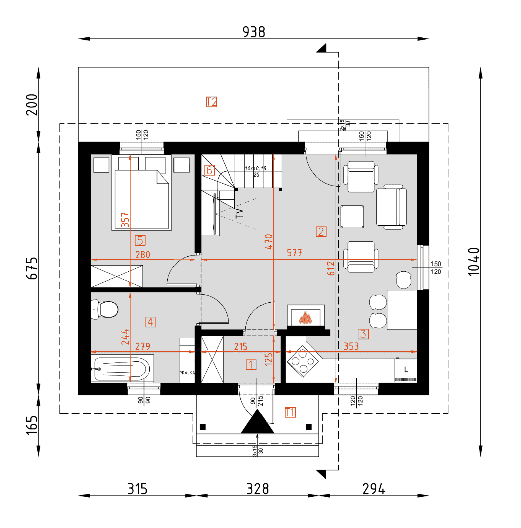 - rzuty wszystkich kondygnacji (np. parter, piwnica, piętro) – rozmieszczenie i wymiary wszystkich pomieszczeń, rozmieszczenie i wielkość otworów okiennych i drzwiowych, rozmieszczenie kominów, sugerowana aranżacja wnętrz.