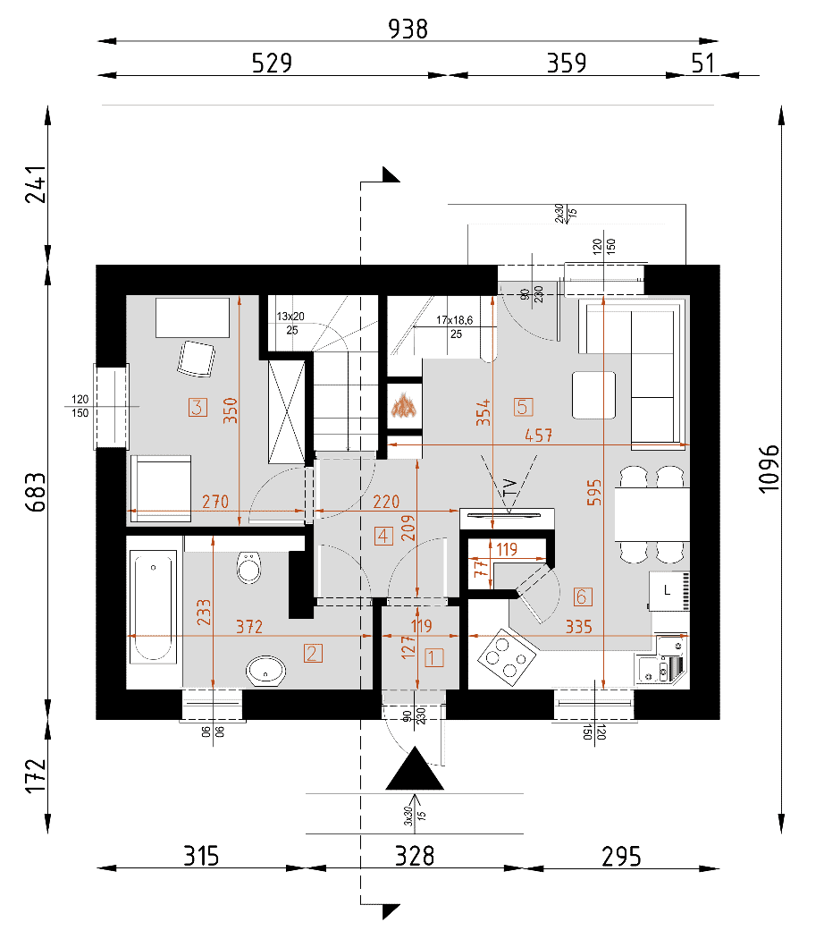 - rzuty wszystkich kondygnacji (np. parter, piwnica, piętro) – rozmieszczenie i wymiary wszystkich pomieszczeń, rozmieszczenie i wielkość otworów okiennych i drzwiowych, rozmieszczenie kominów, sugerowana aranżacja wnętrz.