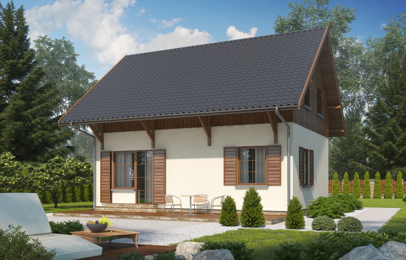 - elewacje (frontowa, dwie elewacje boczne, ogrodowa) – dokładny wygląd domu z każdej strony.
