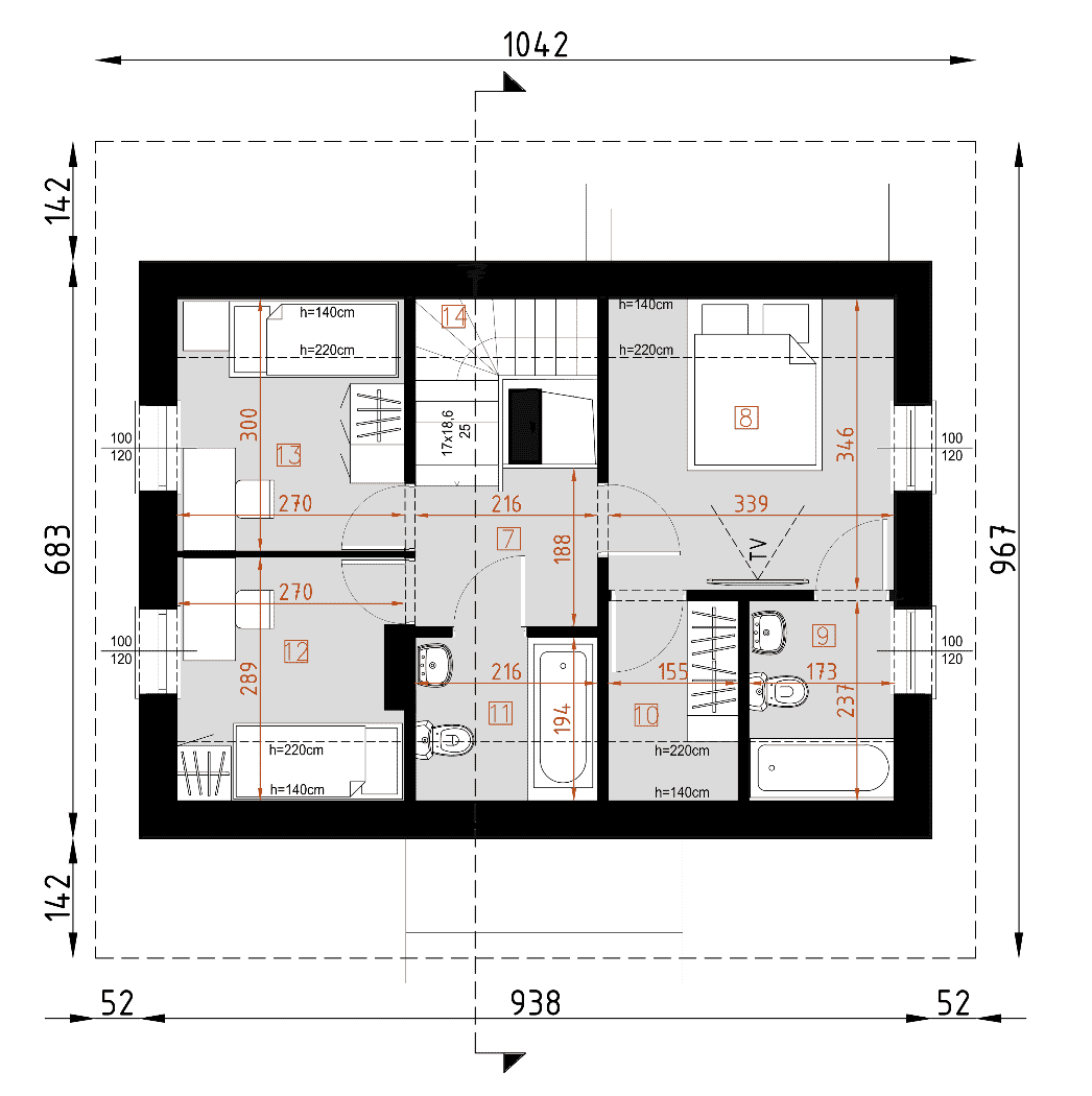 - rzut dachu – wymiary dachu, kąt nachylenia wszystkich połaci dachu, rozmieszczenie okien połaciowych, lukarn, kominów.