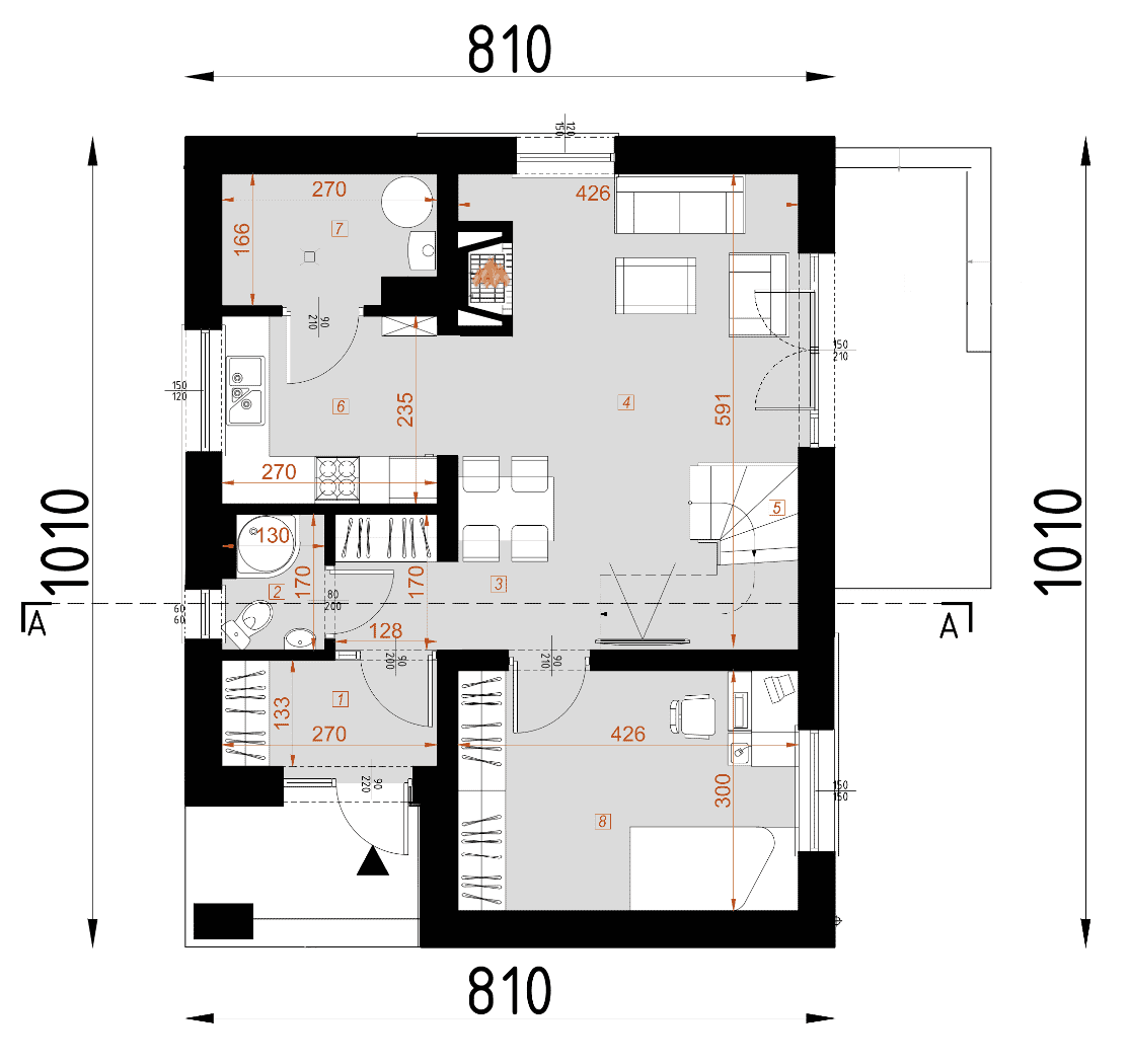- rzuty wszystkich kondygnacji (np. parter, piwnica, piętro) – rozmieszczenie i wymiary wszystkich pomieszczeń, rozmieszczenie i wielkość otworów okiennych i drzwiowych, rozmieszczenie kominów, sugerowana aranżacja wnętrz.