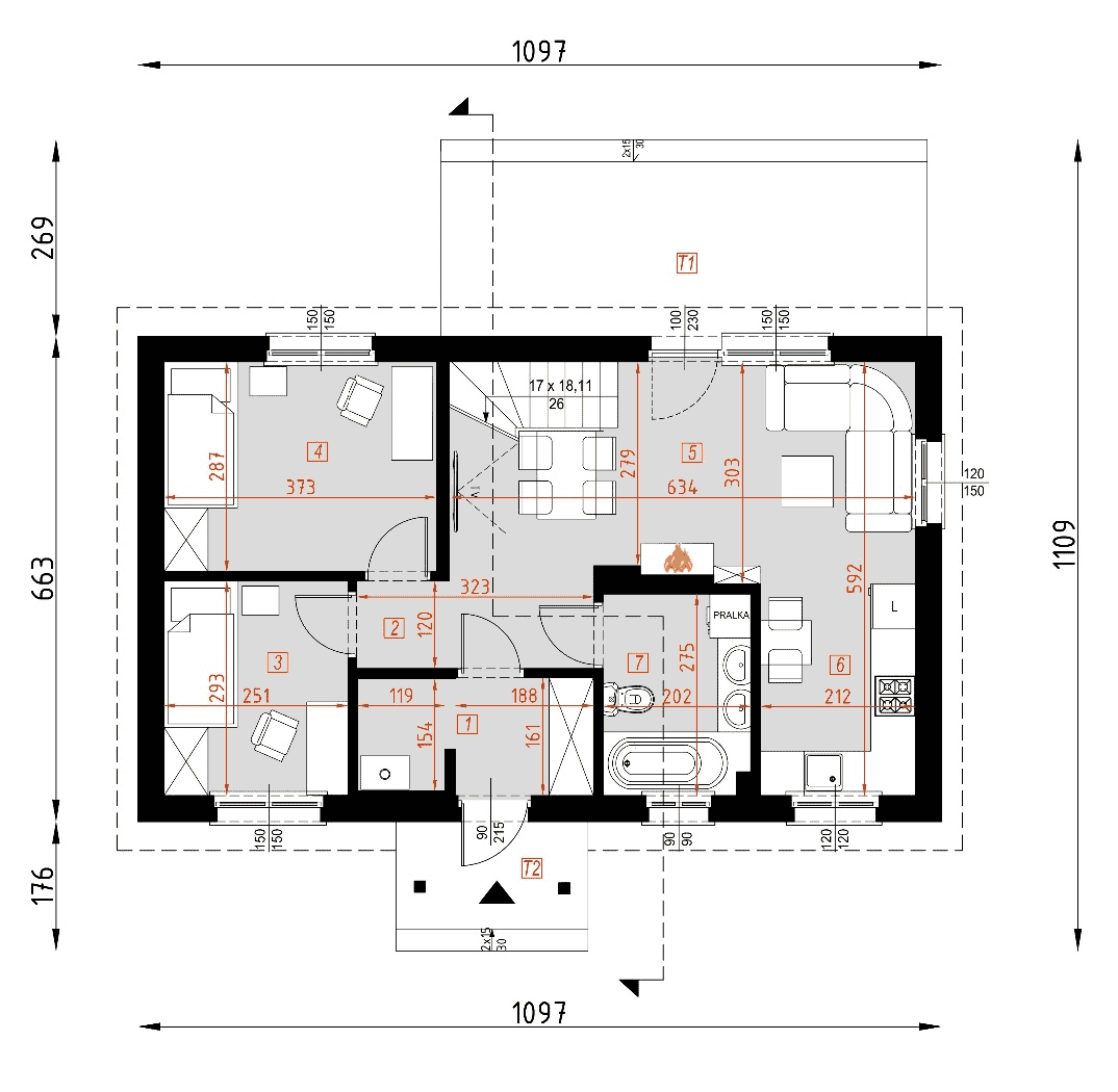 Dom mieszkalny jednorodzinny, wolnostojący, budowany w technologii szkieletu drewnianego. Parter składa się z pokoju dziennego połączonego z korytarzem prowadzącym do pokoi oraz sieni wejściowej, trzech pokoi sypialnych, kuchni, łazienki i pomieszczenia technicznego. Ten projekt posiadamy też w wersji murowanej z elewacją w tynku i z kamieniem naturalnym.Konstrukcja