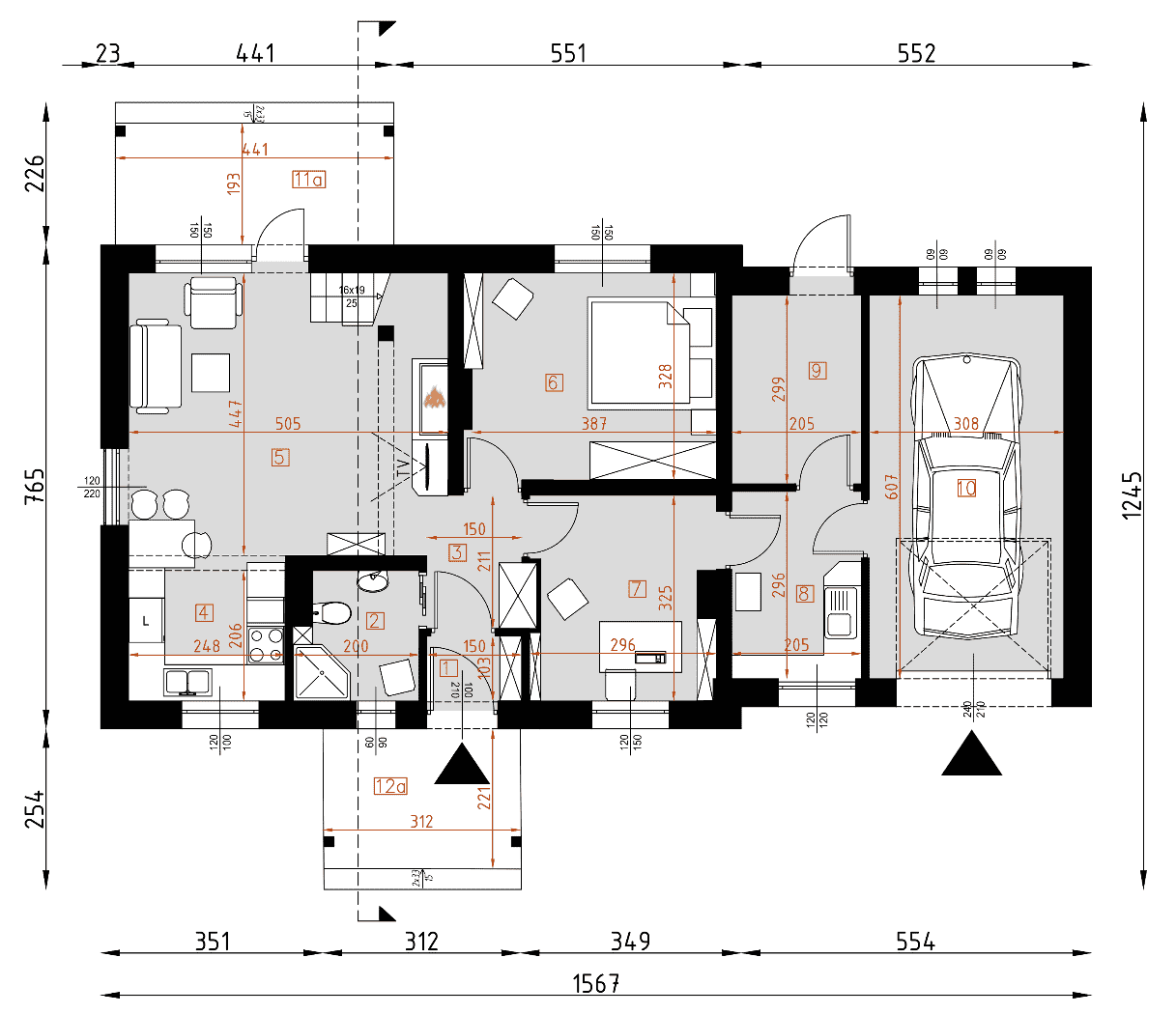 - rzuty wszystkich kondygnacji (np. parter, piwnica, piętro) – rozmieszczenie i wymiary wszystkich pomieszczeń, rozmieszczenie i wielkość otworów okiennych i drzwiowych, rozmieszczenie kominów, sugerowana aranżacja wnętrz.