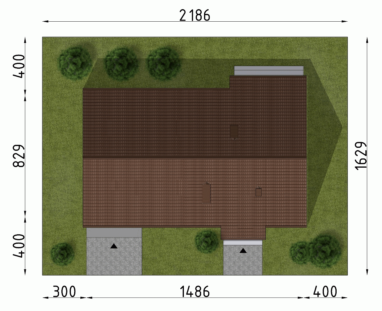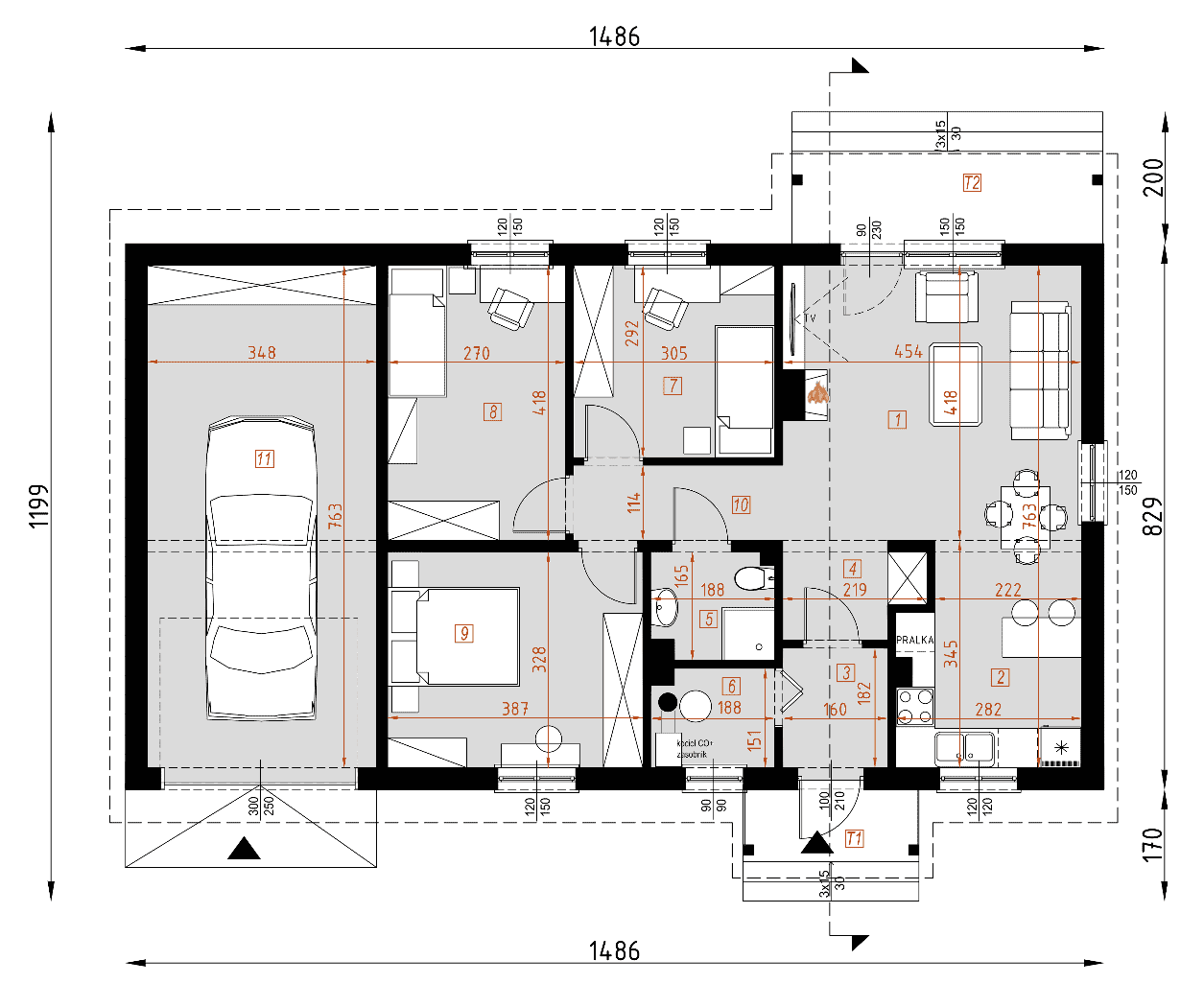 Dom mieszkalny jednorodzinny z garażem, wolno stojący, budowany w technologii tradycyjnej lub w szkielecie drewnianym. Parter składa się z pokoju dziennego, dwóch pokoi sypialnych, kuchni, łazienki, sieni i dostępnego z niej bezpośrednio pomieszczenia technicznego, hallu oraz garażu.Konstrukcja