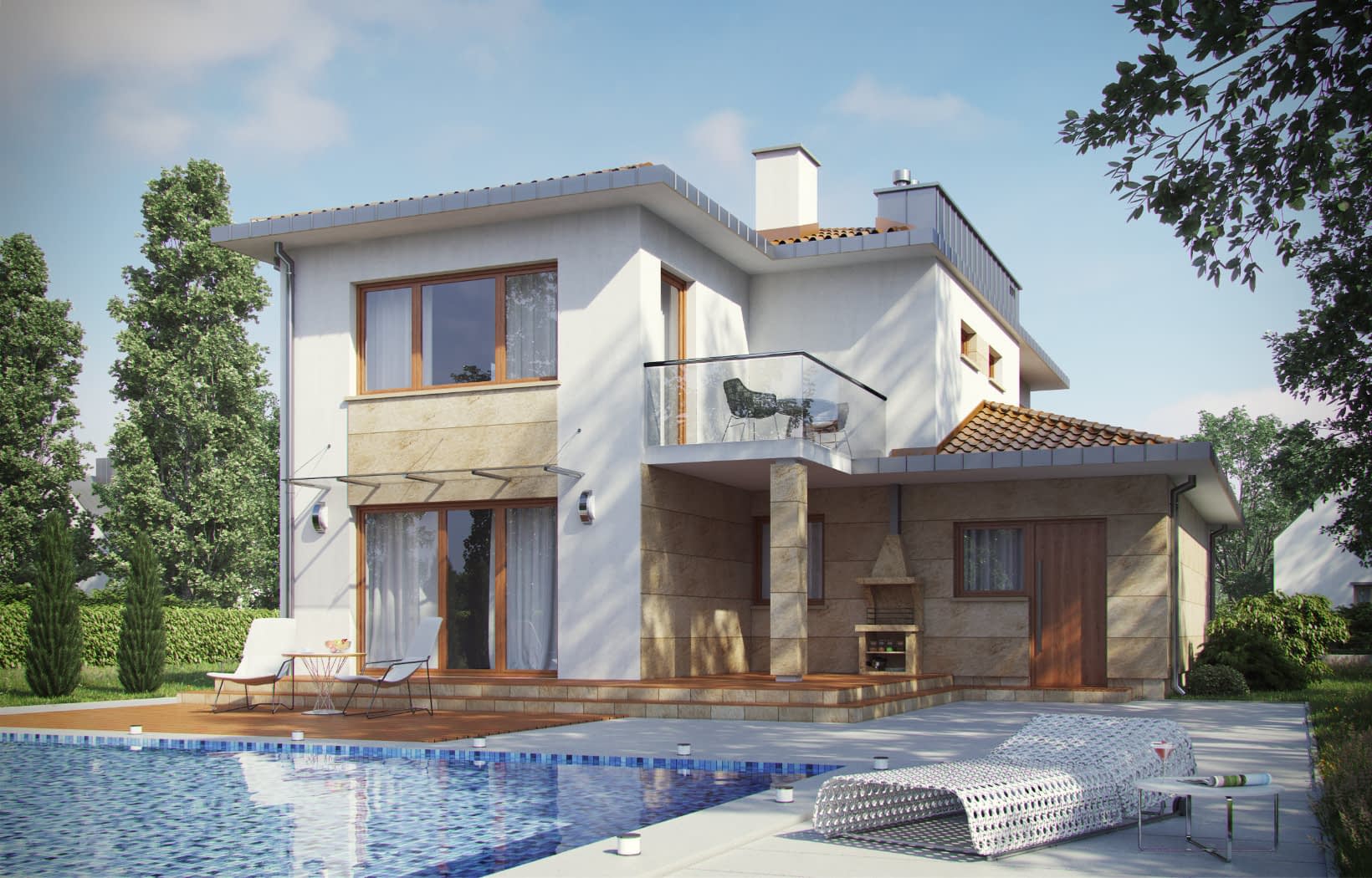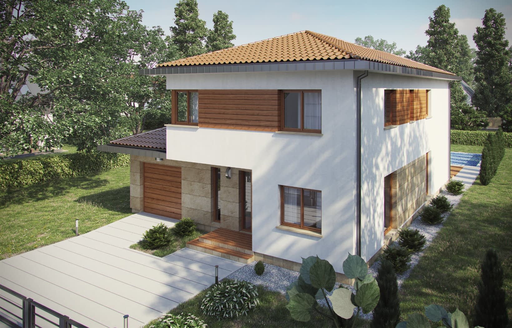Jeśli szukają Państwo niepowtarzalnego domu piętrowego to projekt D87 WT2021 będzie idealną propozycją. Dom bez wątpienia wyróżnia się spośród innych projektów domów jednorodzinnych. Nowoczesna bryła wzbogacona o niebanalne dodatki architektoniczne tworzy zaskakujący efekt. Garaż jednostanowiskowy jest wkomponowany w bryłę domu w ścianie bocznej wraz z dużym pomieszczenie technicznym idealnym dla majsterkującego Pana Domu. Od strony ogrodu do budynku przylega rozległy taras z kominkiem i miejscem do grillowania, który będzie doskonałym miejscem wypoczynku w ciepłe, słoneczne dni. Piękny efekt wizualny tworzy kremowa kolorystyka elewacji połączona z naturalnymi elementami – drewnem i kamieniem.Konstrukcja
