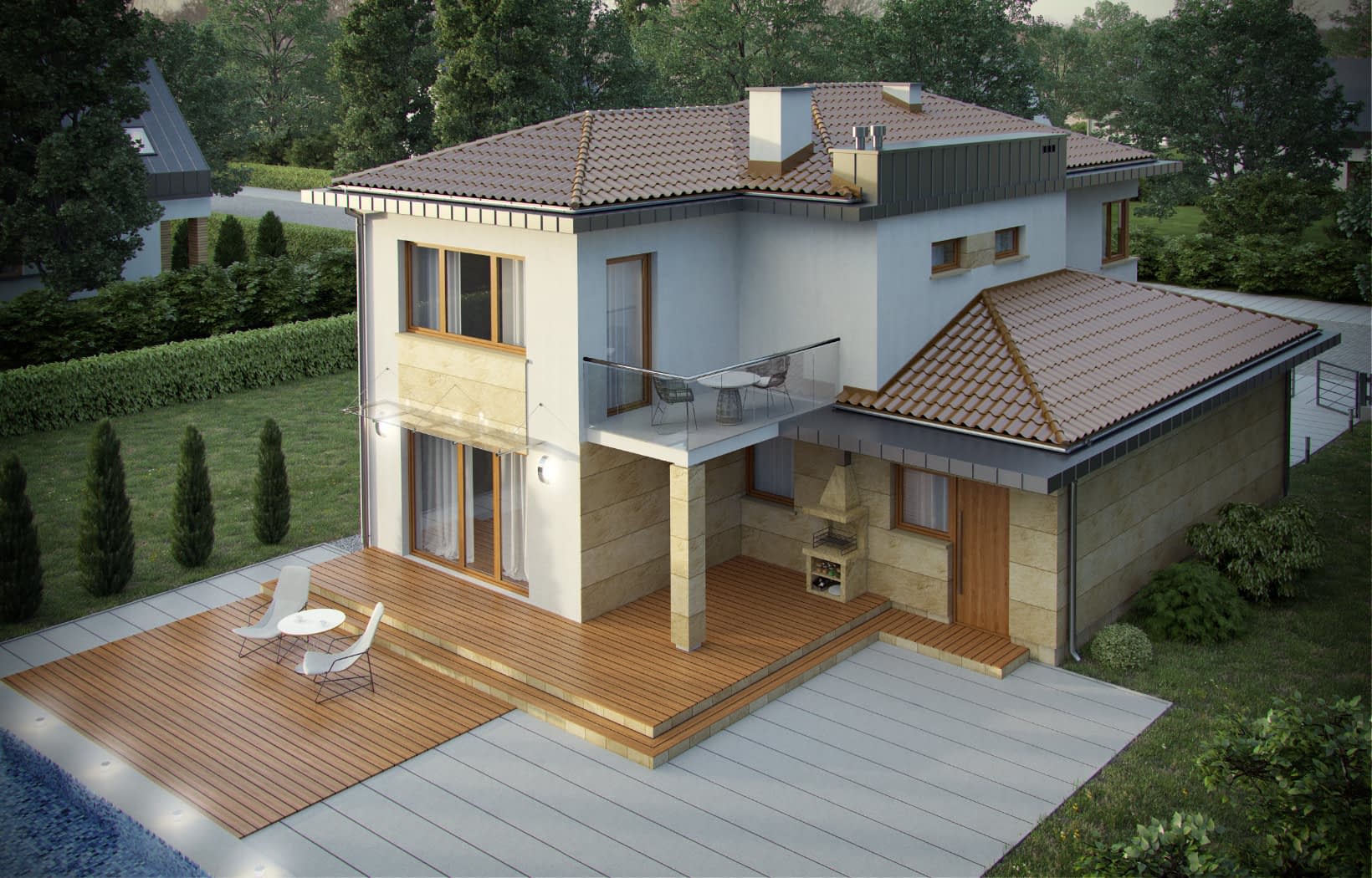 - elewacje (frontowa, dwie elewacje boczne, ogrodowa) – dokładny wygląd domu z każdej strony.