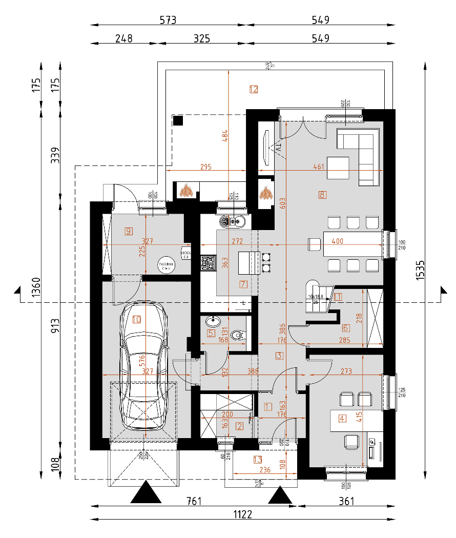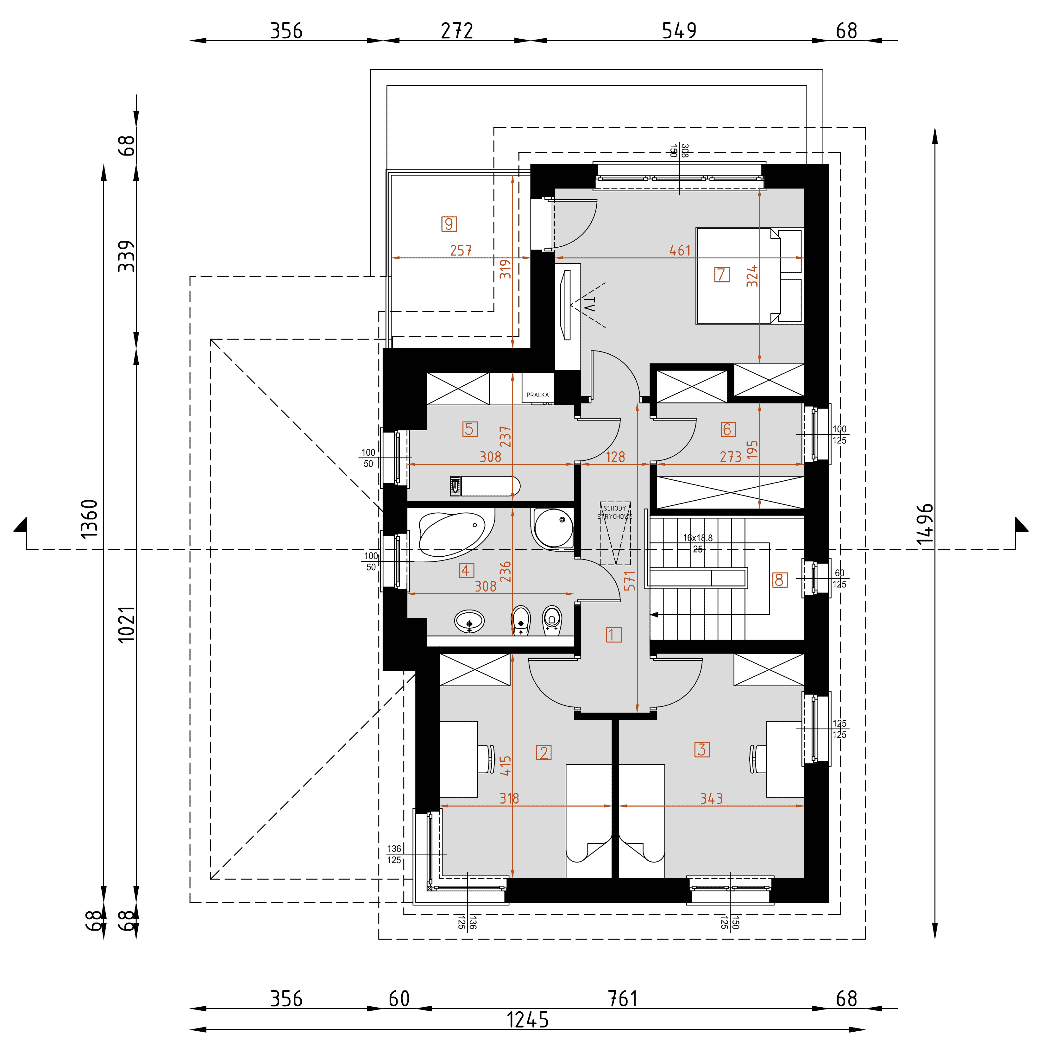 - rzuty wszystkich kondygnacji (np. parter, piwnica, piętro) – rozmieszczenie i wymiary wszystkich pomieszczeń, rozmieszczenie i wielkość otworów okiennych i drzwiowych, rozmieszczenie kominów, sugerowana aranżacja wnętrz.