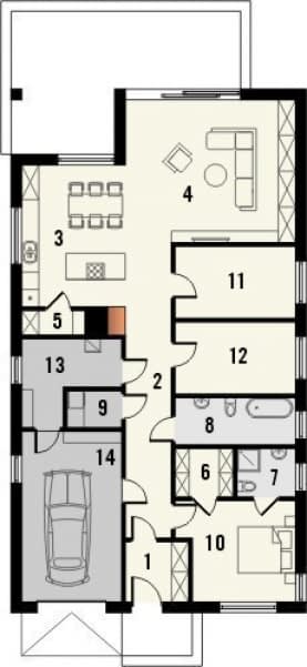 Darmowy zielony pakiet do projektu oznacza, że w tej samej cenie można otrzymać wariant z ogrzewaniem przy zastosowaniu ekologicznej pompy ciepła powietrze-woda i podłogówką we wszystkich pomieszczeniach, zamiast standardowego pieca gazowego zasilającego stalowe grzejniki płytowe.