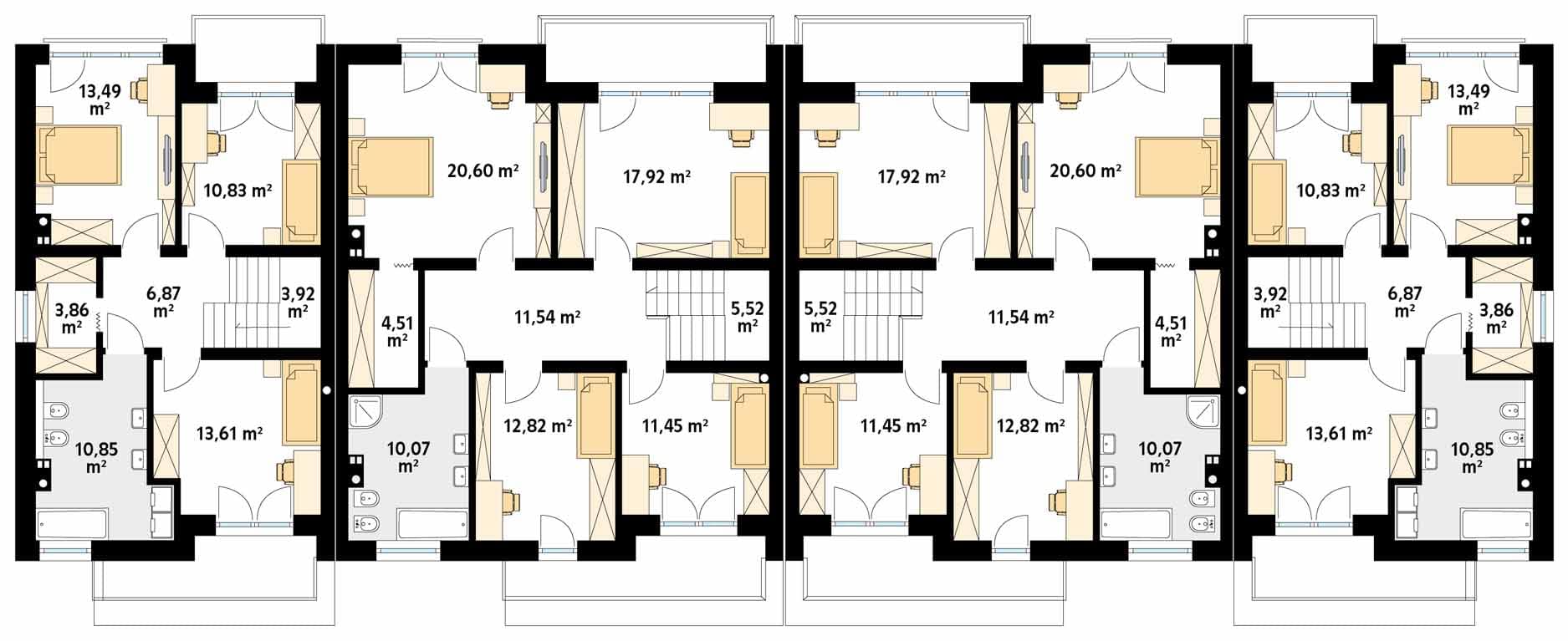 Dąb 2 to projekt domu w zabudowie szeregowej. Tradycyjna bryła pokryta wielospadowym dachem. To, co wyróżnia projekt Dąb 2 od innych projektów domów w zabudowie szeregowej to zróżnicowane powierzchnie segmentów. W obu segmentach rozkład pomieszczeń jest niezwykle funkcjonalny i może zapewnić komfortowe warunki do życia 5 lub 6 osobowej rodzinie. Nowoczesne tarasy, garaż oraz duże przeszklenia w części dziennej domu to dodatkowe atuty projektu. Cena dotyczy jednego segmentu. O inne konfiguracje zapytaj telefonicznie.Konstrukcja