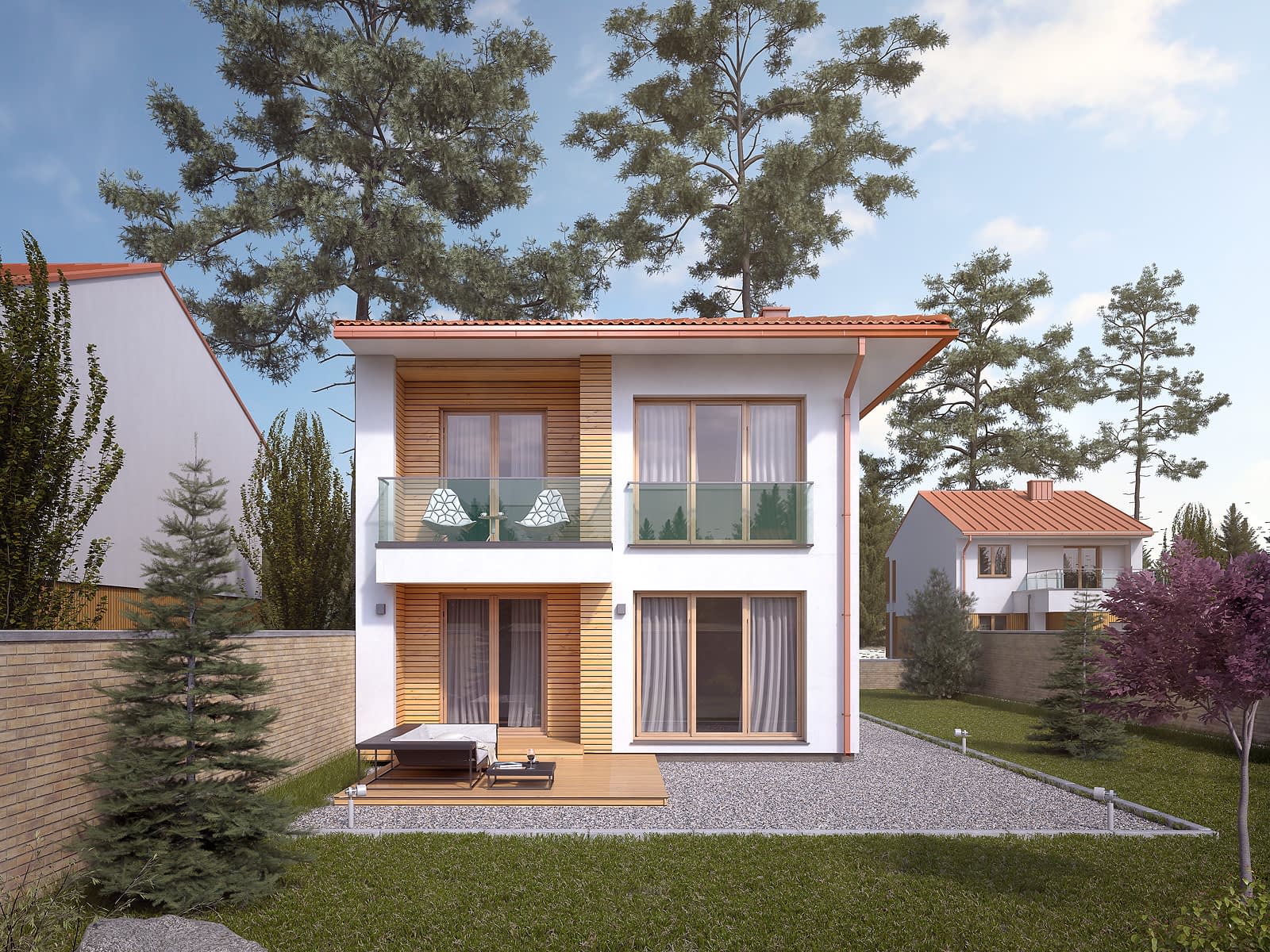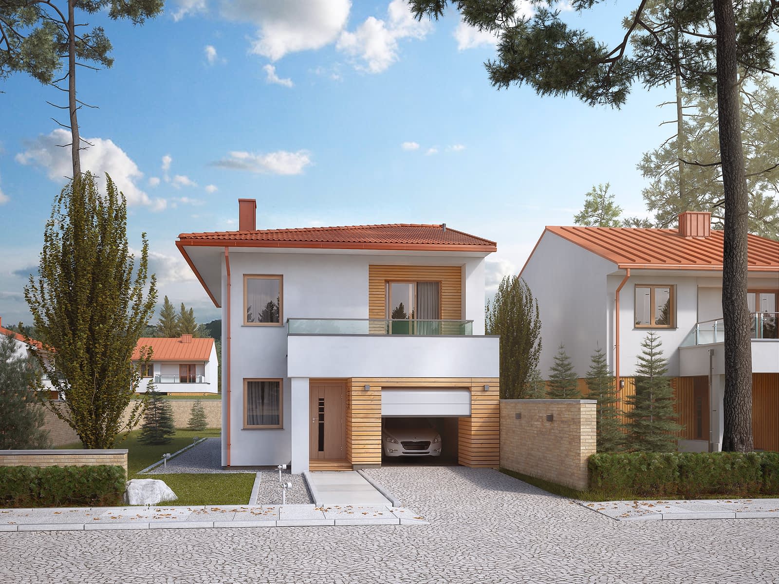 Dąb 2 W to projekt nowoczesnego domu piętrowego przeznaczony na wąska działkę. W zwartą bryłę budynku wkomponowano jednostanowiskowy garaż. Program funkcjonalny domu podzielono na strefę dzienną na parterze oraz strefę nocną ulokowaną na piętrze. Strefa dzienna składa się z salonu z jadalnią oraz wydzielonej kuchni. Na parterze zaprojektowano dodatkowo łazienkę oraz niedużą kotłownię gazową. Na piętrze znajdują się trzy sypialnie, łazienka oraz garderoba. Budynek idealnie sprawdzi się zarówno w zabudowie szeregowej lub jako jednorodzinny dom mieszkalny.Konstrukcja