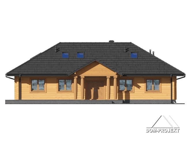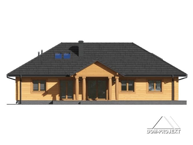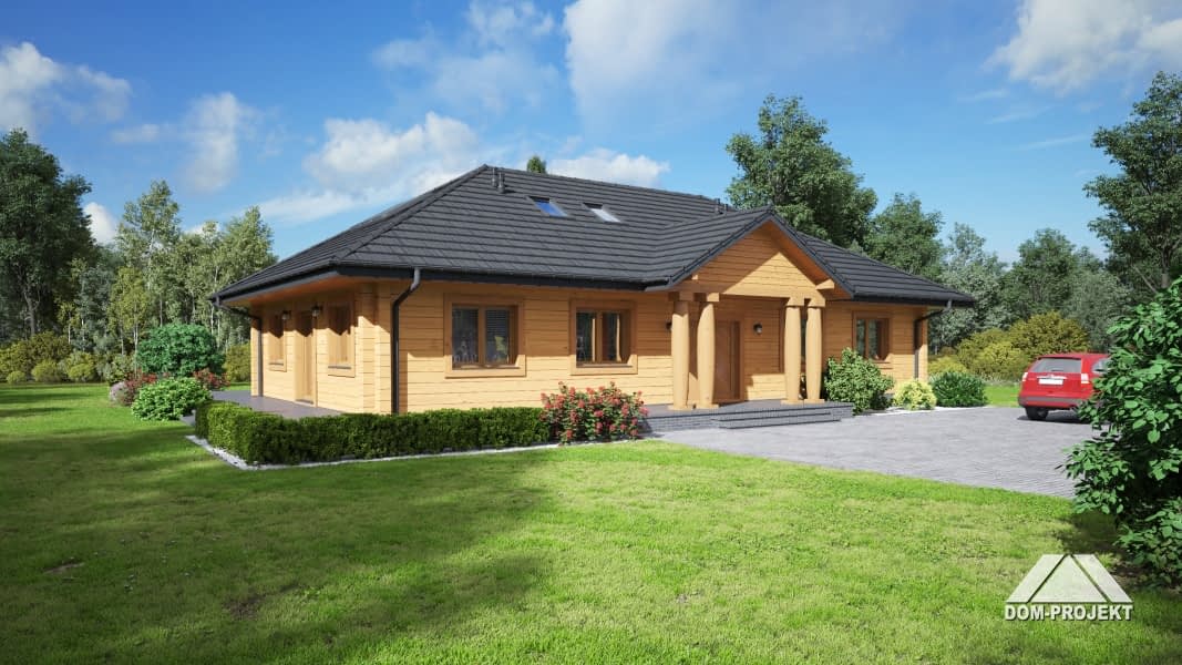 Dom z bali. Duży salon z aneksem kuchennym, kominkiem i wyjściami na taras. Pokój, dwie łazienki, dwie garderoby, pokój-gabinet, wiatrołap i komunikacja. Na poddaszu pokój, łazienka, strych i komunikacja.Rzuty