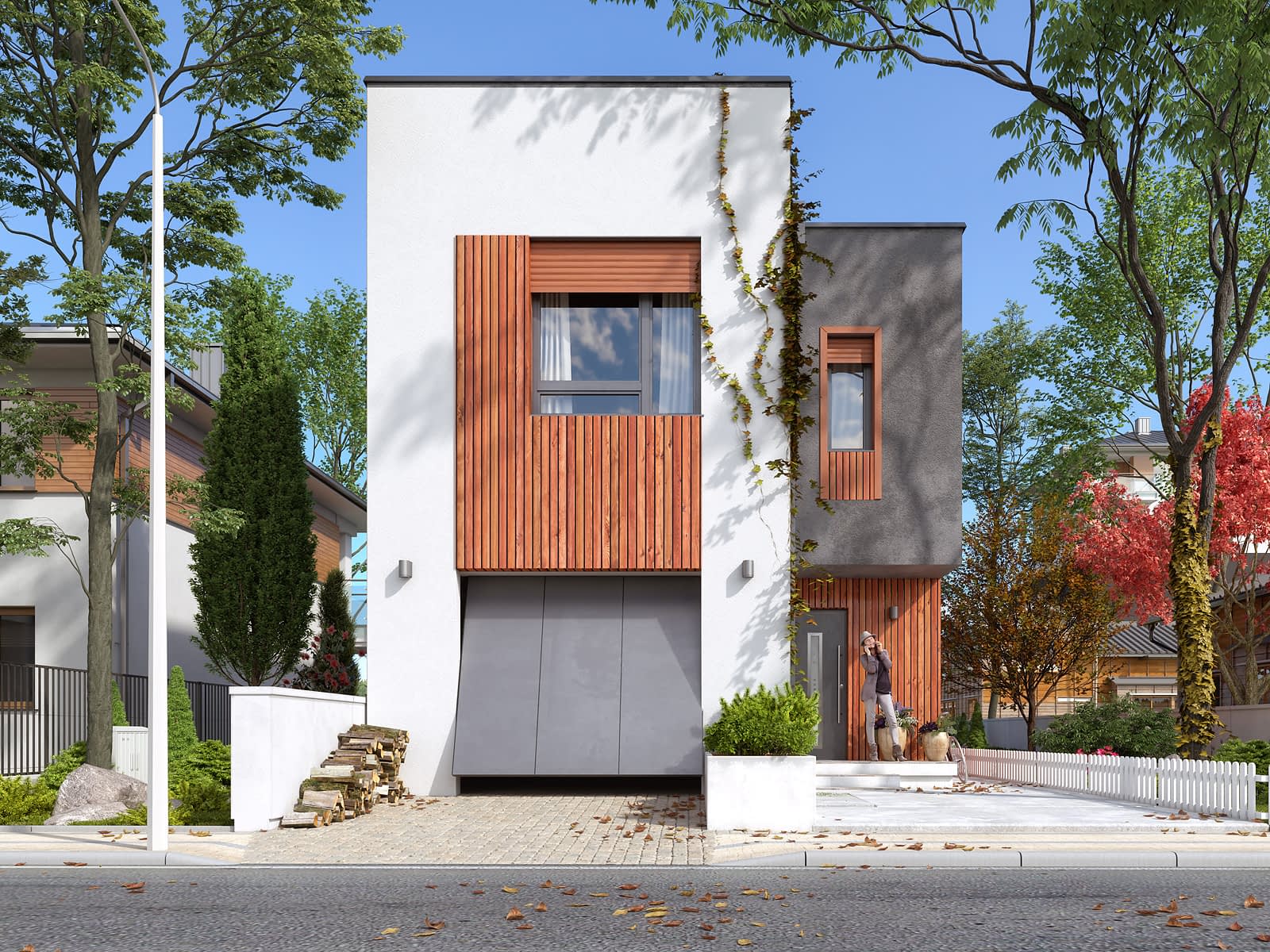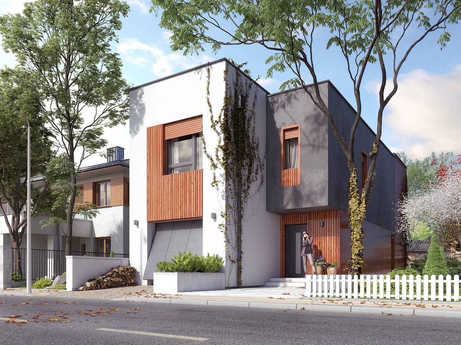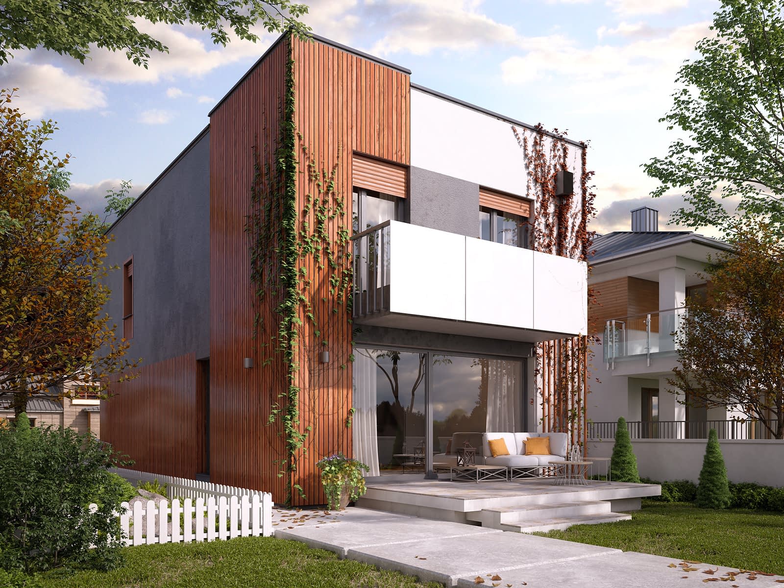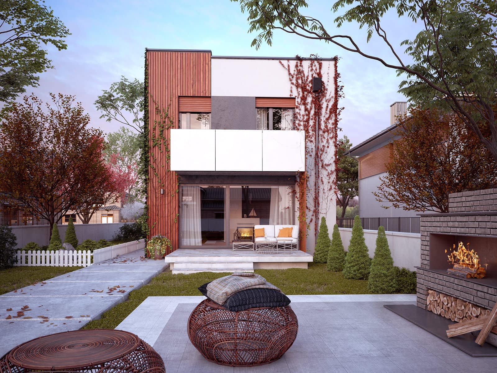 Dom odpowiadający potrzebom 4-osobowej rodziny. Niewielka szerokość umożliwia budowę na wąskiej działce - poniżej 15m szerokości. Parter został zaprojektowany jako otwarta strefa dzienna - przenikające się jasne przestrzenie salonu z kominkiem i centralnie umieszczonej kuchni z jadalnią. Strefa nocna zaprojektowana na piętrze sprzyja zachowaniu wygody i prywatności członków rodziny. Główna sypialnia posiada odrębną łazienkę i garderobę. Rozrzeźbiona modernistyczna bryła podkreśla i jednocześnie osłania wejście do budynku. Zadaszony taras i balkon umilą chwile odpoczynku.Konstrukcja