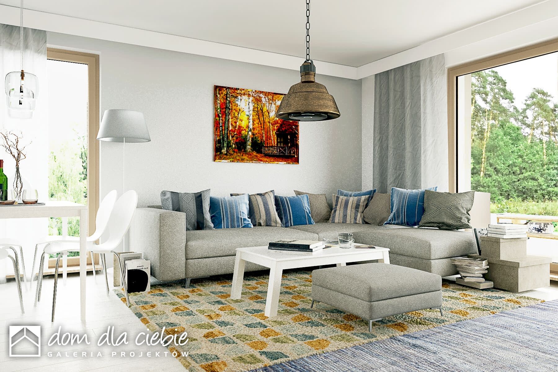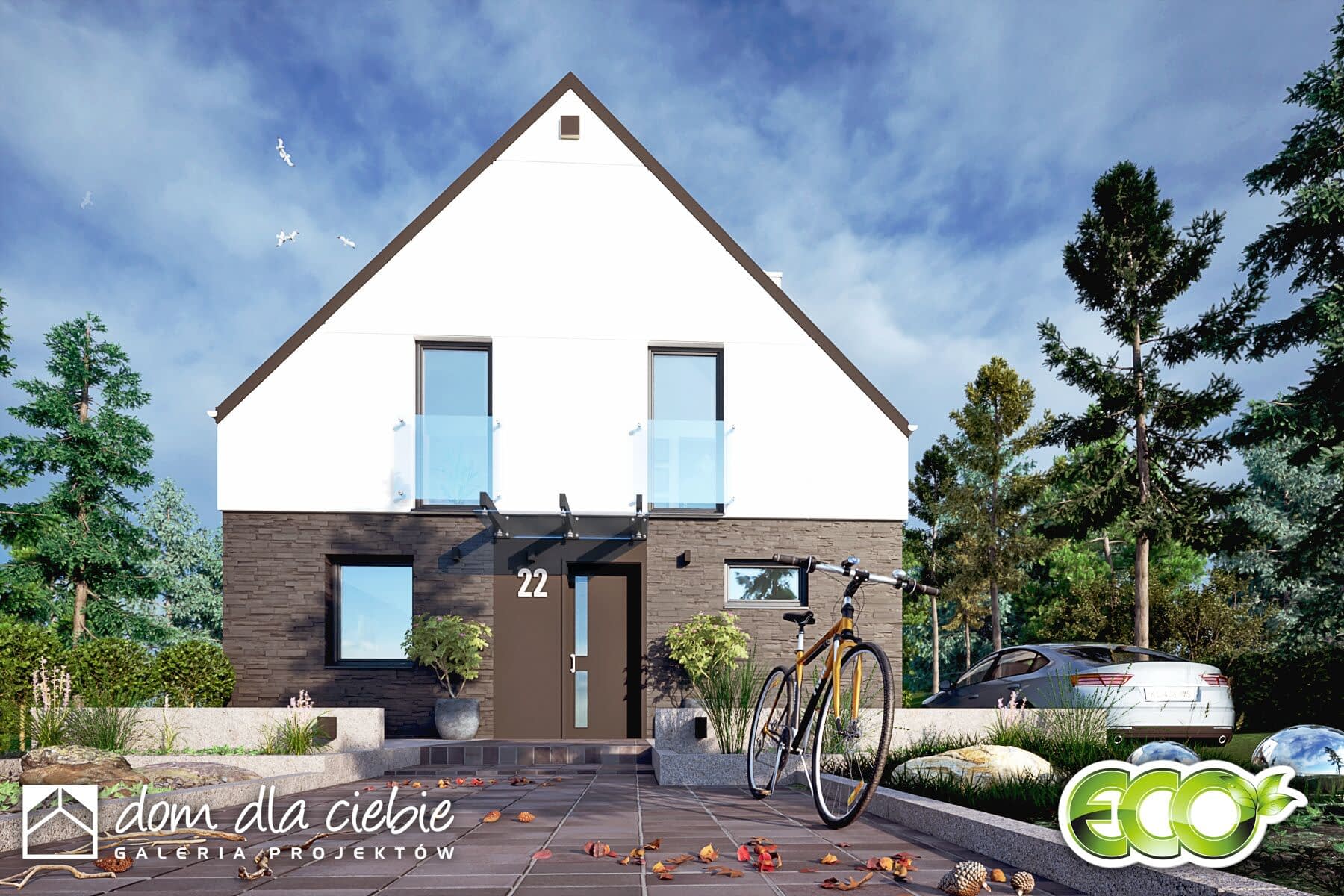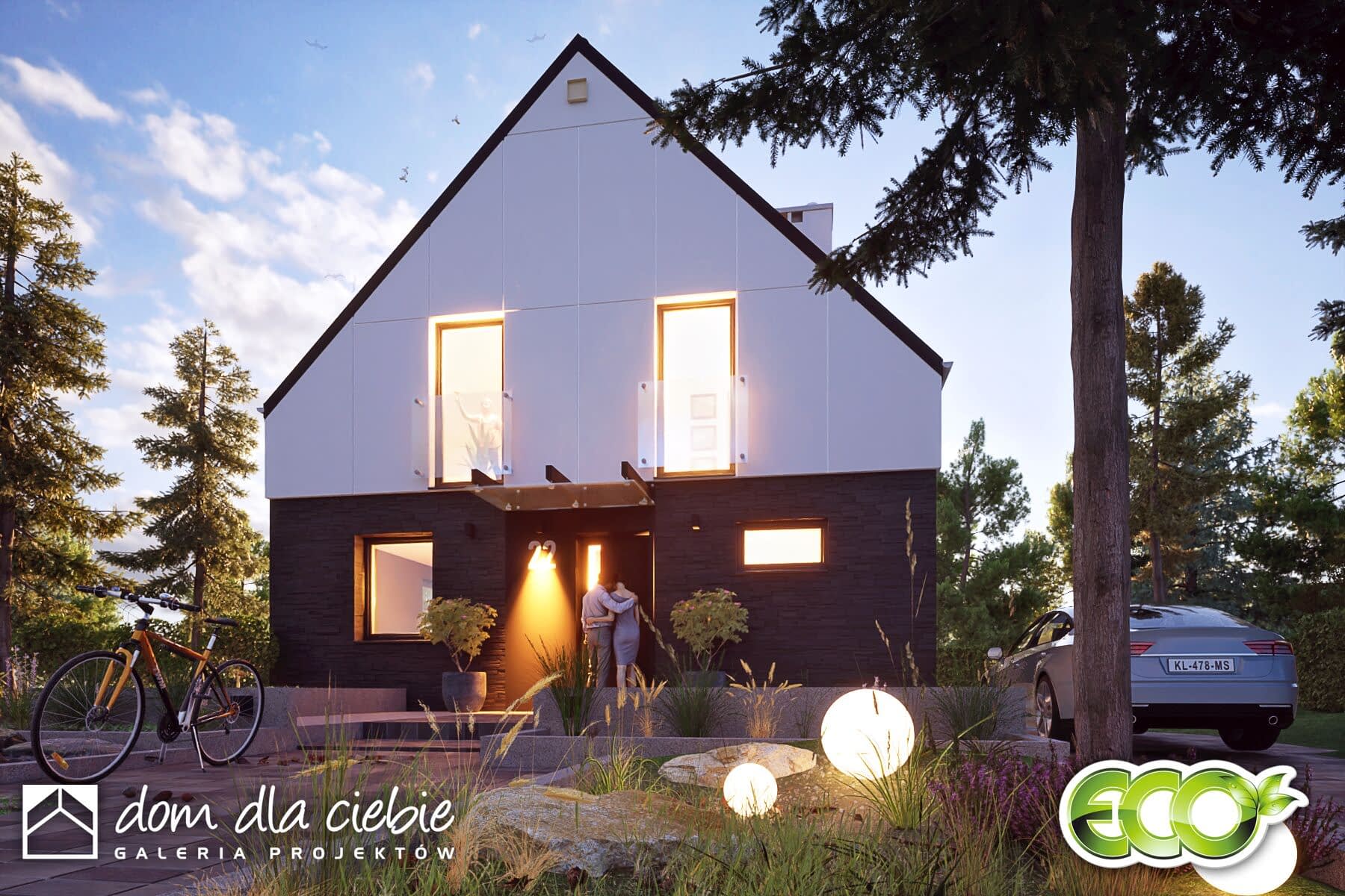 Ekonomiczny, projekt nowoczesnego domu jednorodzinnego z dwuspadowym bezokapowym dachem. Daktyl II przewidziany jest dla czteroosobowej rodziny. Główne, zadaszone wejście prowadzi do wiatrołapu. Stąd można dostać się do pomieszczenia technicznego oraz do mieszkalnej części dziennej. Pod częścią biegu schodowego zaprojektowano łazienkę. Z salonem połączony jest pokój gościnny. Kuchnia jest otwarta i posiada spiżarnię. W centralnej części domu zaprojektowano kominek. Obok kuchni przewidziano miejsce na stół. Z salonu wchodzi się schodami na poddasze, gdzie zlokalizowano trzy sypialnie oraz łazienkę z pralką.Daktyl II to propozycja ekonomicznego i ekologicznego domu, który doskonale sprawdzi się jako dom całoroczny.