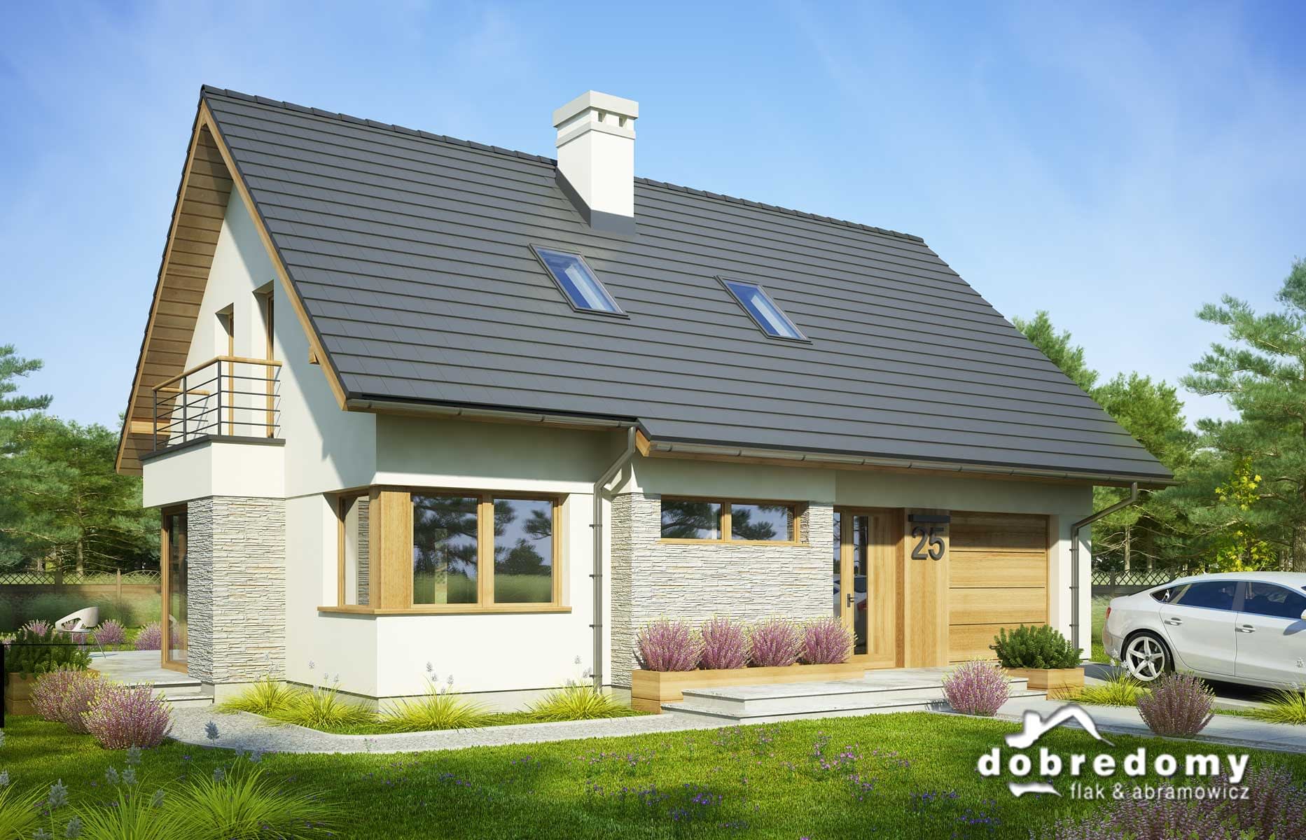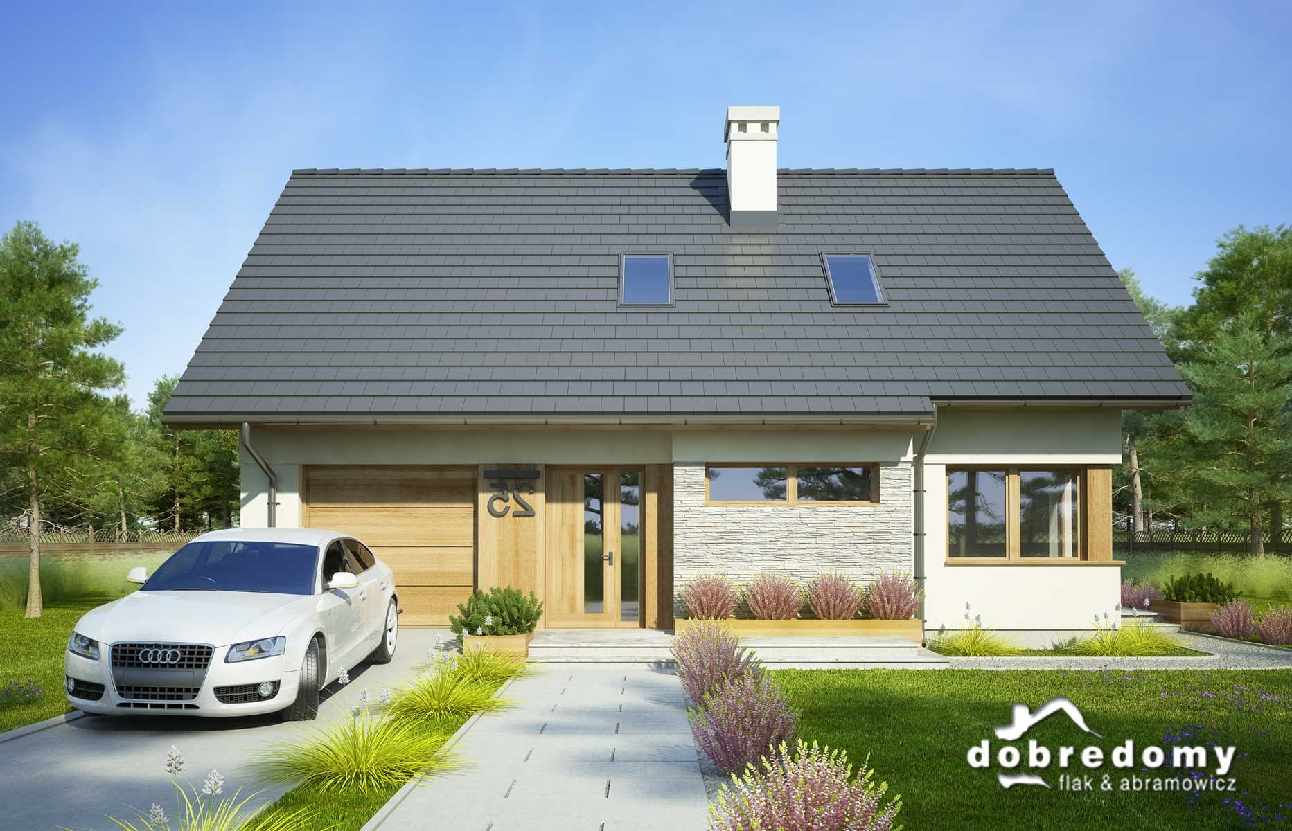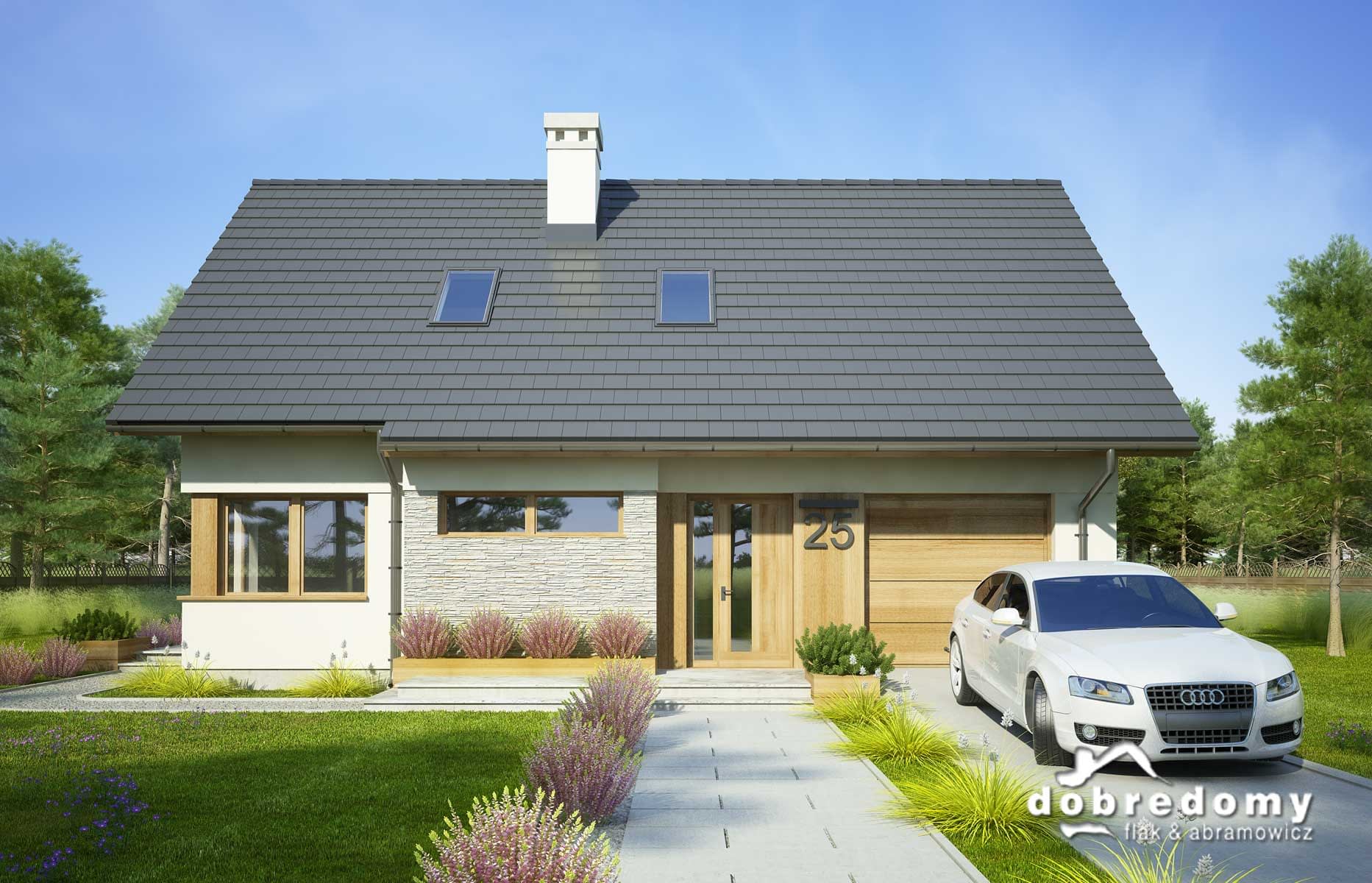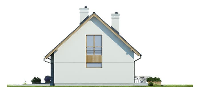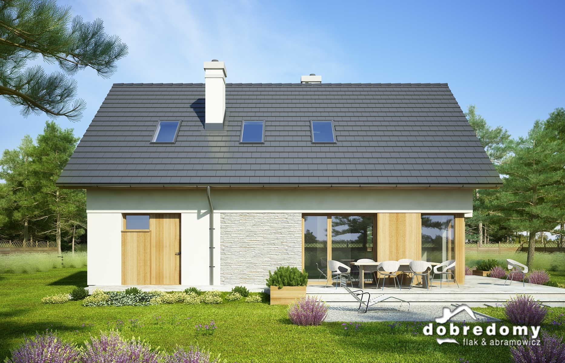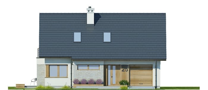 Projekt jednorodzinnego domu parterowego z poddaszem użytkowym i garażem 1-stanowiskowym, przeznaczony dla rodziny 4-5-osobowej. Układ funkcjonalny parteru obejmuje strefę dzienną (salon połączony z jadalnią i osobna kuchnia) oraz gospodarczą (garaż i pom. gosp.). Dodatkowe pomieszczenia na tej kondygnacji to: spiżarnia, wc, schowek. Na poddaszu zlokalizowano strefę nocną (3 sypialnie i łazienka).