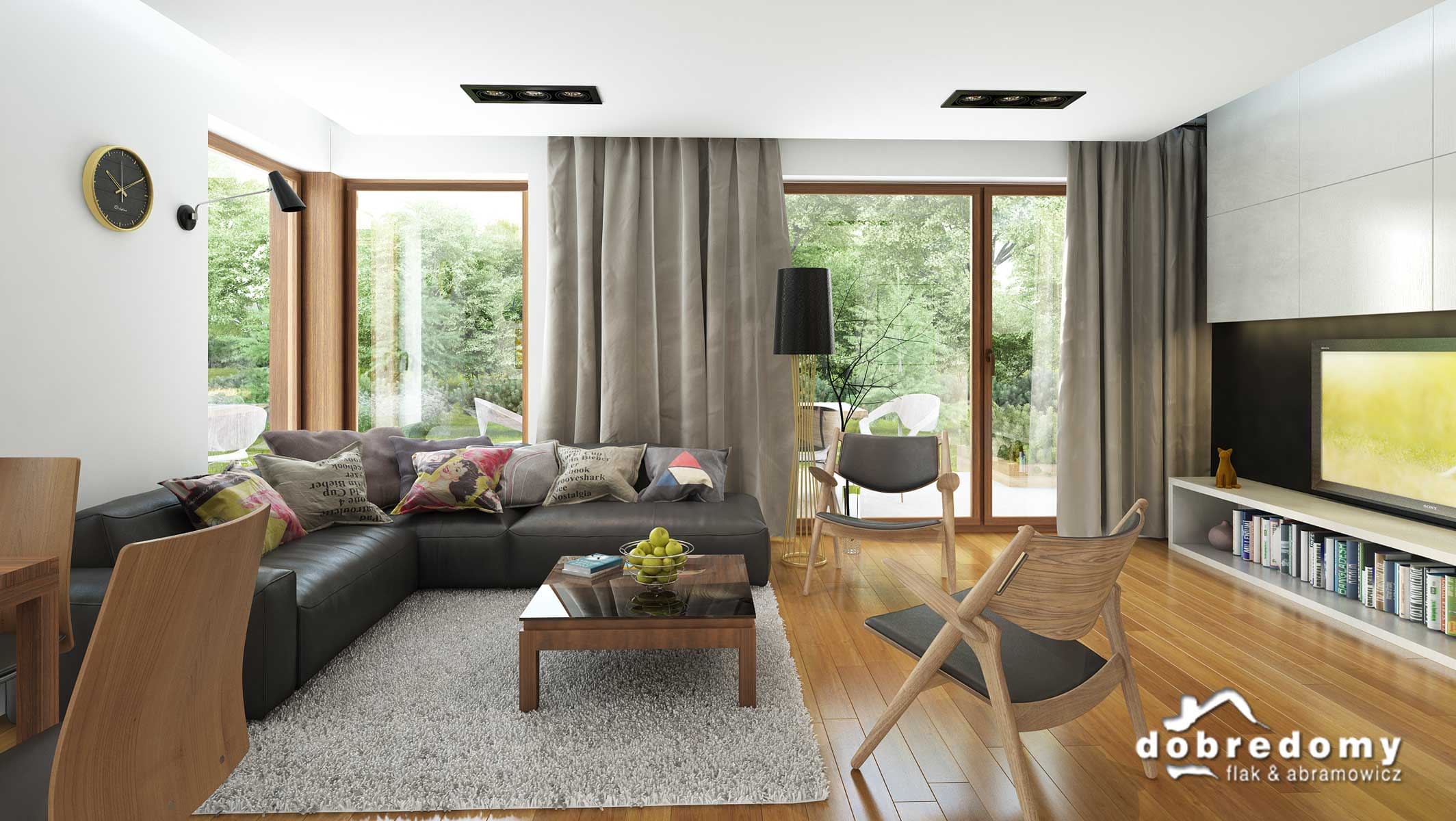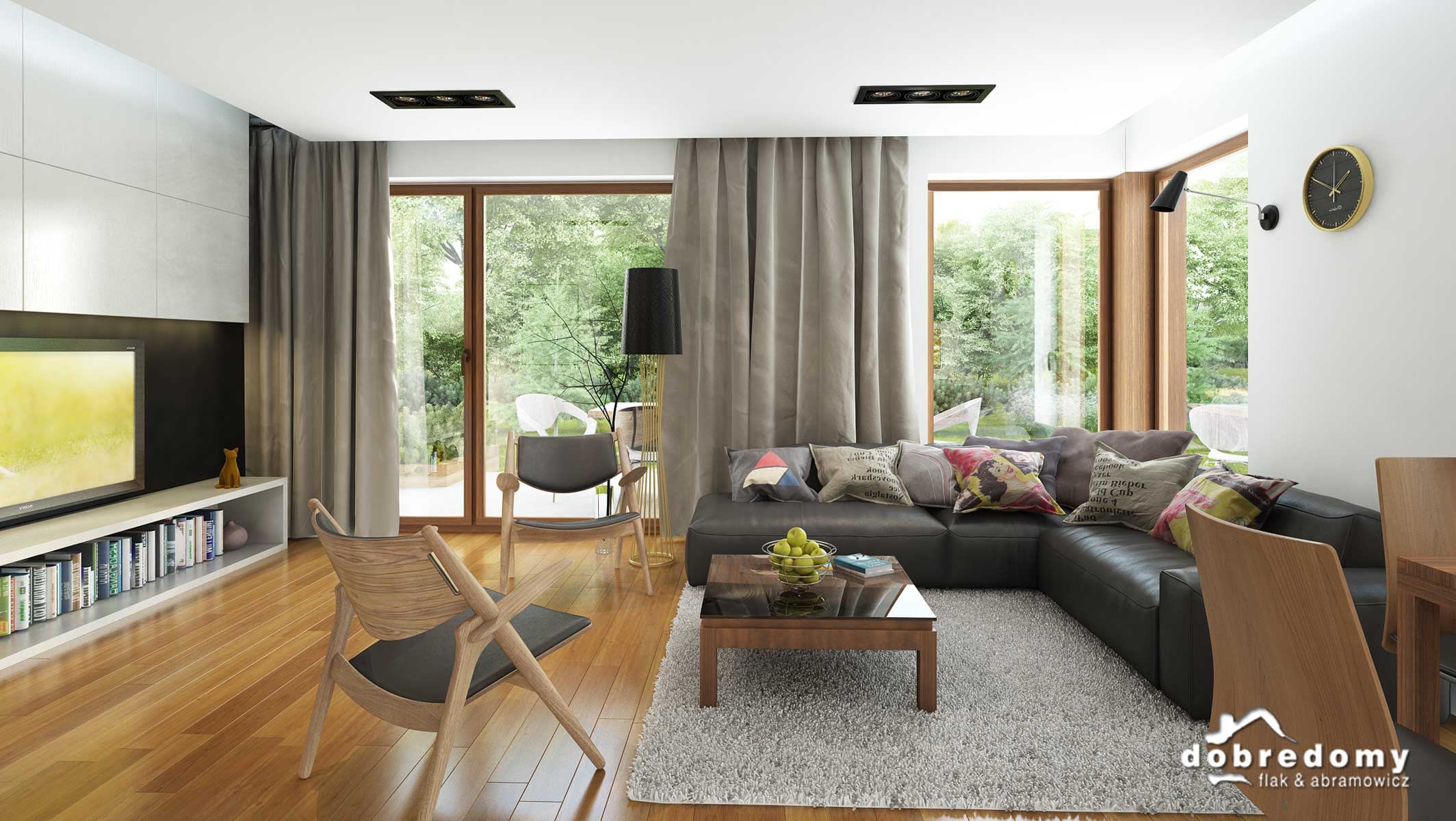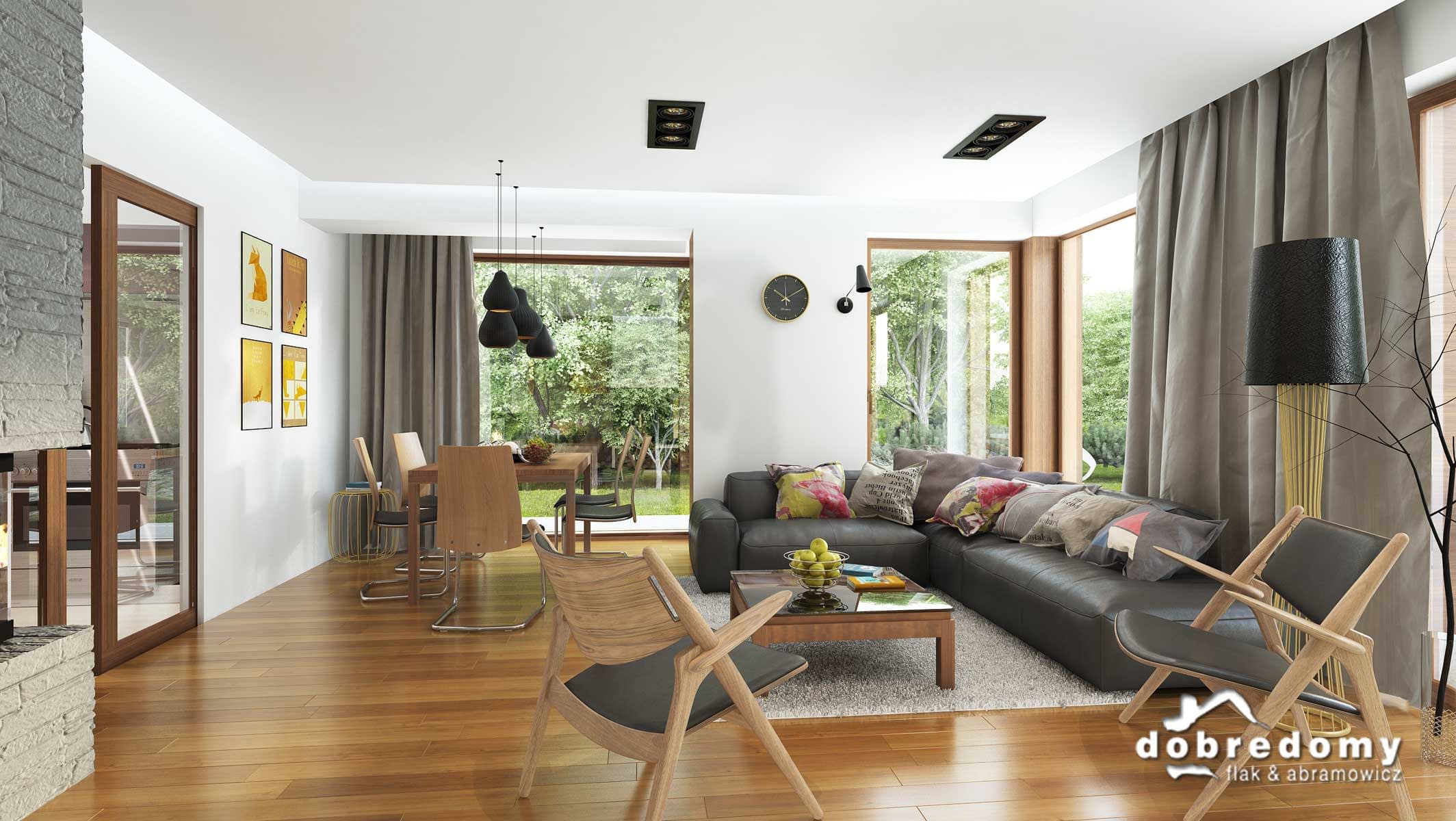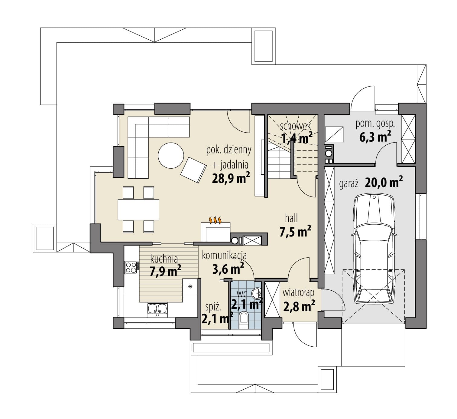Projekt jednorodzinnego domu parterowego z poddaszem użytkowym i garażem 1-stanowiskowym, przeznaczony dla rodziny 4-5-osobowej. Układ funkcjonalny parteru obejmuje strefę dzienną (salon połączony z jadalnią i osobna kuchnia) oraz gospodarczą (garaż i pom. gosp.). Dodatkowe pomieszczenia na tej kondygnacji to: spiżarnia, wc, schowek. Na poddaszu zlokalizowano strefę nocną (3 sypialnie i łazienka).