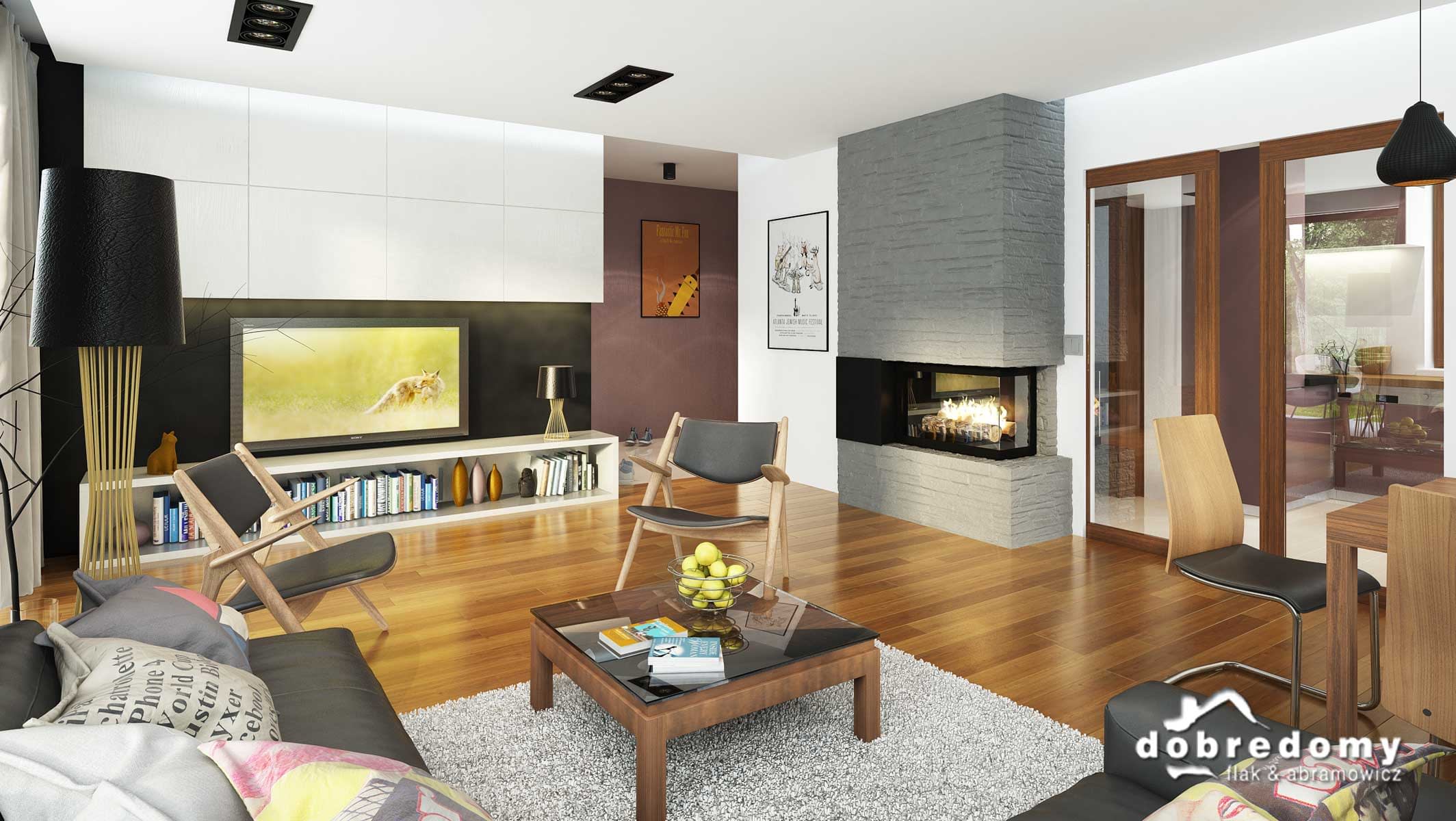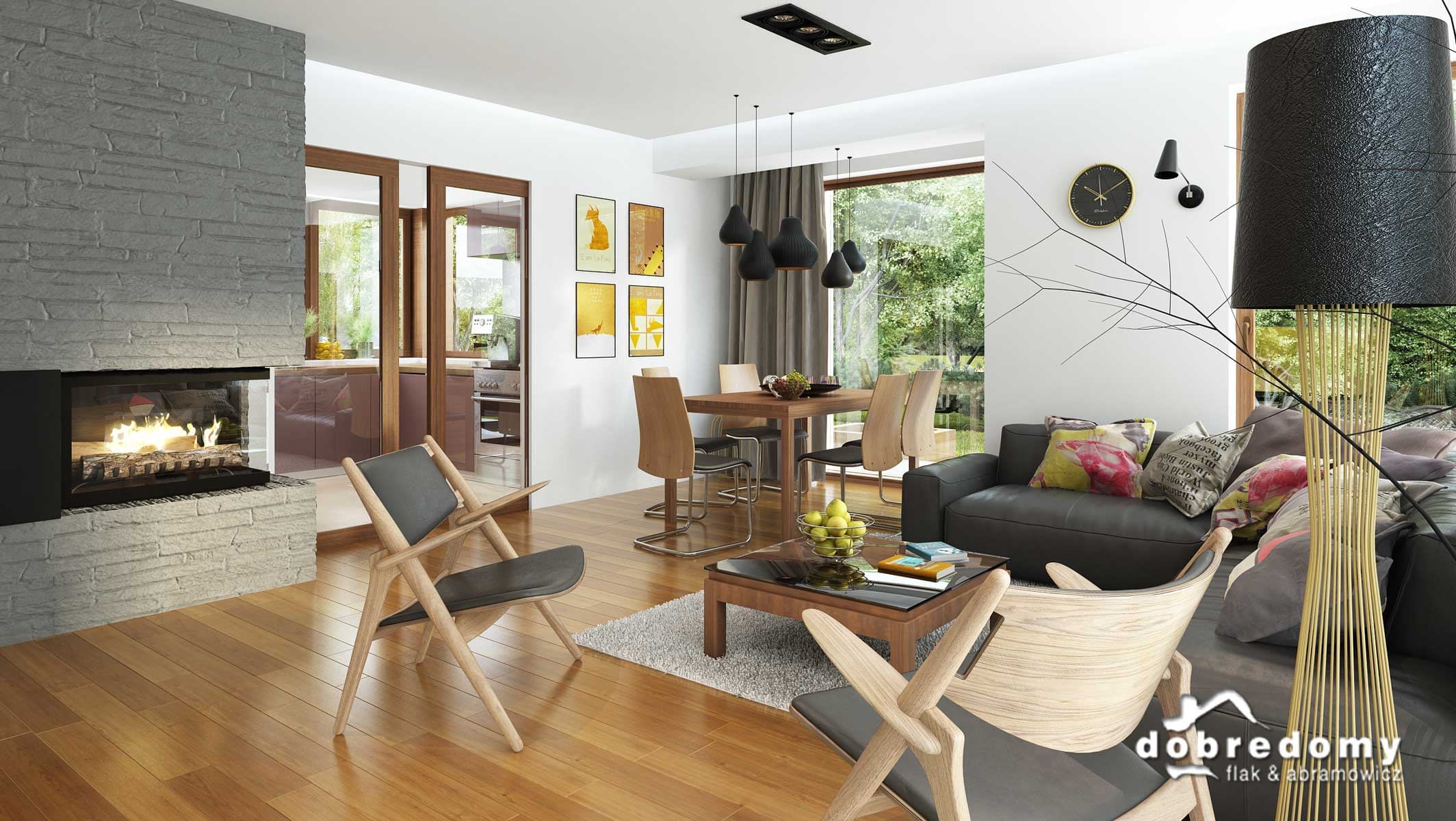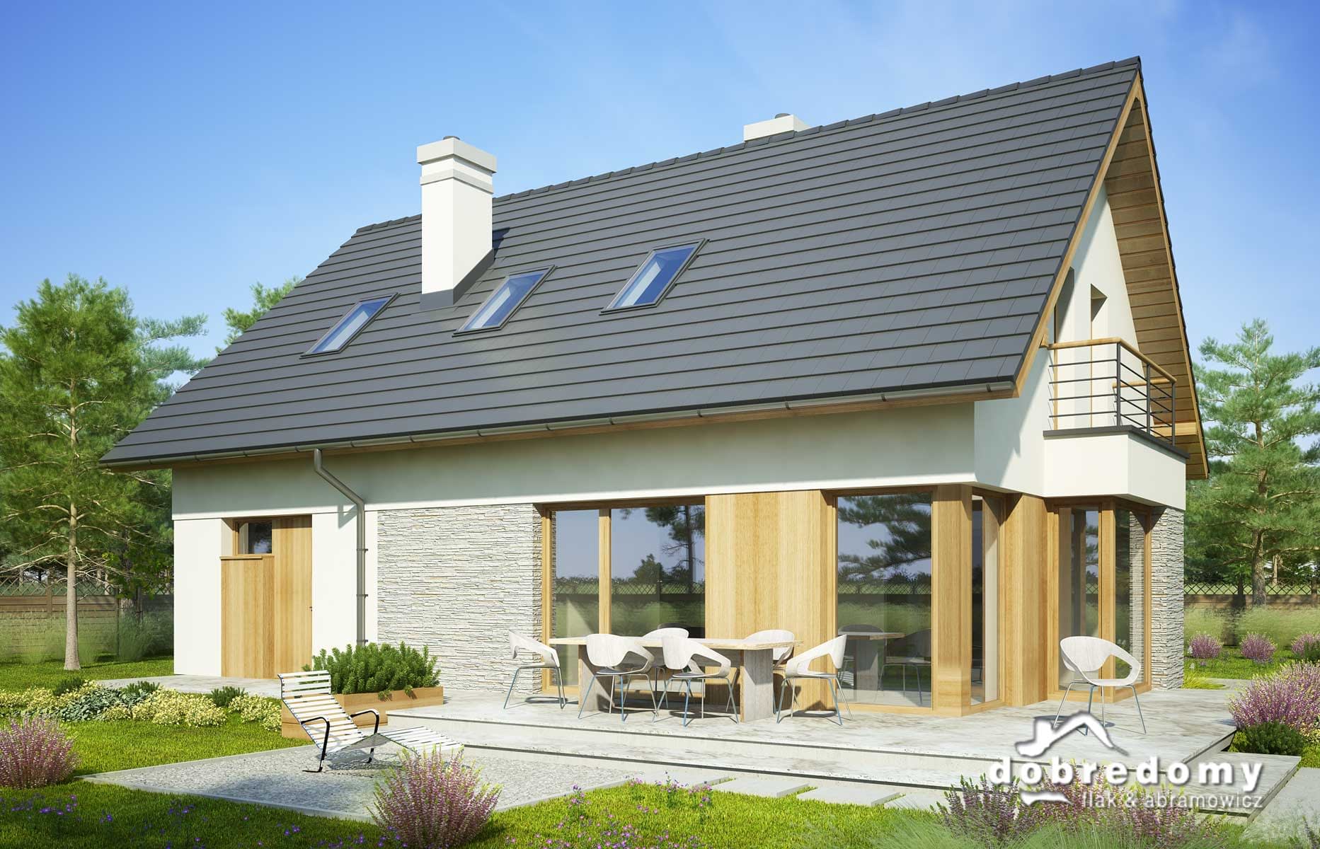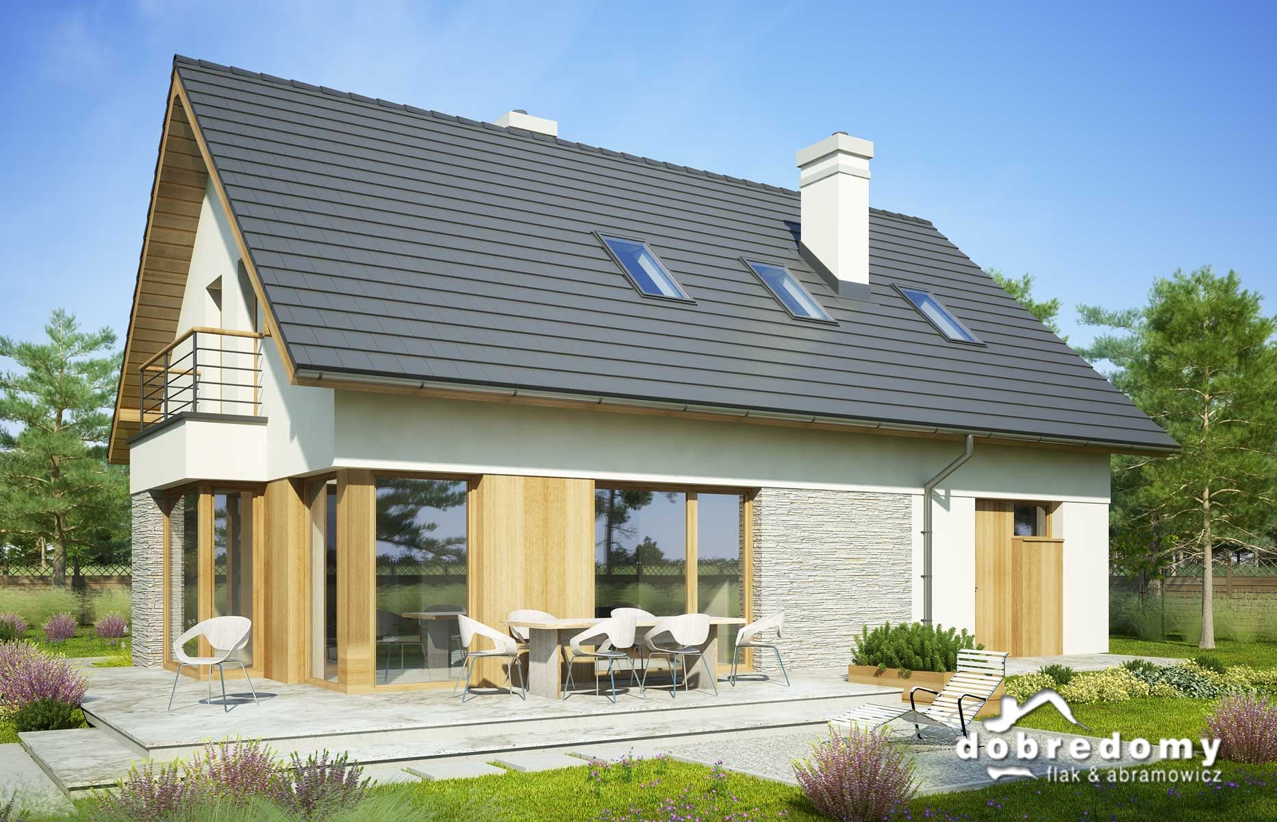 Elewacje pokryte tynkiem strukturalnym w systemie ociepleń Termo Organika, okładziną kamienną i drewnianą. W projekcie zastosowano okna dachowe marki FAKRO. Pokrycie dachu - dachówka ceramiczna lub cementowa CREATON.