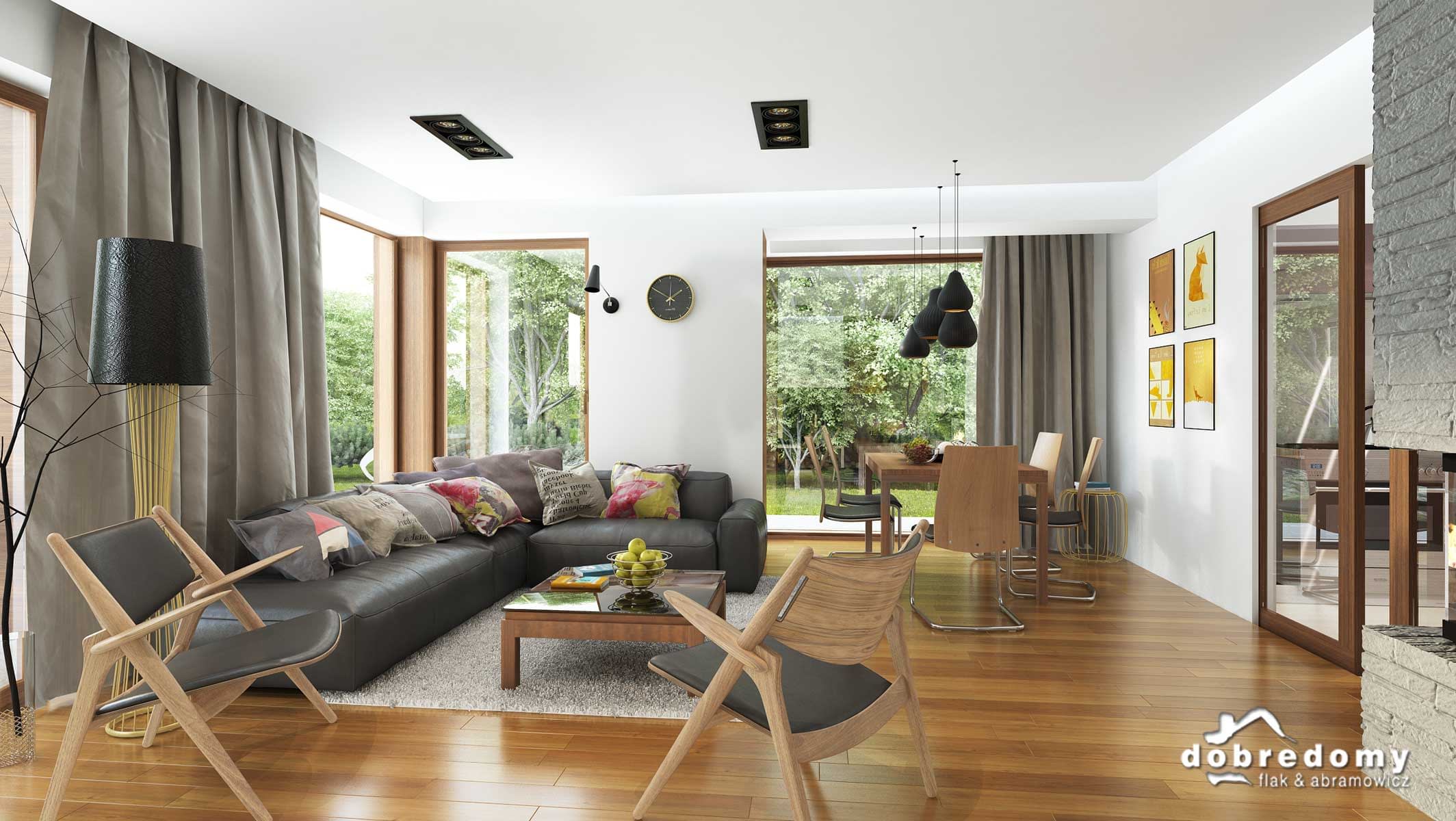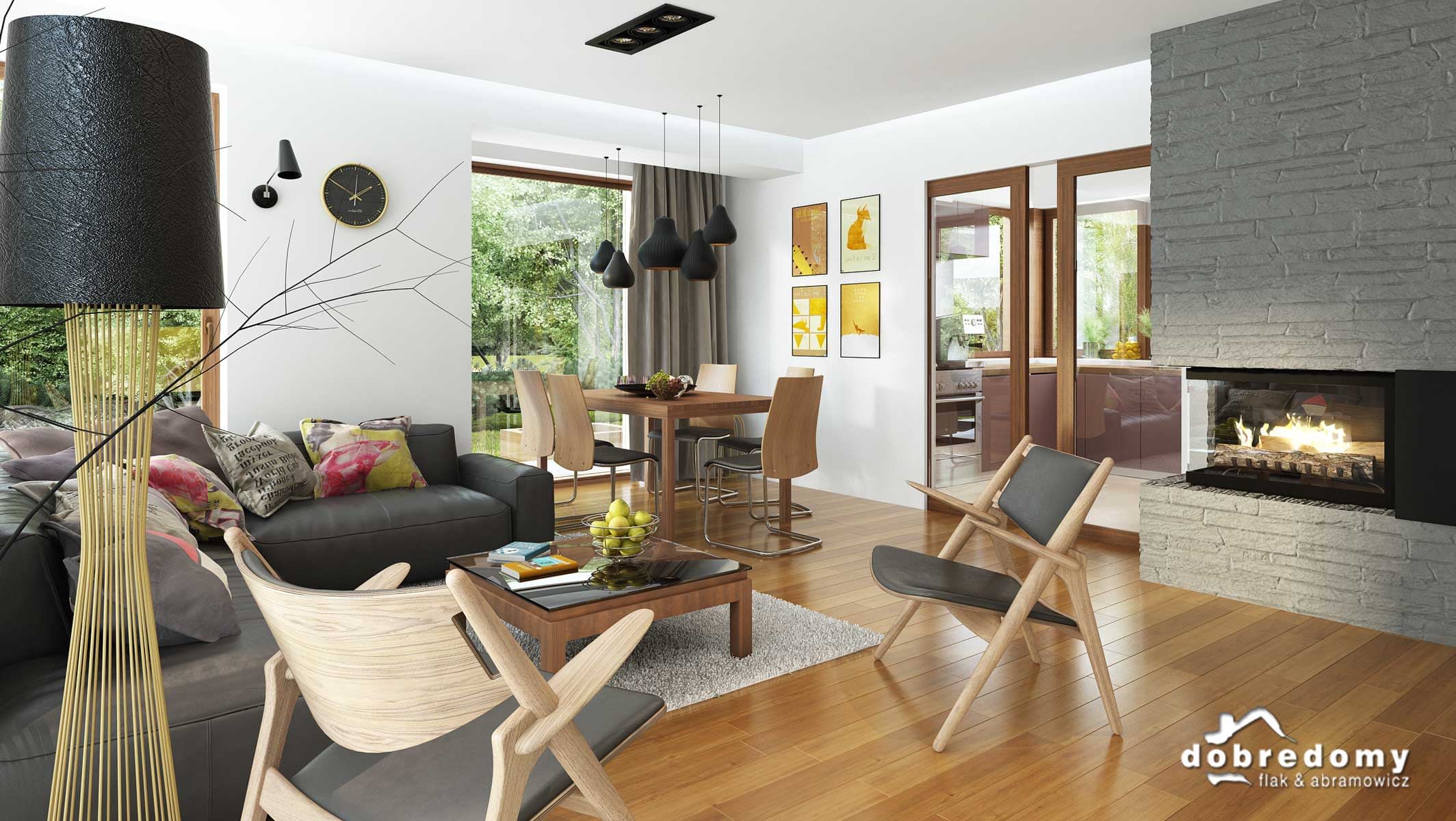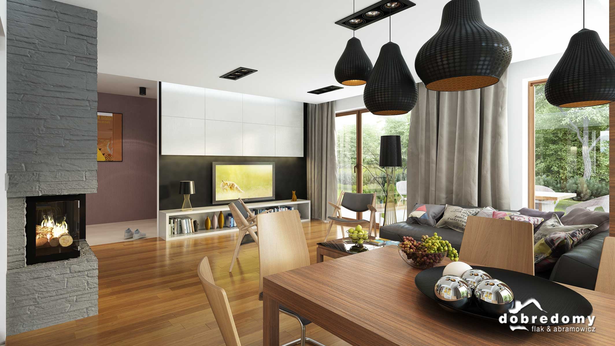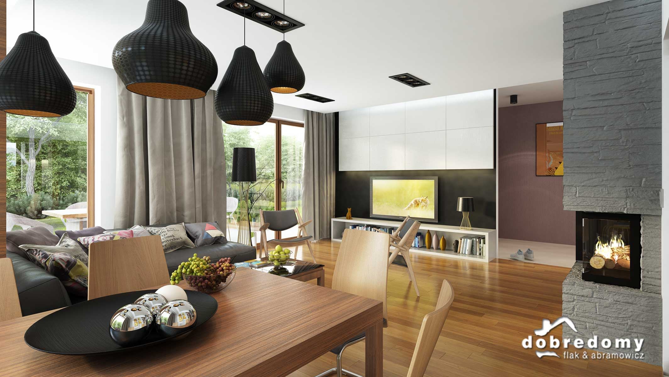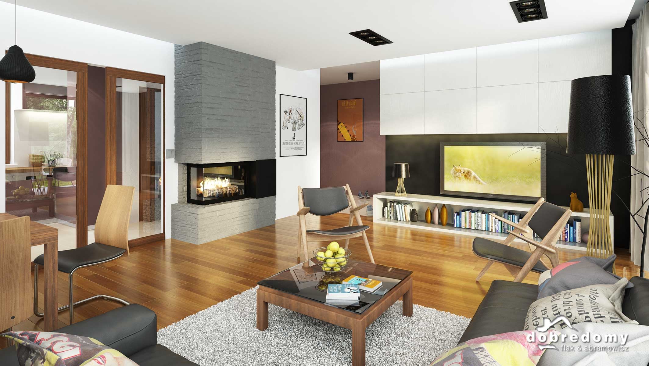 Elewacje pokryte tynkiem strukturalnym w systemie ociepleń Termo Organika, okładziną kamienną i drewnianą. W projekcie zastosowano okna dachowe marki FAKRO. Pokrycie dachu - dachówka ceramiczna lub cementowa CREATON.