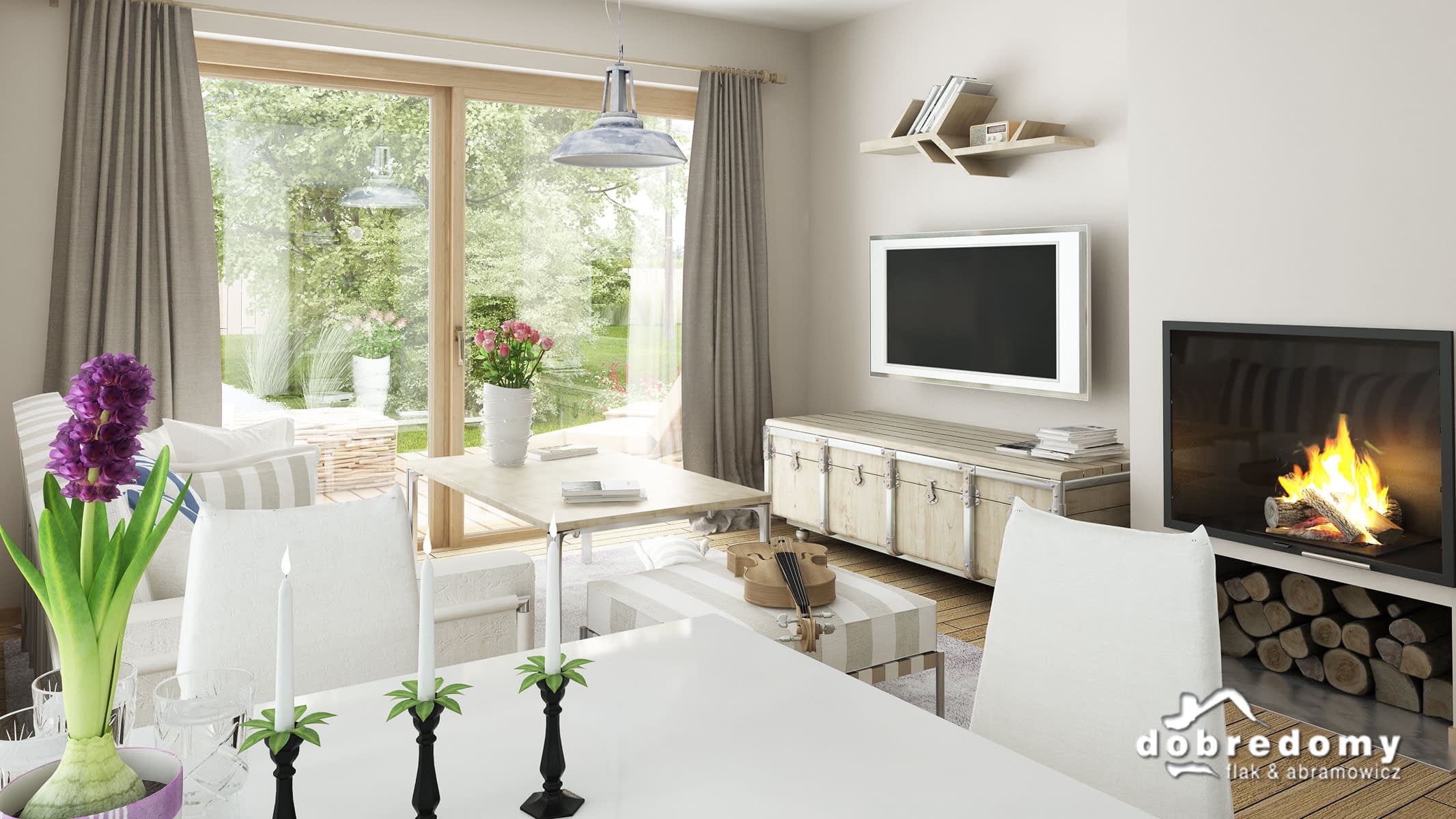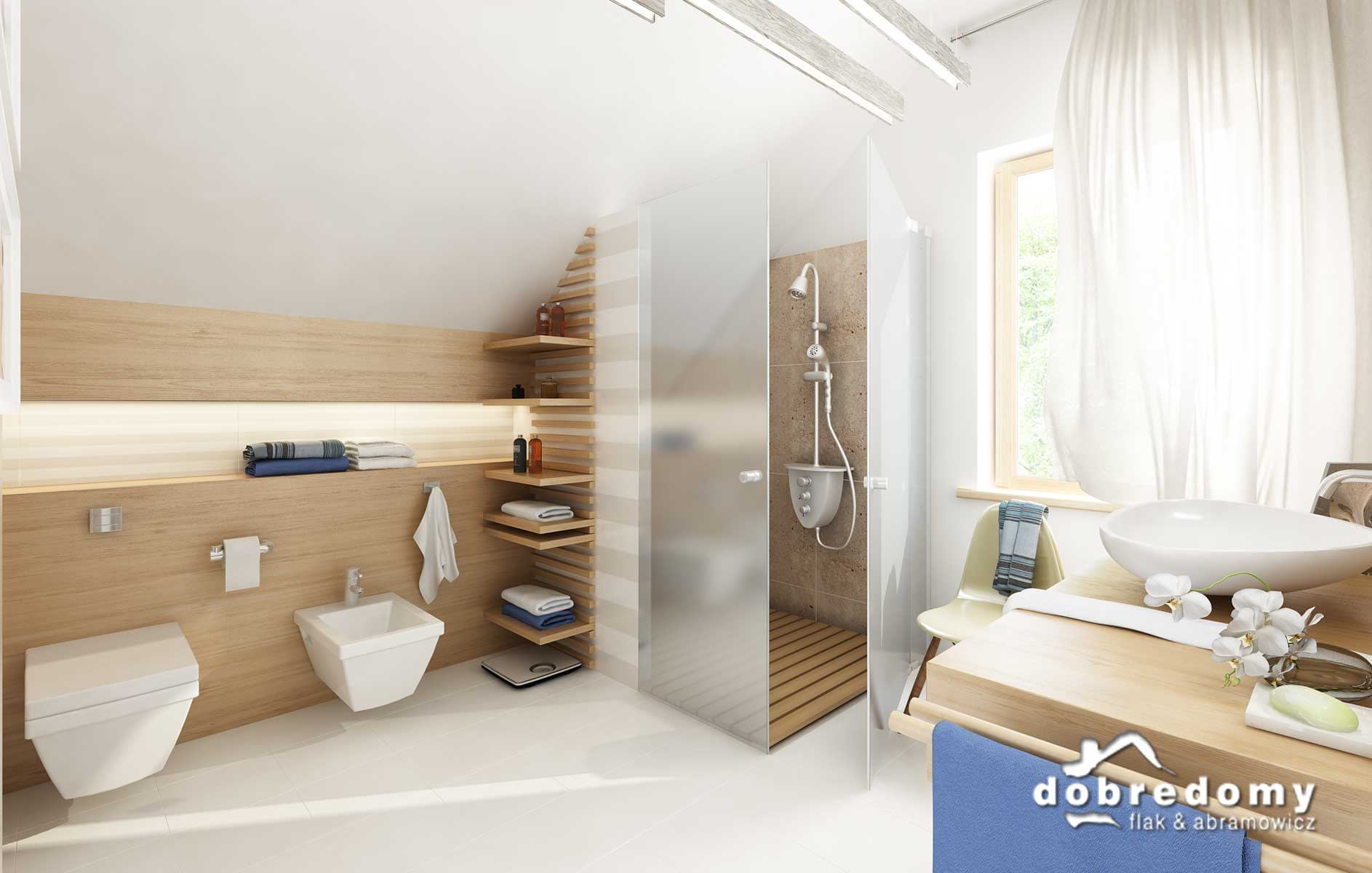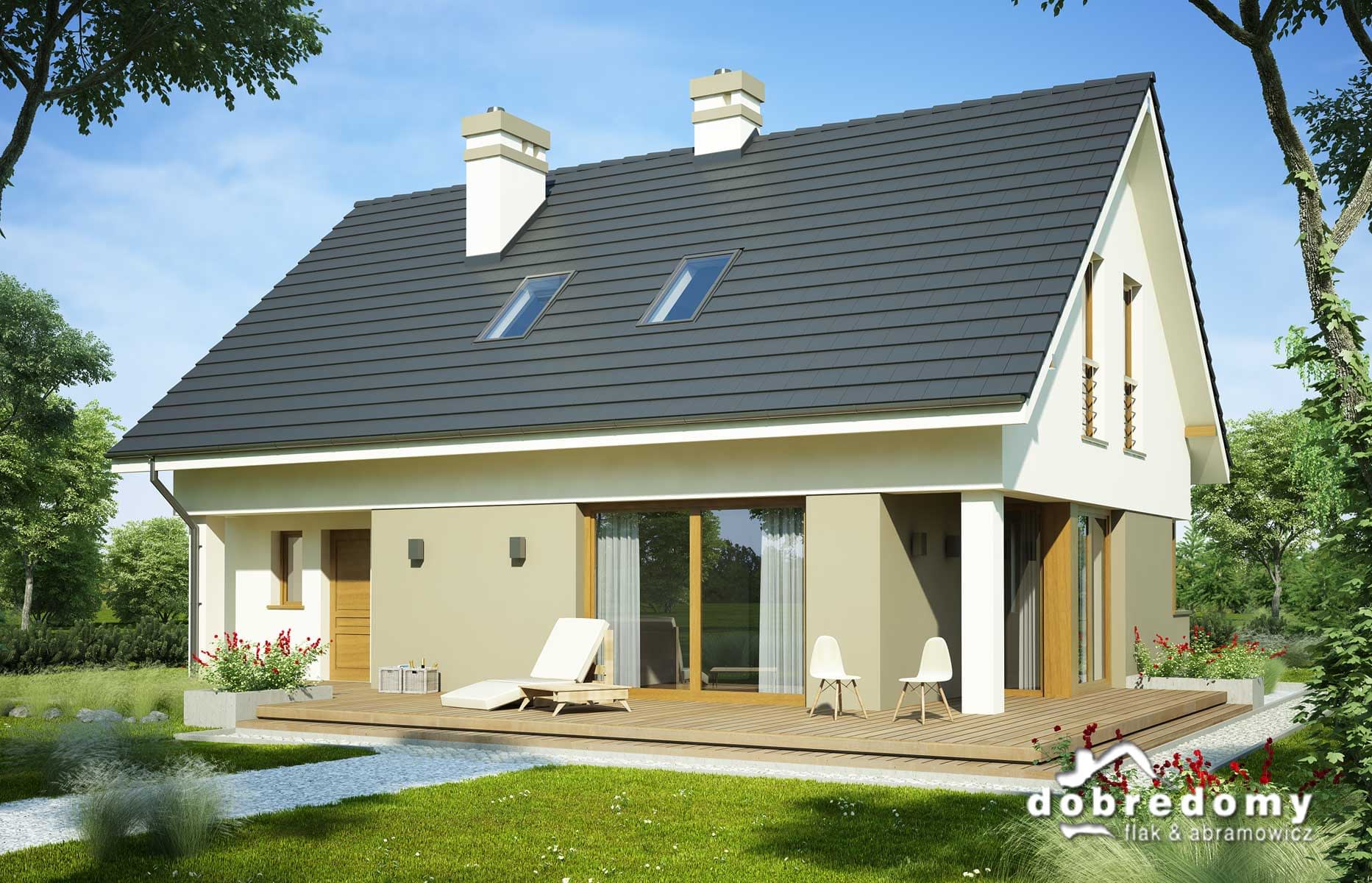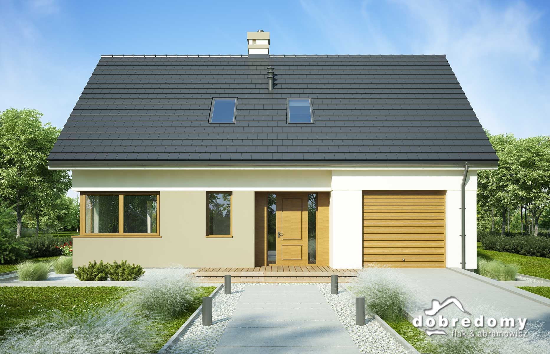 Elewacje pokryte tynkiem strukturalnym w systemie ociepleń Termo Organika. W projekcie zastosowano okna dachowe marki FAKRO. Pokrycie dachu - dachówka ceramiczna lub cementowa CREATON.
