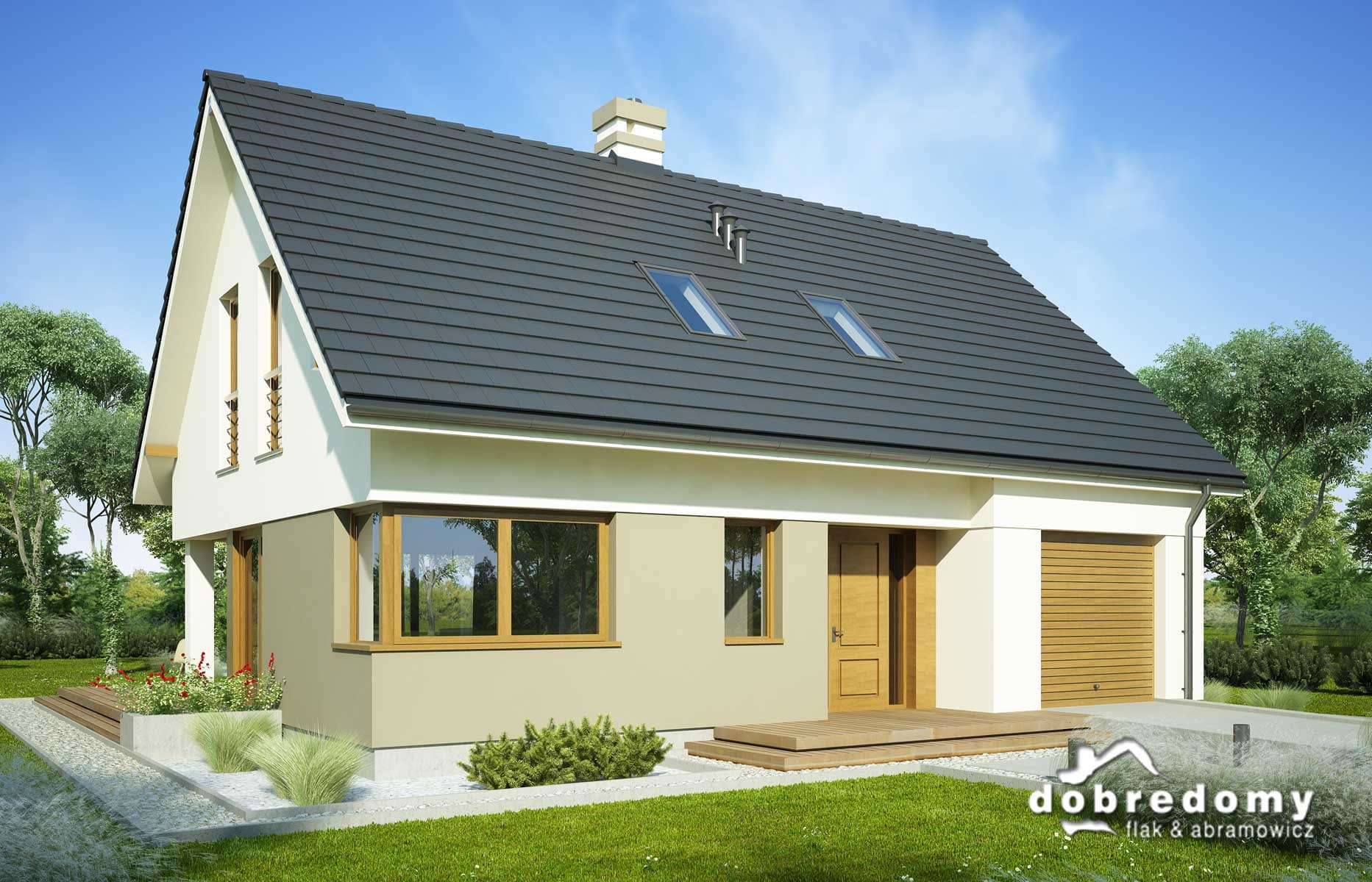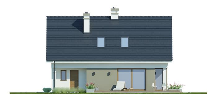 Nieduży dom z poddaszem użytkowym i garażem, zaprojektowany dla 4-osobowej rodziny. Na parterze znajdują się: salon połączony z jadalnią i kuchnią, spiżarnia, toaleta, garaż oraz kotłownia. Na poddaszu zaplanowano trzy sypialnie i łazienkę.