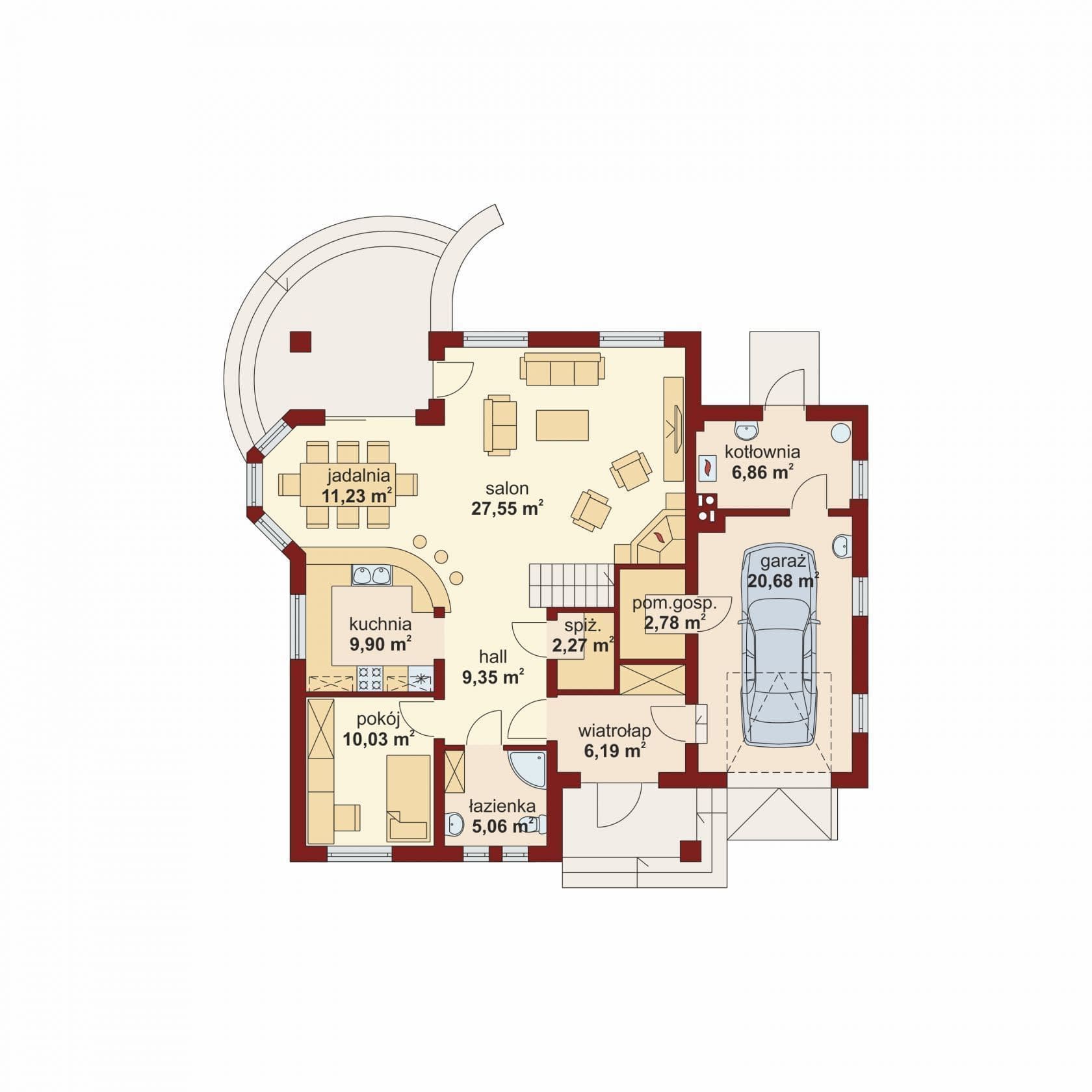 Dandys 1 to dom z tradycyjnej linii domów parterowych z użytkowym poddaszem, przeznaczony dla 4-5 osobowej rodziny. Na parterze, w części dziennej domu - znajduje się przestronny pokój dzienny otwarty na osadzoną w wykuszu jadalnię i oddzieloną barkiem kuchnię, funkcjonalna spiżarnia, dostępna bezpośrednio z przestrzeni holu łazienka oraz pokój który może pełnić także funkcje gabinetu. Znajdziemy tu również duży wiatrołap który umożliwia przejście do jednostanowiskowego garażu oraz pomieszczenie gospodarcze, pełniące także funkcję kotłowni. Powierzchnię parteru zwiększyć można kosztem rezygnacji z podcienia, a zwolennicy kuchni zamkniętych mają możliwość wydzielenia jej ściankami działowymi. Strefę nocną piętra tworzą wygodna dwuosobowa sypialnia z własną garderobą, dwa ustawne pokoje z niezależnymi balkonami oraz przestronna łazienka, pełniąca także funkcję pralni. Dodatkową powierzchnię użytkową na pokój hobby, bibliotekę czy sypialnię uzyskamy adaptując zlokalizowany nad garażem strych. Zwarta bryła, wykorzystanie elementów jak podcienie, lukarny, szprosy okienne oraz zastosowana ciepła kolorystyka sprawiają iż Dandys 1 to dom dla ludzi ceniących tradycyjny styl, praktyczne rozwiązania, klasyczną elegancję i przytulność.