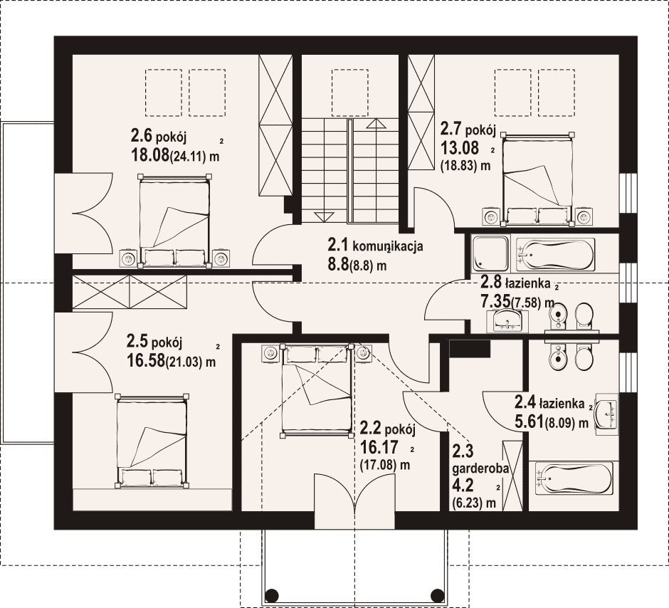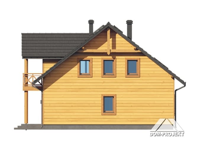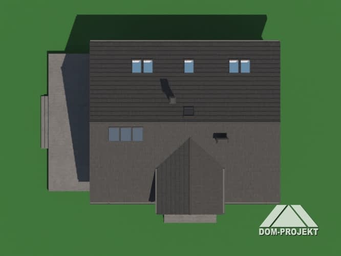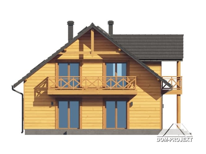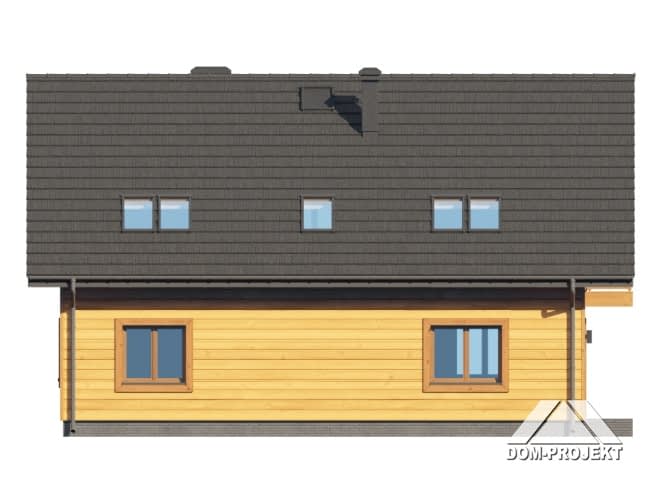 Dom w konstrukcji szkieletu drewnianego. Na parterze salon z aneksem kuchennym, kominkiem, wyjściem na taras i schodami na poddasze. Spiżarka, pokój, łazienka, kotłownia, wiatrołap, komunikacja. Na poddaszu cztery pokoje, dwie łazienki, garderoba, komunikacja. Dwa balkony. Zwarta bryła budynku oraz dach dwuspadowy sprzyjają szybkiej i taniej budowie oraz niskim kosztom eksploatacji.Rzuty