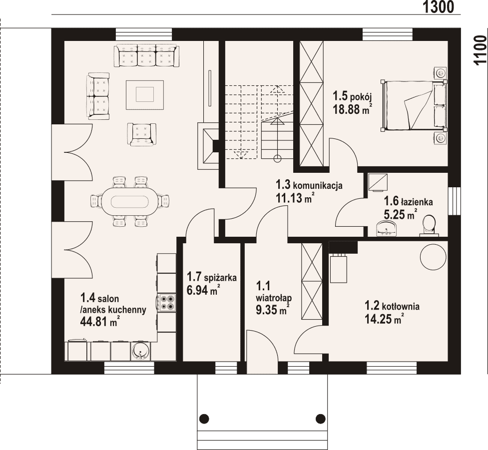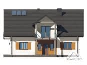 Dom z poddaszem użytkowym. Na parterze salon z aneksem kuchennym, kominkiem oraz wyjściami na taras. Pokój, komunikacja, łazienka, kotłownia, wiatrołap, spiżarka. Na poddaszu cztery pokoje (jeden z własną łazienką i garderobą), łazienka, komunikacja. Dwa balkony. Zwarta bryła budynku oraz dach dwuspadowy sprzyjają szybkiej i taniej budowie oraz niskim kosztom eksploatacji.Rzuty